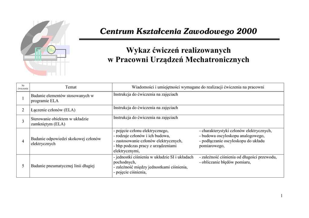 Wykaz ćwiczeń w pracowni urz¹dzeń mechatronicznych
