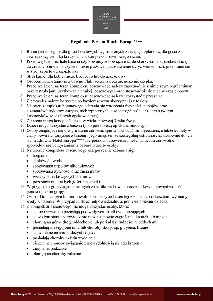 Regulamin Basenu Hotelu Europa**** 1. Basen jest dostępny dla gości hotelowych wg ustalonych z recepcją opłat oraz dla gości z zewnątrz wg cennika korzystania z kompleksu basenowego i saun. 2. Przed wejściem na halę basenu użytkownicy zobowiązani są do skorzystania z przebieralni, tj. do zmiany obuwia na czyste obuwie plażowe, pozostawienie okryć wierzchnich, przebranie się w strój kąpielowy/kąpielówki. 3. Strój kąpiel dla kobiet może być jedno lub dwuczęściowy. 4. Osobom korzystającym z basenu i/lub jacuzzi zaleca się noszenie czepka. 5. Przed wejściem na teren kompleksu basenowego należy zapoznać się z niniejszym regulaminem oraz instrukcjami użytkowania atrakcji basenowych oraz stosować się do nich w czasie pobytu. 6. Przed wejściem na teren kompleksu basenowego należy skorzystać z prysznica. 7. Z prysznica należy korzystać po każdorazowym skorzystaniu z toalety. 8. Na teren kompleksu basenowego zabrania się wnoszenia żywności, napojów oraz elementów/artykułów ostrych, niebezpiecznych, a w szczególności szklanych (w tym kosmetyków w szklanych opakowaniach). 9. Z basenu mogą korzystać dzieci w wieku powyżej 3 roku życia. 10. Dzieci mogą korzystać z basenu tylko pod opieką opiekuna prawnego. 11. Osoby znajdujące się w złym stanie zdrowia, sprawności bądź samopoczucia, a także kobiety w ciąży, powinny korzystać z basenu i jego urządzeń ze szczególną ostrożnością, stosownie do ich stanu zdrowia. Hotel Europa**** nie podnosi odpowiedzialności za skutki zdrowotne spowodowane korzystaniem z basenu przez te osoby. 12. Na terenie kompleksu basenowego kategorycznie zabrania się: biegania skoków do wody spożywania napojów alkoholowych spożywania żywności oraz żucia gumy wszczynania fałszywych alarmów pozostawiania małych gości bez opieki 13. W przypadku grup zorganizowanych za skutki zachowania uczestników odpowiedzialność ponosi opiekun grupy. 14. Osoba, która celowo lub mimowolnie zanieczyści basen będzie obciążona kosztami wymiany wody w basenie. W przypadku dzieci odpowiedzialność poniesie opiekun dziecka. 15. Z kompleksu basenowego nie mogą korzystać osoby, które: są nietrzeźwe lub pozostają pod wpływem środków odurzających są w złym stanie zdrowia, które może stanowić zagrożenie dla nich lub innych chorują na górne drogi oddechowe lub posiadają trudności w oddychaniu posiadają niezagojone rany lub choroby skóry, np. grzybica, liszaje są uczulane na środki dezynfekujące posiadają choroby układu wydalania cierpią na choroby związanie z niewydolnością układu krążenia cierpią na padaczkę chorują na choroby zakaźne REGULAMIN STREFY SAUN HOTELU EUROPA**** 1. 2. 3. 4. 5. 6. 7. 8. 9. 10. 11. 12. 13. 14. 15. 16. 17. 18. Prawo do samodzielnego korzystania ze strefy saun mają Klienci, którzy ukończyli 18 rok życia. Dzieci i osoby niepełnoletnie mogą korzystać ze strefy saun tylko pod opieką rodziców. Klienci zobowiązani są do zapoznania się z zasadami metodycznymi korzystania ze strefy saun oraz instrukcją obsługi. Wejście do strefy saun dozwolone jest wyłącznie w odpowiednim i czystym obuwiuklapkach. Każdy klient otrzyma ręcznik do korzystania z kompleksu basenowego oraz strefy saun. Sauny powinny być wykorzystywane zgodnie z ich przeznaczeniem, wyłącznie jako forma odnowy biologicznej. Nie wolno niszczyć wyposażenia i zanieczyszczać kabiny saun oraz natrysków. Obsługa Hotelu Europa**** ma prawo i obowiązek kontroli czystości i sprawności urządzeń saun w każdej chwili, nawet w czasie korzystania przez Klientów. Zabrania się wnoszenia do saun ostrych przedmiotów, własnego sprzętu, spożywania napojów alkoholowych oraz posiłków. Podczas pobytu w Saunie Klient jest zobowiązany do stosownego, kulturalnego zachowania. Klienci, których stan wskazuje na spożycie alkoholu, środków odurzających i dopingowych, będą wypraszani ze strefy saun i kompleksu basenowego. Korzystanie z sauny po obfitym posiłku nie jest wskazane. Przed wejściem do sauny należy zdjąć wszystkie przedmioty metalowe, gdyż mogą stać się przyczyną poparzenia ciała. Kąpiel w saunie suchej rozpoczyna się od ław niskich stopniowo przechodząc na wyższe (w zależności od samopoczucia na ławach można leżeć lub siedzieć). W celu przystosowania organizmu do prawidłowego funkcjonowania w pozycji stojącej wskazane jest w ostatnich 2-3 minutach przebywania w saunie, przyjęcie pozycji siedzącej z opuszczonymi nogami. Stosować stopniowe ochłodzenie organizmu, gdyż gwałtowne ochłodzenie ciała jest szkodliwe. Po saunie należy wypocząć 20-30 minut. Celowe jest picie w umiarkowanych ilościach (ok. 0,5-1l.) wód mineralnych lub soków. W czasie i po zabiegu w saunie przeciwwskazane jest podejmowanie wysiłku fizycznego. Przestrzeganie regulaminu pozwoli na sprawną realizację programu i obsługę naszych Klientów oraz zachowanie przyjemnej relaksującej atmosfery. Dyrekcja Hotelu Europa****