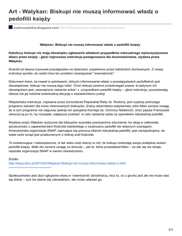 Art - Watykan: Biskupi nie muszą informować władz o pedofilii księży madroscpiekla.blogspot.com /2016/05/art-watykan-biskupi-nie-musza.html Watykan: Biskupi nie muszą informować władz o pedofilii księży Katoliccy biskupi nie mają obowiązku zgłaszania władzom przypadków seksualnego wykorzystywania dzieci przez księży - głosi najnowsza instrukcja postępowania dla duchowieństwa, wydana przez Watykan. Kościół od dawna tuszował przestępstwa na dzieciach, popełnione przez katolickich duchownych. Z nowej instrukcji wynika, że nadal chce ten problem rozwiązywać ''wewnętrznie''. Dokument mówi, że nawet w państwach, których informowanie władz o przestępstwach pedofilskich jest obowiązkowe, biskupi nie muszą tego robić. Choć biskupi powinni przestrzegać prawa, to jedynym ich obowiązkiem jest „wewnętrzne radzenie sobie” z przypadkami pedofilii księży – głosi instrukcja, pozostawiają ofierze lub jej rodzinie ewentualną decyzję o zawiadomieniu policji. Watykańska instrukcja, napisana przez konsultanta Papieskiej Rady ds. Rodziny, jest częścią szerszego programu szkoleń dla nowo mianowanych biskupów. Znany dziennikarz-watykanista John Allen zwraca uwagę, że w tym programie nie odgrywa żadnej roli specjalna Komisja ds. Ochrony Nieletnich, choć papież Franciszek utworzył ją po to, by rozwijała „najlepsze praktyki” w celu radzenia sobie ze zjawiskiem klerykalnej pedofilii. Wydane przez Watykan wytyczne dla biskupów wywołały powszechne zdumienie, bo stoją w całkowitej sprzeczności z zapewnieniami Kościoła katolickiego o zwalczaniu pedofilii we własnych szeregach. Amerykańska organizacja SNAP, zajmująca się pomocą ofiarom klerykalnej pedofilii, jest zaniepokojona, że wiele osób wciąż jest przekonanych o dobrej woli Kościoła. To bulwersujące i niebezpieczne, iż tak wielu ludzi wierzy w mit, że biskupi zmieniają swoje podejście wobec pedofilii księży. Mało kto zwraca uwagę na dowody – jak te, które przedstawił Allen – że tak się nie dzieje, napisała organizacja SNAP w swoim oświadczeniu. Źródło: http://kkpp.blox.pl/2016/02/Watykan-Biskupi-nie-musza-informowac-wladz-o.html --------------------------------------Społeczeństwo jest zbyt ogłupione wiarą w ‘nawrócenie’ zbrodniarzy, lecz to, co z gruntu jest złe nie może stać się dobre – żyd nie stanie się człowiekiem, ale może udawać go. 1/1