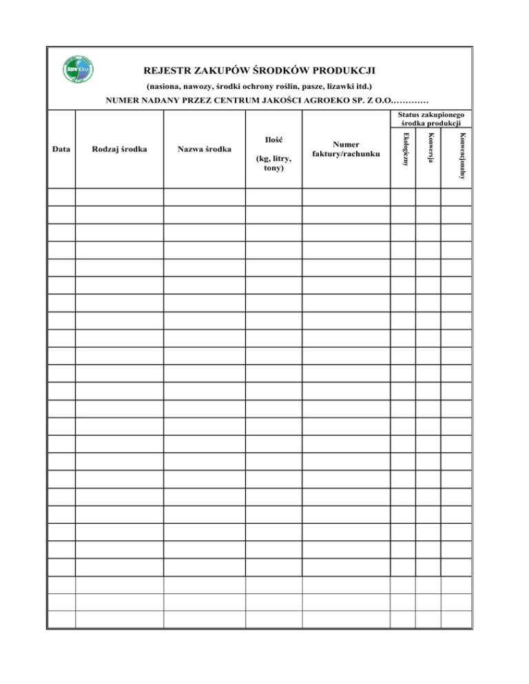 REJESTR ZAKUPÓW ŚRODKÓW PRODUKCJI (nasiona, nawozy, środki ochrony roślin, pasze, lizawki itd.) NUMER NADANY PRZEZ CENTRUM JAKOŚCI AGROEKO SP. Z O.O.………… Status zakupionego środka produkcji (kg, litry, tony) Numer faktury/rachunku Konwencjonalny Nazwa środka Konwersja Rodzaj środka Ekologiczny Ilość Data