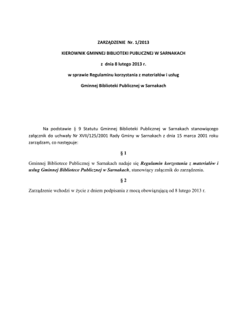 ZARZĄDZENIE Nr. 1/2013 KIEROWNIK GMINNEJ BIBLIOTEKI PUBLICZNEJ W SARNAKACH z dnia 8 lutego 2013 r. w sprawie Regulaminu korzystania z materiałów i usług Gminnej Biblioteki Publicznej w Sarnakach Na podstawie § 9 Statutu Gminnej Biblioteki Publicznej w Sarnakach stanowiącego załącznik do uchwały Nr XVII/125/2001 Rady Gminy w Sarnakach z dnia 15 marca 2001 roku zarządzam, co następuje: §1 Gminnej Bibliotece Publicznej w Sarnakach nadaje się Regulamin korzystania z materiałów i usług Gminnej Bibliotece Publicznej w Sarnakach, stanowiący załącznik do zarządzenia. §2 Zarządzenie wchodzi w życie z dniem podpisania z mocą obowiązującą od 8 lutego 2013 r. REGULAMIN KORZYSTANIA Z MATERIAŁÓW I USŁUG GMINNEJ BIBLIOTEKI PUBLICZNEJ W SARNAKACH Rozdział I. Postanowienia ogólne § 1. 1. Regulamin korzystania z materiałów i usług Gminnej Biblioteki Publicznej w Sarnakach zwany dalej Regulaminem określa warunki i zasady korzystania z materiałów i usług Gminnej Biblioteki Publicznej w Sarnakach, zwanej dalej Biblioteką. 2. Postanowienia Regulaminu dotyczą wszystkich Użytkowników korzystających z materiałów i usług Biblioteki. 3.Każdy Użytkownik powinien zapoznać się z treścią Regulaminu i przestrzegać jego postanowień. 4. Oświadczenie o zapoznaniu się z treścią Regulaminu Użytkownik składa na karcie zapisu. Rozdział II. Prawa i obowiązki Użytkowników Biblioteki. § 2. 1. Użytkownicy mają prawo do bezpłatnego: 1. Wypożyczania materiałów bibliotecznych na warunkach określonych w Regulaminie, 2. Korzystania z księgozbioru podręcznego, 3. Korzystania z komputerów znajdujących się w Bibliotece (poza stanowiskami roboczymi), w tym z dostępu do Internetu, 4. Korzystania z porad i pomocy pracowników Biblioteki. § 3. 1. Użytkownicy mają obowiązek: 1. Przestrzegać zasad korzystania z materiałów i usług bibliotecznych określonych Regulaminem, 2. Dbać o powierzone materiały biblioteczne, chronić je przed uszkodzeniem, zniszczeniem, nie udostępniać ich osobom trzecim, 3. Zwracać uwagę na stan materiałów przed ich wypożyczeniem i zauważone uszkodzenia zgłosić bibliotekarce, 4. Poinformować bibliotekę o zmianie adresu, 5. Zachowywać ciszę w pomieszczeniach bibliotecznych, 6. Nie palić, 7. Nie jeść i nie pić wniesionych produktów spożywczych przy korzystaniu z materiałów bibliotecznych i komputerów. Rozdział III. Zasady udostępniania materiałów bibliotecznych. § 4. 1. Z materiałów i usług Biblioteki mogą korzystać wszyscy. 2. Przy zapisie zgłaszający się powinien okazać dokument tożsamości i wypełnić kartę zapisu. Administratorem danych osobowych jest kierownik Biblioteki. Dane wykorzystywane będą w celu zapewnienia ochrony zbiorów, dochodzenia ewentualnych roszczeń i prowadzenia bieżącej statystyki bibliotecznej. Biblioteka jest uprawniona do przetwarzania danych osobowych na podstawie ustawy o bibliotekach z dnia 27 czerwca 1997 r. 3. Za niepełnoletniego Użytkownika odpowiadają rodzice lub opiekunowie prawni. 4. Użytkownik nie będący zarejestrowanym czytelnikiem Biblioteki może korzystać z jej usług (poza wypożyczaniem materiałów bibliotecznych) po okazaniu dowodu tożsamości i odnotowaniu danych osobowych w specjalnym rejestrze. § 5. 1. Użytkownik może wypożyczyć jednocześnie: 1. 5 woluminów książek, 2. 5 tytułów filmów, 3. 5 tytułów czasopism, z wyłączeniem ostatniego numeru. 2. Liczba wypożyczonych egzemplarzy może być zwiększona za zgodą kierownik Biblioteki w następujących wypadkach: 1. Użytkownik jest stałym czytelnikiem regularnie zwracającym wypożyczone materiały biblioteczne, 2. Stan zdrowia Użytkownika nie pozwala mu na częste odwiedziny w Bibliotece, 3. Użytkownik potrzebuje większej ilości materiałów do celów naukowych (pisanie prac dyplomowych, licencjackich, itp., egzaminy w szkole i na studiach). 3. Książki i inne materiały biblioteczne wypożycza się na okres 30 dni. 4. Biblioteka może przesunąć termin zwrotu materiałów bibliotecznych, jeżeli nie ma na nią zapotrzebowania ze strony innych czytelników lub zachodzą okoliczności opisane w punkcie 2. 5. Na prośbę Użytkownika bibliotekarka może rezerwować książki i inne materiały biblioteczne aktualnie wypożyczone. 6. Z księgozbioru podręcznego oraz ostatnich numerów czasopism korzysta się tylko na miejscu, w wyjątkowych wypadkach bibliotekarka może je wypożyczyć, ale na bardzo krótki termin. 7. Wybrane materiały biblioteczne Użytkownik rejestruje u dyżurującej bibliotekarki. Jej też zwraca wypożyczone. § 6. 1. Za szkody wynikłe z zagubienia, uszkodzenia lub zniszczenia wypożyczonych materiałów bibliotecznych odpowiada Użytkownik. Wysokość odszkodowania ustala kierownik Biblioteki. Użytkownik może dostarczyć, za zgodą kierownika Biblioteki, zamiast zniszczonej lub zagubionej inną książkę przydatną Bibliotece. 2. Użytkownik, który otrzymał upomnienia pokrywa jego koszty. 3. Biblioteka zastrzega sobie prawo dochodzenia swoich wierzytelności na drodze sądowej wobec Użytkowników, którzy dobrowolnie nie zwrócili materiałów bibliotecznych oraz uregulowania należnych Bibliotece wierzytelności. 4. Do czasu zwrotu wypożyczonych i niezwróconych materiałów bibliotecznych oraz uregulowania należnych Bibliotece wierzytelności Użytkownik traci prawo do korzystania z usług Biblioteki. 5. W uzasadnionych wypadkach losowych Biblioteka może zaniechać dochodzenia od Użytkownika wierzytelności. Rozdział IV. Usługi reprograficzne. § 7. 1. Korzystanie z usług i materiałów biblioteki jest bezpłatne poza usługami reprograficznymi, za które Użytkownik wnosi opłatę. 2. Wysokość opłat za usługi reprograficzne określa załącznik do Regulaminu. 3. Pracownik Biblioteki trzydzieści minut przed zamknięciem Biblioteki może odmówić realizacji usług reprograficznych. 4. Kopiowanie materiałów biblioteczny