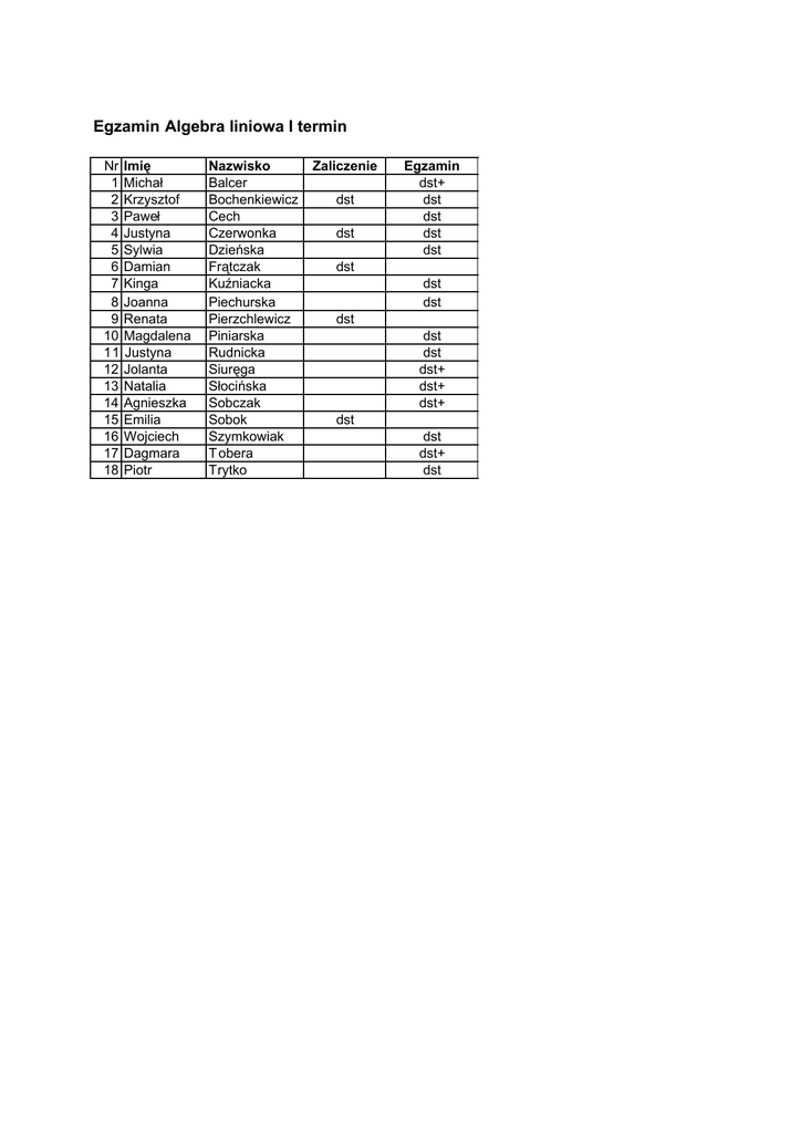 Egzamin Algebra liniowa I termin Nr Imię 1 Michał 2 Krzysztof 3 Paweł 4 Justyna 5 Sylwia 6 Damian 7 Kinga 8 Joanna 9 Renata 10 Magdalena 11 Justyna 12 Jolanta 13 Natalia 14 Agnieszka 15 Emilia 16 Wojciech 17 Dagmara 18 Piotr Nazwisko Balcer Bochenkiewicz Cech Czerwonka Dzieńska Frątczak Kuźniacka Piechurska Pierzchlewicz Piniarska Rudnicka Siuręga Słocińska Sobczak Sobok Szymkowiak T obera Trytko Zaliczenie dst dst Egzamin dst+ dst dst dst dst dst dst dst dst dst dst dst+ dst+ dst+ dst dst dst+ dst