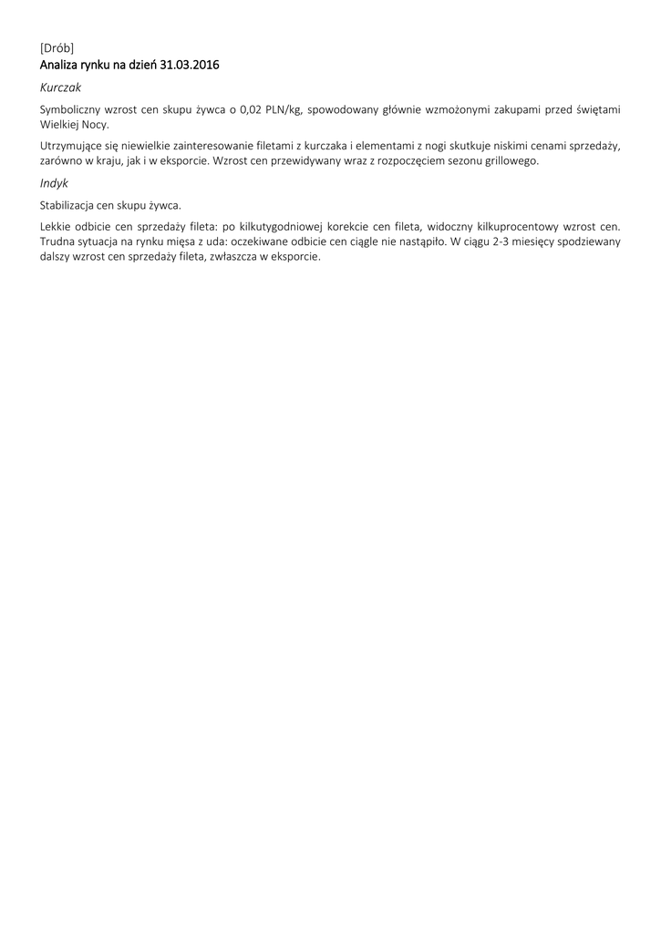 [Drób] Analiza rynku na dzień 31.03.2016 Kurczak Symboliczny wzrost cen skupu żywca o 0,02 PLN/kg, spowodowany głównie wzmożonymi zakupami przed świętami Wielkiej Nocy. Utrzymujące się niewielkie zainteresowanie filetami z kurczaka i elementami z nogi skutkuje niskimi cenami sprzedaży, zarówno w kraju, jak i w eksporcie. Wzrost cen przewidywany wraz z rozpoczęciem sezonu grillowego. Indyk Stabilizacja cen skupu żywca. Lekkie odbicie cen sprzedaży fileta: po kilkutygodniowej korekcie cen fileta, widoczny kilkuprocentowy wzrost cen. Trudna sytuacja na rynku mięsa z uda: oczekiwane odbicie cen ciągle nie nastąpiło. W ciągu 2-3 miesięcy spodziewany dalszy wzrost cen sprzedaży fileta, zwłaszcza w eksporcie.