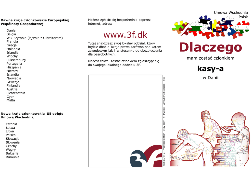 Dania Belgia Wlk.Brytania (lącznie z Gibraltarem) Francja Grecja Holandia Irlandia Włochy Luksemburg Portugalia Hiszpania Niemcy Islandia Norwegia Szwecja Finlandia Austria Lichtenstein Cypr Malta Nowe kraje członkowskie UE objęte Umową Wschodnią Estonia Łotwa Litwa Polska Słowacja Słowenia Czechy Węgry Bułgaria Rumunia Możesz zgłosić się bezpośrednio poprzez internet, adres: www.3f.dk Dlaczego Tutaj znajdziesz swój lokalny oddział, który będzie dbać o Twoje prawa zarówno pod kątem zawodowym jak i w stosunku do ubezpieczenia dla bezrobotnych. mam zostać członkiem Możesz także zostać członkiem zgłaszając się do swojego lokalnego oddzialu 3F. kasy-a Item nr. 101-4 - 1th revised edition - May 2007 - 3F-trykkeri - Layout: Pia Fransson - 3FA Dawne kraje członkowskie Europejskiej Wspólnoty Gospodarczej Umowa Wschodnia Polsk w Danii Dlaczego mam zostać członkiem kasy-a w Danii W Danii ubezpieczenie na wypadek bezrobocia jest dobrowolne, dlatego musisz się sam zgłosić. Jeśli pracujesz w zawodowym obszarze Fagligt Faelles Forbund (3F), możesz zostać przyjęty do Faglig Faelles Akasse (3FA). 1. Zliczanie okresów zatrudnienia W myśl przepisów dla wędrujących robotników w UE możesz zliczać okresy zatrudnienia i ubezpieczenia w celu uzyskania uprawnień socjalnych we wszystkich krajach UE. Ze względu na Twoje możliwości uzyskania uprawnień socjalnych po powrocie do swojego kraju lub innego kraju UE, korzystne jest zatem ubezpieczenie się przez Ciebie w czasie Twojego pobytu w Danii. W Danii uzyskuje się zwykłe prawo do zasiłku w okresie pozostawania bez pracy po jednorocznym nieprzerwanym okresie bycia członkiem kasy dla bezrobotnych oraz zatrudnieniu przez 1924 godziny (1 rok) w okresie członkowskim. Dodatkowym warunkiem jest to, że musisz szukać pracy oraz być do dyspozycji duńskiego rynku pracy.Sa to normalnie obowiązujące przepisy. 5 dobrych powodów, aby zostać członkiem 3FA 1 Możesz wliczyć swój okres zatrudnienia w Danii, aby uzyskać socjalne uprawnienia w swoim kraju ojczystym. 2 Możesz wliczyć swój okres Możesz uzyskać prawo do zasiłku po 12 miesiącach zatrudnienia. 3 Jeśli masz prawo do zasiłku, możesz otrzymywać duński zasiłek podczas szukania pracy w innym kraju UE przez okres 3 miesięcy. 4 Jeśli zmieni się podstawa Twojego pobytu, możesz uzyskać prawo do zasiłku w ciągu 12 miesięcy zatrudnienia. 5 Możesz użyć swoje okresy ubezpieczenia z innych krajów Europejskiej Wspólnoty Gospodarczej w celu uzyskania zasiłku w Danii. Dla obywateli nowych krajów członkowskich UE istnieją jednak zaostrzone warunki uzyskania prawa do zasiłku w Danii. 12 34 5 2. Prawo do zasiłku (Umowa Wschodnia) Po 12 miesiącach nieprzerwanego zatrudnienia uzyskasz prawo do wypłaty duńskiego zasiłku. Warunkiem uzyskania zasiłku jest jednak to, że sam nie możesz być winny zwolnienia z pracy. Jeśli raz uzyskasz takie prawo, będzie ono już obowiązywać na przyszłość – także w wypadku, jeśli wyjechałeś ewentualnie na krótki okres do swojego kraju i wróciłeś do Danii. W przypadku kolejnego okresu bez pracy (bezrobocia) obowiązują te same przepisy, jakie obejmują Duńczyków i innych obywateli UE. 3. Zasiłek podczas poszukiwania pracy Będąc objętym zwykłymi przepisami, możesz jak każdy inny obywatel UE otrzymywać zasiłek podczas poszukiwania pracy, jeśli jesteś bez pracy od 4 tygodni. W przypadku, gdy wrócisz do swojego ojczystego kraju, możesz uzyskać to prawo po 1-tygodniowym okresie bezrobocia. 4. Zasiłek w ciągu 12 miesięcy Jeśli zmieni się podstawa Twojego pobytu w Danii – na przykład z powodu ślubu, lub przyjazdu rodziny lub złagodzenia przepisów, możesz uzyskać uprawnienia do zasiłku bez obowiązku 12 miesięcznego nieprzerwanego zatrudnienia. 5. Okresy ubezpieczenia z innych krajów Europejskiej Wspólnoty Gospodarczej Aby Twój okres ubezpieczenia mógł być wliczony, aby podlegać pod przepis 1-rocznego członkostwa, musisz ubiegać się o przyjęcie do duńskiej kasy-a w ciągu 8 tygodni po wycofaniu się z ubezpieczenia na wypadek bezrobocia w innym kraju EWG / UE.