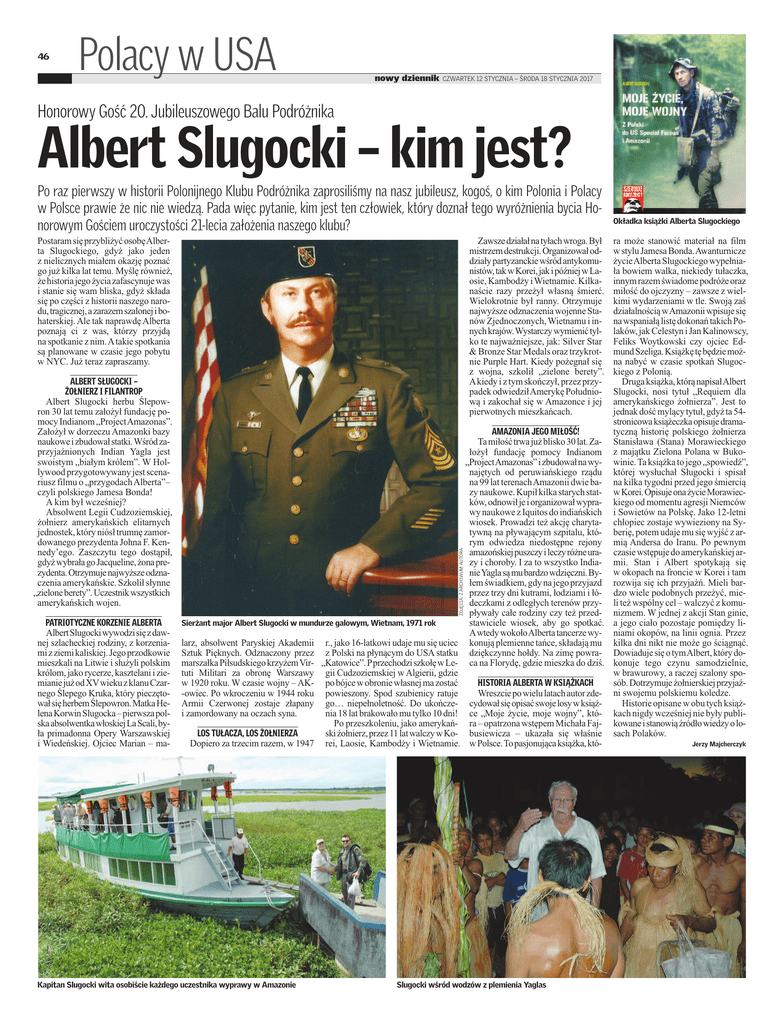 46 Polacy w USA nowy dziennik CZWARTEK 12 STYCZNIA – ŚRODA 18 STYCZNIA 2017 Honorowy Gość 20. Jubileuszowego Balu Podróżnika Albert Slugocki – kim jest? Po raz pierwszy w historii Polonijnego Klubu Podróżnika zaprosiliśmy na nasz jubileusz, kogoś, o kim Polonia i Polacy w Polsce prawie że nic nie wiedzą. Pada więc pytanie, kim jest ten człowiek, który doznał tego wyróżnienia bycia Honorowym Gościem uroczystości 21-lecia założenia naszego klubu? Zawsze działał na tyłach wroga. Był mistrzem destrukcji. Organizował oddziały partyzanckie wśród antykomunistów, tak w Korei, jak i później w Laosie, Kambodży i Wietnamie. Kilkanaście razy przeżył własną śmierć. Wielokrotnie był ranny. Otrzymuje najwyższe odznaczenia wojenne Stanów Zjednoczonych, Wietnamu i innych krajów. Wystarczy wymienić tylko te najważniejsze, jak: Silver Star & Bronze Star Medals oraz trzykrotnie Purple Hart. Kiedy pożegnał się z wojna, szkolił „zielone berety”. Akiedy i z tym skończył, przez przypadek odwiedził Amerykę Południową i zakochał się w Amazonce i jej pierwotnych mieszkańcach. Postaram się przybliżyć osobę Alberta Slugockiego, gdyż jako jeden z nielicznych miałem okazję poznać go już kilka lat temu. Myślę również, że historia jego życia zafascynuje was i stanie się wam bliska, gdyż składa się po części z historii naszego narodu, tragicznej, a zarazem szalonej i bohaterskiej. Ale tak naprawdę Alberta poznają ci z was, którzy przyjdą na spotkanie z nim. A takie spotkania są planowane w czasie jego pobytu w NYC. Już teraz zapraszamy. PATRIOTYCZNE KORZENIE ALBERTA Albert Slugocki wywodzi się z dawnej szlacheckiej rodziny, z korzeniami z ziemi kaliskiej. Jego przodkowie mieszkali na Litwie i służyli polskim królom, jako rycerze, kasztelani i ziemianie już od XVwieku z klanu Czarnego Ślepego Kruka, który pieczętował się herbem Ślepowron. Matka Helena Korwin Slugocka – pierwsza polska absolwentka włoskiej La Scali, była primadonna Opery Warszawskiej i Wiedeńskiej. Ojciec Marian – ma- ZDJĘCIA: Z ARCHIWUM AUTORA ALBERT SŁUGOCKI – ŻOŁNIERZ I FILANTROP Albert Slugocki herbu Ślepowron 30 lat temu założył fundację pomocy Indianom „Project Amazonas”. Założył w dorzeczu Amazonki bazy naukowe i zbudował statki. Wśród zaprzyjaźnionych Indian Yagla jest swoistym „białym królem”. W Hollywood przygotowywany jest scenariusz filmu o „przygodach Alberta”– czyli polskiego Jamesa Bonda! A kim był wcześniej? Absolwent Legii Cudzoziemskiej, żołnierz amerykańskich elitarnych jednostek, który niósł trumnę zamordowanego prezydenta Johna F. Kennedy’ego. Zaszczytu tego dostąpił, gdyż wybrała go Jacqueline, żona prezydenta. Otrzymuje najwyższe odznaczenia amerykańskie. Szkolił słynne „zielone berety”. Uczestnik wszystkich amerykańskich wojen. Sierżant major Albert Slugocki w mundurze galowym, Wietnam, 1971 rok larz, absolwent Paryskiej Akademii r., jako 16-latkowi udaje mu się uciec Sztuk Pięknych. Odznaczony przez z Polski na płynącym do USA statku marszałka Piłsudskiego krzyżem Vir- „Katowice”. P przechodzi szkołę w Letuti Militari za obronę Warszawy gii Cudzoziemskiej w Algierii, gdzie w 1920 roku. W czasie wojny – AK- po bójce w obronie własnej ma zostać -owiec. Po wkroczeniu w 1944 roku powieszony. Spod szubienicy ratuje Armii Czerwonej zostaje złapany go… niepełnoletność. Do ukończei zamordowany na oczach syna. nia 18 lat brakowało mu tylko 10 dni! Po przeszkoleniu, jako amerykańLOS TUŁACZA, LOS ŻOŁNIERZA ski żołnierz, przez 11 lat walczy w KoDopiero za trzecim razem, w 1947 rei, Laosie, Kambodży i Wietnamie. Kapitan Slugocki wita osobiście każdego uczestnika wyprawy w Amazonie Okładka książki Alberta Slugockiego ra może stanowić materiał na film w stylu Jamesa Bonda. Awanturnicze życie Alberta Slugockiego wypełniała bowiem walka, niekiedy tułaczka, innym razem świadome podróże oraz miłość do ojczyzny – zawsze z wielkimi wydarzeniami w tle. Swoją zaś działalnością wAmazonii wpisuje się na wspaniałą listę dokonań takich Polaków, jak Celestyn i Jan Kalinowscy, Feliks Woytkowski czy ojciec Edmund Szeliga. Książkę tę będzie można nabyć w czasie spotkań Slugockiego z Polonią. Druga książka, którą napisał Albert Slugocki, nosi tytuł „Requiem dla amerykańskiego żołnierza”. Jest to jednak dość mylący tytuł, gdyż ta 54stronicowa książeczka opisuje dramatyczną historię polskiego żołnierza AMAZONIA JEGO MIŁOŚĆ! Ta miłość trwa już blisko 30 lat. Za- Stanisława (Stana) Morawieckiego łożył fundację pomocy Indianom z majątku Zielona Polana w Buko„Project Amazonas” i zbudował na wy- winie. Ta książka to jego „spowiedź”, najętych od peruwiańskiego rządu której wysłuchał Sługocki i spisał na 99 lat terenach Amazonii dwie ba- na kilka tygodni przed jego śmiercią zy naukowe. Kupił kilka starych stat- w Korei. Opisuje ona życie Morawiecków, odnowił je i organizował wypra- kiego od momentu agresji Niemców wy naukowe z Iquitos do indiańskich i Sowietów na Polskę. Jako 12-letni wiosek. Prowadzi też akcję charyta- chłopiec zostaje wywieziony na Sytywną na pływającym szpitalu, któ- berię, potem udaje mu się wyjść z arrym odwiedza niedostępne rejony mią Andersa do Iranu. Po pewnym amazońskiej puszczy i leczy różne ura- czasie wstępuje do amerykańskiej arzy i choroby. I za to wszystko India- mii. Stan i Albert spotykają się nie Yagla są mu bardzo wdzięczni. By- w okopach na froncie w Korei i tam łem świadkiem, gdy na jego przyjazd rozwija się ich przyjaźń. Mieli barprzez trzy dni kutrami, łodziami i łó- dzo wiele podobnych przeżyć, miedeczkami z odległych terenów przy- li też wspólny cel – walczyć z komupływały całe rodziny czy też przed- nizmem. W jednej z akcji Stan ginie, stawiciele wiosek, aby go spotkać. a jego c
