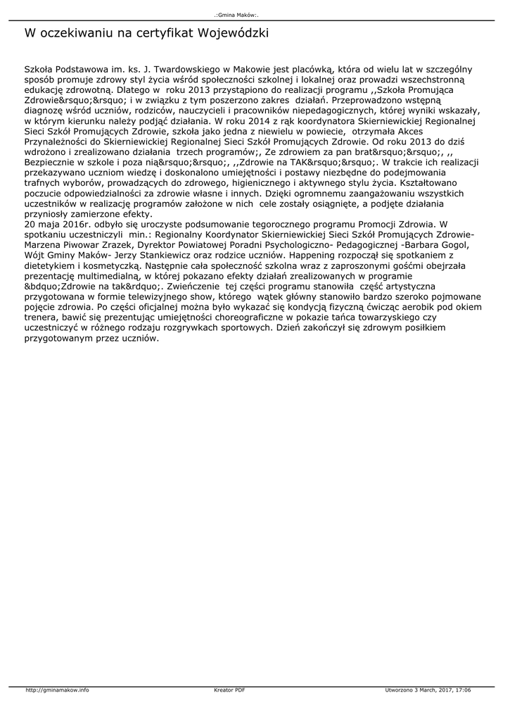 .:Gmina Maków:. W oczekiwaniu na certyfikat Wojewódzki Szkoła Podstawowa im. ks. J. Twardowskiego w Makowie jest placówką, która od wielu lat w szczególny sposób promuje zdrowy styl życia wśród społeczności szkolnej i lokalnej oraz prowadzi wszechstronną edukację zdrowotną. Dlatego w roku 2013 przystąpiono do realizacji programu ,,Szkoła Promująca Zdrowie’’ i w związku z tym poszerzono zakres działań. Przeprowadzono wstępną diagnozę wśród uczniów, rodziców, nauczycieli i pracowników niepedagogicznych, której wyniki wskazały, w którym kierunku należy podjąć działania. W roku 2014 z rąk koordynatora Skierniewickiej Regionalnej Sieci Szkół Promujących Zdrowie, szkoła jako jedna z niewielu w powiecie, otrzymała Akces Przynależności do Skierniewickiej Regionalnej Sieci Szkół Promujących Zdrowie. Od roku 2013 do dziś wdrożono i zrealizowano działania trzech programów;, Ze zdrowiem za pan brat’’, ,, Bezpiecznie w szkole i poza nią’’, ,,Zdrowie na TAK’’. W trakcie ich realizacji przekazywano uczniom wiedzę i doskonalono umiejętności i postawy niezbędne do podejmowania trafnych wyborów, prowadzących do zdrowego, higienicznego i aktywnego stylu życia. Kształtowano poczucie odpowiedzialności za zdrowie własne i innych. Dzięki ogromnemu zaangażowaniu wszystkich uczestników w realizację programów założone w nich cele zostały osiągnięte, a podjęte działania przyniosły zamierzone efekty. 20 maja 2016r. odbyło się uroczyste podsumowanie tegorocznego programu Promocji Zdrowia. W spotkaniu uczestniczyli min.: Regionalny Koordynator Skierniewickiej Sieci Szkół Promujących ZdrowieMarzena Piwowar Zrazek, Dyrektor Powiatowej Poradni Psychologiczno- Pedagogicznej -Barbara Gogol, Wójt Gminy Maków- Jerzy Stankiewicz oraz rodzice uczniów. Happening rozpoczął się spotkaniem z dietetykiem i kosmetyczką. Następnie cała społeczność szkolna wraz z zaproszonymi gośćmi obejrzała prezentację multimedialną, w której pokazano efekty działań zrealizowanych w programie „Zdrowie na tak”. Zwieńczenie tej części programu stanowiła część artystyczna przygotowana w formie telewizyjnego show, którego wątek główny stanowiło bardzo szeroko pojmowane pojęcie zdrowia. Po części oficjalnej można było wykazać się kondycją fizyczną ćwicząc aerobik pod okiem trenera, bawić się prezentując umiejętności choreograficzne w pokazie tańca towarzyskiego czy uczestniczyć w różnego rodzaju rozgrywkach sportowych. Dzień zakończył się zdrowym posiłkiem przygotowanym przez uczniów. http://gminamakow.info Kreator PDF Utworzono 3 March, 2017, 17:06