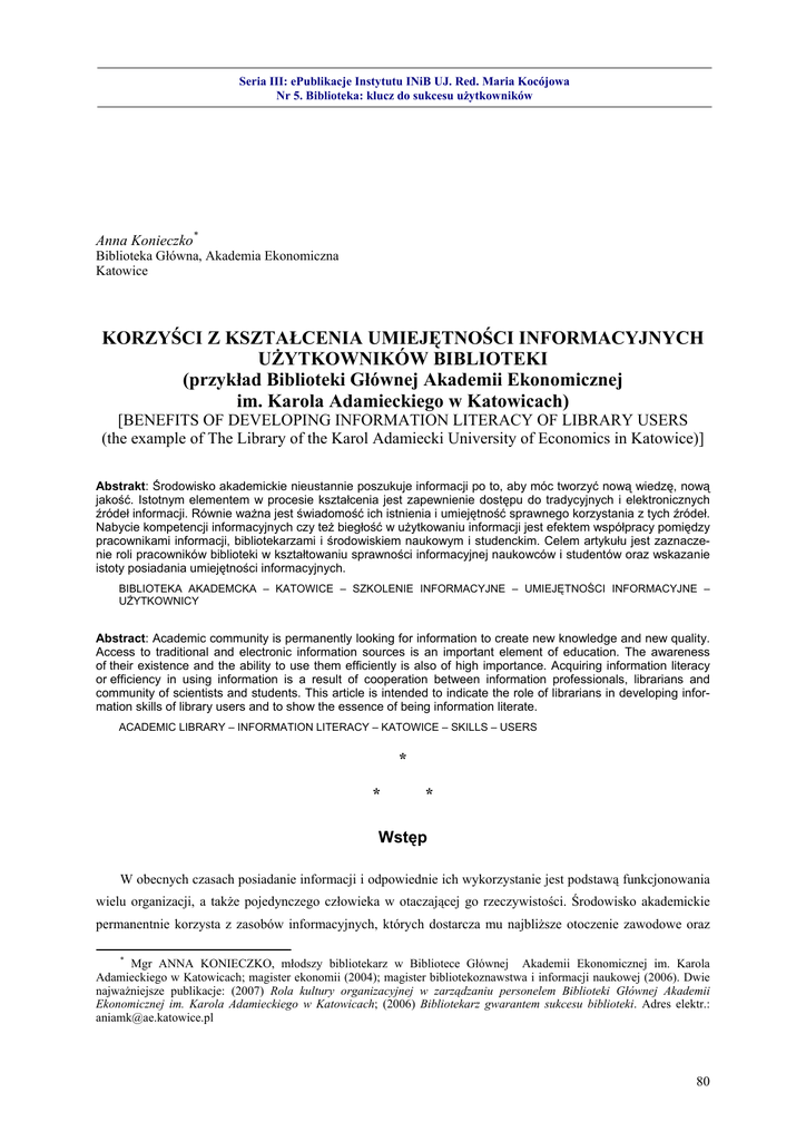 Seria III: ePublikacje Instytutu INiB UJ. Red. Maria Kocójowa Nr 5. Biblioteka: klucz do sukcesu użytkowników Anna Konieczko* Biblioteka Główna, Akademia Ekonomiczna Katowice KORZYŚCI Z KSZTAŁCENIA UMIEJĘTNOŚCI INFORMACYJNYCH UŻYTKOWNIKÓW BIBLIOTEKI (przykład Biblioteki Głównej Akademii Ekonomicznej im. Karola Adamieckiego w Katowicach) [BENEFITS OF DEVELOPING INFORMATION LITERACY OF LIBRARY USERS (the example of The Library of the Karol Adamiecki University of Economics in Katowice)] Abstrakt: Środowisko akademickie nieustannie poszukuje informacji po to, aby móc tworzyć nową wiedzę, nową jakość. Istotnym elementem w procesie kształcenia jest zapewnienie dostępu do tradycyjnych i elektronicznych źródeł informacji. Równie ważna jest świadomość ich istnienia i umiejętność sprawnego korzystania z tych źródeł. Nabycie kompetencji informacyjnych czy też biegłość w użytkowaniu informacji jest efektem współpracy pomiędzy pracownikami informacji, bibliotekarzami i środowiskiem naukowym i studenckim. Celem artykułu jest zaznaczenie roli pracowników biblioteki w kształtowaniu sprawności informacyjnej naukowców i studentów oraz wskazanie istoty posiadania umiejętności informacyjnych. BIBLIOTEKA AKADEMCKA – KATOWICE – SZKOLENIE INFORMACYJNE – UMIEJĘTNOŚCI INFORMACYJNE – UŻYTKOWNICY Abstract: Academic community is permanently looking for information to create new knowledge and new quality. Access to traditional and electronic information sources is an important element of education. The awareness of their existence and the ability to use them efficiently is also of high importance. Acquiring information literacy or efficiency in using information is a result of cooperation between information professionals, librarians and community of scientists and students. This article is intended to indicate the role of librarians in developing information skills of library users and to show the essence of being information literate. ACADEMIC LIBRARY – INFORMATION LITERACY – KATOWICE – SKILLS – USERS * * * Wstęp W obecnych czasach posiadanie informacji i odpowiednie ich wykorzystanie jest podstawą funkcjonowania wielu organizacji, a także pojedynczego człowieka w otaczającej go rzeczywistości. Środowisko akademickie permanentnie korzysta z zasobów informacyjnych, których dostarcza mu najbliższe otoczenie zawodowe oraz * Mgr ANNA KONIECZKO, młodszy bibliotekarz w Bibliotece Głównej Akademii Ekonomicznej im. Karola Adamieckiego w Katowicach; magister ekonomii (2004); magister bibliotekoznawstwa i informacji naukowej (2006). Dwie najważniejsze publikacje: (2007) Rola kultury organizacyjnej w zarządzaniu personelem Biblioteki Głównej Akademii Ekonomicznej im. Karola Adamieckiego w Katowicach; (2006) Bibliotekarz gwarantem sukcesu biblioteki. Adres elektr.: [email protected] 80 Seria III: ePublikacje Instytutu INiB UJ. Red. Maria Kocójowa Nr 5. Biblioteka: klucz do sukcesu użytkowników instytucje odpowiedzialne za udostępnianie informacji. Taką instytucją jest biblioteka akademicka, która często staje się dla użytkownika pracownią informacji naukowej. Informacja jako zasób strategiczny Informacja jest zasobem, mającym swoją wartość i wykorzystywanym do różnych celów, np. ekonomicznych (podjęcie decyzji finansowej, prowadzenie działalności gospodarczej), naukowych (tworzenie i identyfikacja wartościowej wiedzy), społecznych (komunikowanie się ludzi). Nie ulega wątpliwości, że zasób podlega dezaktualizacji, ale zarazem ma cechy mobilności, czyli dostępności jednocześnie w różnych miejscach i dla różnych użytkowników, możliwości powielania bez automatycznego zużywania oraz niewyczerpywalności (istnieje nieskończony zbiór informacji nieodkrytych i nieujawnionych) [Stefanowicz 2004, s. 14, 20]. Dla biblioteki wartościowa informacja pozwala na kształtowanie się nowej wiedzy w środowisku uczelnianym, wspiera proces kształcenia studentów, wzbogaca warsztat pracy naukowej i dydaktycznej pracowników naukowych oraz umożliwia komunikowanie się kadry naukowej, co pozwala na osiągnięcie wspólnego celu, np. zrealizowanie projektu badawczego danego zakładu/katedry. Można stwierdzić, że informacja staje się elementem wiedzy w przypadku gdy zostanie porównana lub połączona z inną, konsekwencją jej uzyskania jest podjęcie decyzji i działań [Skrzypek, Grela 2005, s. 15]. Informacja stanowi zatem podstawę wiedzy. Świadomość istnienia źródeł informacji oraz ich wykorzystanie są warunkiem tworzenia jej nowych zasobów. Umiejętności informacyjne Naukowcy i studenci, aby zdobywać wiedzę i ją wykorzystywać, kierują się swoimi umiejętnościami wyszukiwawczymi i rozpoznaniem zbiorów dostępnych w bibliotece macierzystej uczelni. Współczesnych użytkowników informacji charakteryzują rosnące potrzeby informacyjne, większa świadomość roli informacji oraz praw dostępu do niej, rozszerzony zakres zachowań informacyjnych, a także stres i niepewność informacyjna wynikające z tkwiących w człowieku barier w zetknięciu się ze środowiskiem informacyjnym, które może być swego rodzaju gąszczem informacji [Materska 2007, s. 364–365]. Dlatego też uczestnicy systemu informacyjnego, aby w sposób efektywny wyszukiwać informacje (tzn. znaleźć informacje relewantne, będące wartościowym źródłem, które można wykorzystać), potrzebują pomocy profesjonalistów – merytorycznych pracowników biblioteki. Umożliwiają oni i ułatwiają dostęp do zasobów oraz uczestniczą w procesie kształcenia kompetencji informacyjnych użytkowników, pozwalających na sprawne (swobodne) i efektywne poruszanie się w licznych serwisach informacyjnych, bazach danych, katalogach bibliotecznych. Czym są zatem kompetencje informacyjne? W literaturze zagranicznej umiejętności informacyjne określane są jako information literacy [dalej IL], information skills. Podkreś