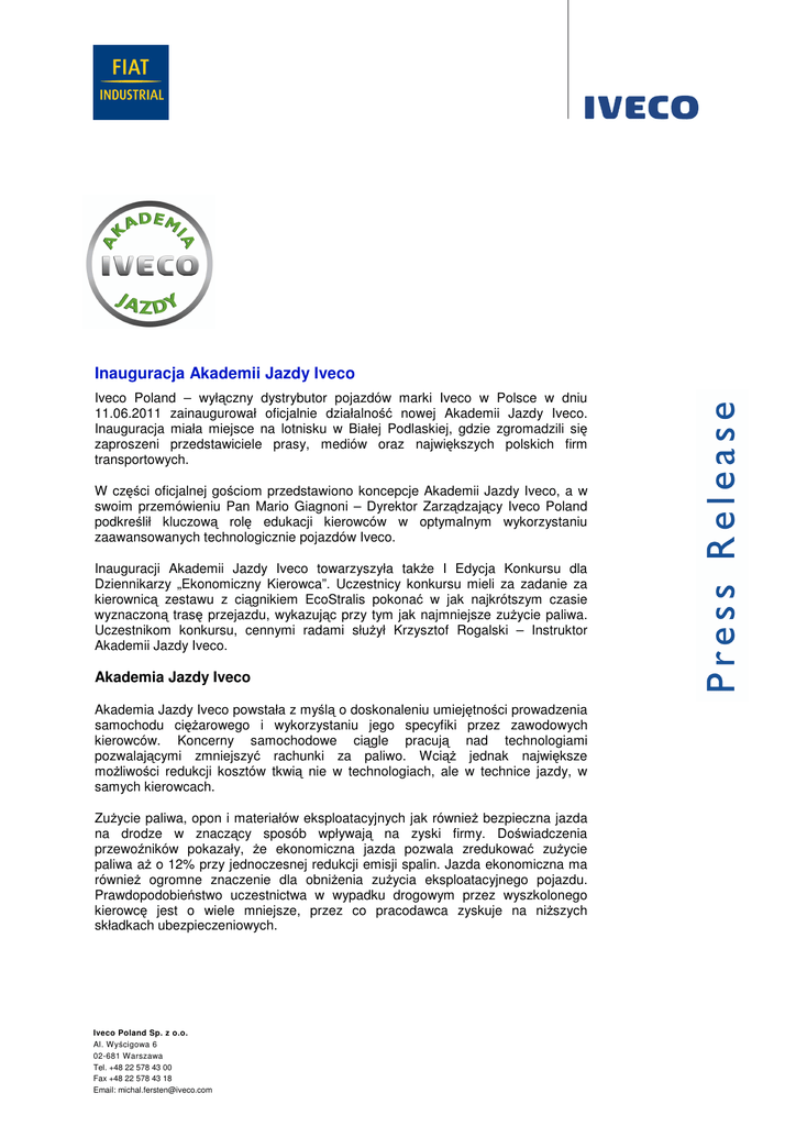 Inauguracja Akademii Jazdy Iveco Iveco Poland – wyłączny dystrybutor pojazdów marki Iveco w Polsce w dniu 11.06.2011 zainaugurował oficjalnie działalność nowej Akademii Jazdy Iveco. Inauguracja miała miejsce na lotnisku w Białej Podlaskiej, gdzie zgromadzili się zaproszeni przedstawiciele prasy, mediów oraz największych polskich firm transportowych. W części oficjalnej gościom przedstawiono koncepcje Akademii Jazdy Iveco, a w swoim przemówieniu Pan Mario Giagnoni – Dyrektor Zarządzający Iveco Poland podkreślił kluczową rolę edukacji kierowców w optymalnym wykorzystaniu zaawansowanych technologicznie pojazdów Iveco. Inauguracji Akademii Jazdy Iveco towarzyszyła także I Edycja Konkursu dla Dziennikarzy „Ekonomiczny Kierowca”. Uczestnicy konkursu mieli za zadanie za kierownicą zestawu z ciągnikiem EcoStralis pokonać w jak najkrótszym czasie wyznaczoną trasę przejazdu, wykazując przy tym jak najmniejsze zużycie paliwa. Uczestnikom konkursu, cennymi radami służył Krzysztof Rogalski – Instruktor Akademii Jazdy Iveco. Akademia Jazdy Iveco Akademia Jazdy Iveco powstała z myślą o doskonaleniu umiejętności prowadzenia samochodu ciężarowego i wykorzystaniu jego specyfiki przez zawodowych kierowców. Koncerny samochodowe ciągle pracują nad technologiami pozwalającymi zmniejszyć rachunki za paliwo. Wciąż jednak największe możliwości redukcji kosztów tkwią nie w technologiach, ale w technice jazdy, w samych kierowcach. Zużycie paliwa, opon i materiałów eksploatacyjnych jak również bezpieczna jazda na drodze w znaczący sposób wpływają na zyski firmy. Doświadczenia przewoźników pokazały, że ekonomiczna jazda pozwala zredukować zużycie paliwa aż o 12% przy jednoczesnej redukcji emisji spalin. Jazda ekonomiczna ma również ogromne znaczenie dla obniżenia zużycia eksploatacyjnego pojazdu. Prawdopodobieństwo uczestnictwa w wypadku drogowym przez wyszkolonego kierowcę jest o wiele mniejsze, przez co pracodawca zyskuje na niższych składkach ubezpieczeniowych. Iveco Poland Sp. z o.o. Al. Wyścigowa 6 02-681 Warszawa Tel. +48 22 578 43 00 Fax +48 22 578 43 18 Email: [email protected] Styl jazdy to kluczowy czynnik, który ma olbrzymi wpływ na efektywność pojazdu. Zmiana stylu prowadzenia nie jest bardzo trudna przy dobrej motywacji, a można ją osiągnąć przez włączenie kierowców w odpowiednie szkolenia. Inwestycja w szkolenia kierowców szybko i znacząco wpływa na podniesienie zysku firmy. Kursy w Akademii Jazdy Iveco to praktyczne narzędzia do zwiększania umiejętności, lepszego poznania swojego pojazdu. Szkoła zaprasza do wzięcia udziału w kursach organizowanych w ośrodkach szkoleniowych Iveco lub na prośbę klienta, jeżeli to tylko możliwe, w jego siedzibie. Program szkoleń Akademii Jazdy Iveco • technika jazdy samochodem ciężarowym (zajęcia teoretyczne omawiające zagadnienia ekonomicznej jazdy i właściwej dbałości o stan techniczny ciężarówek IVECO). • omówienie wybranych przepisów transportowych • komentarz niektórych przepisów prawa o ruchu drogowym • szkolenie praktyczne, prowadzone z wykorzystaniem w pełni obciążonego, 40tonowego zestawu z ciągnikiem IVECO Stralis lub EcoStralis; jazdy odbywają się w terenie pagórkowatym, co ma na celu wyćwiczenie umiejętności korzystania z hamulca wydechowego i zwalniacza oraz energii kinetycznej rozpędzonej ciężarówki przy pokonywaniu wzniesień. W oparciu o produkty Iveco możliwe jest również zorganizowanie szkolenia dotyczącego techniki prowadzenia pojazdu używanego w dystrybucji lub w pracy na placu budowy Zajęcia prowadzone w Akademii Jazdy Iveco pozwolą nawet najbardziej doświadczonemu kierowcy zwiększyć nie tylko ekonomikę i bezpieczeństwo podczas pracy, ale także podnieść własną efektywność mającą wpływ na premię finansową. Iveco Iveco, spółka należąca do Grupy Fiat Industrial, projektuje, produkuje i sprzedaje szeroką gamę pojazdów użytkowych we wszystkich segmentach rynku, od pojazdów lekkich poprzez pojazdy średnie, a skończywszy na pojazdach ciężkich, ciężarówkach terenowych, autobusach do przewozów miejskich i międzymiastowych oraz autokarach, a także pojazdach do zadań specjalnych takich jak pojazdy pożarnicze, pojazdy do zadań terenowych oraz do celów obronnych i do ochrony ludności cywilnej. Iveco zatrudnia prawie 25.000 pracowników, którzy pracują w 24 zakładach produkcyjnych w 11 krajach świata, przy zastosowaniu zaawansowane technologii opracowanych w 6 ośrodkach naukowo-badawczych. Oprócz Europy, Spółka prowadzi również działalność w Chinach, Rosji, Australii i Ameryce Łacińskiej. Około 5,000 punktów sprzedaży oraz serwisowych w ponad 160 krajach gwarantuje pomoc techniczną, niezależnie pod jaką szerokością geograficzną pojazd Iveco jest eksploatowany. Warszawa, dnia 11 czerwca 2011 r.