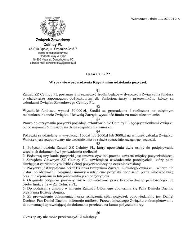 Warszawa, dnia 11.10.2012 r. Związek Zawodowy Celnicy PL 45-010 Opole, ul. Szpitalna 3b 5-7 Adres korespondencyjny: Oddział Celny w Nysie 48-300 Nysa; ul. Otmuchowska 50 adres e-mail: [email protected] Uchwała nr 22 W sprawie wprowadzenia Regulaminu udzielania pożyczek §1 Zarząd ZZ Celnicy PL postanawia przeznaczyć środki będące w dyspozycji Związku na fundusz o charakterze zapomogowo-pożyczkowym dla funkcjonariuszy i pracowników, którzy są członkami Związku Zawodowego Celnicy PL. §2 Wysokość funduszu wynosi 50.000 zł. Środki są gromadzone i rozliczane na odrębnym rachunku/subkoncie Związku. Uchwałą Zarządu wysokość funduszu może ulec zmianie. §3 Prawo do otrzymania pożyczki posiadają członkowie ZZ Celnicy PL będący członkami Związku od co najmniej 6 miesięcy na dzień rozpatrzenia wniosku. §4 Pożyczki są udzielane w wysokości 1000zł lub 2000zł lub 3000zł na wniosek członka Związku. Wniosek jest rozpatrywany nie wcześniej, niż po spłacie poprzednio zaciągniętej pożyczki. §5 1. Pożyczki udziela Zarząd ZZ Celnicy PL, który upoważnia dwie osoby do podpisywania wszelkich dokumentów i prowadzenia rozliczeń 2. Podstawą uzyskania pożyczki jest umowa cywilno-prawna zawarta między pożyczkobiorcą, a Zarządem Głównym ZZ Celnicy PL, zawierająca oświadczenie poręczyciela, który pełni służbę/jest zatrudniony w Izbie Celnej pożyczkobiorcy na czas nieokreślony. 3. Pożyczka jest wypłacana przez Członka Prezydium Zarządu Głównego Związku , w terminie 7 dni po otrzymaniu oryginału umowy o udzielenie pożyczki podpisanej przez wnioskodawcę oraz funkcjonariusza lub pracownika jako poręczyciela. 4. Oryginały podpisów powinny zostać potwierdzone przez bezpośredniego przełożonego lub osobę funkcyjną w ZZ Celnicy PL. 5. Do podpisania umowy w imieniu Zarządu Głównego upoważnia się Pana Daniela Dachno oraz Panią Bożenę Bogusz. 6. Za prowadzenie dokumentacji oraz rozliczenia spłat pożyczek odpowiedzialny jest Daniel Dachno. Pan Daniel Dachno informuje mailowo Przewodniczącego Związku o skompletowaniu dokumentacji uprawniającej do dokonania przelewu na konto pożyczkobiorcy §6 Okres spłaty nie może przekroczyć 12 miesięcy. §7 1. Opłata za udzielenie pożyczki wynosi 6 zł na 1000zł pożyczki za każdy miesiąc deklarowanej spłaty, lecz nie mniej niż 30 zł za cały okres spłaty. 2. Opłata jest spłacana jest w pierwszej kolejności. 3. Opłata jest przeznaczana na opłaty z tytułu obsługi funduszu oraz na statutową działalność Związku. §8 Wprowadza się Regulamin przyznawania pożyczek, który stanowi załącznik do niniejszej Uchwały Za Zarząd: Sławomir Siwy Przewodniczący ZZ Celnicy PL REGULAMIN PRZYZNAWANIA POŻYCZEK CZŁONKOM ZWIĄZKU ZAWODOWEGO CELNICY PL §1 Wprowadza się Regulamin przyznawania pożyczek dla członków Związku Zawodowego Celnicy PL § 2 1.Pożyczkę przyznaje się na wniosek złożony przez członka Związku, którego wzór stanowi załącznik nr 1 do Regulaminu. 2. Wniosek przesyła się służbową pocztą elektroniczną na adres [email protected] Jednocześnie wnioskodawca telefonuje na numer telefonu 603663144 informując o wysłaniu wniosku. Wnioski są rozpatrywane i zatwierdzane do wypłaty nie rzadziej niż raz w miesiącu przez dwóch upoważnionych przez Zarząd Główny Związku ZZ Celnicy PL członków Związku. 3. Co najmniej raz na kwartał Zarząd Związku otrzymuje pełną informację o udzielonych pożyczkach, w tym w szczególności zaległościach w spłatach. §3 1. Osoba obsługująca fundusz przekazuje pożyczkobiorcom informację o numerze wniosku i przewidywanym terminie przekazania środków, a po zatwierdzeniu wypłaty pożyczki przez dwóch upoważnionych przez Zarząd Główny ZZ Celnicy PL członków Związku, przesyła na wskazany adres e-mail umowę do podpisu. 2. Pożyczkobiorca przesyła pocztą na wskazany adres, dwa egzemplarze umowy opatrzone własnoręcznym podpisem, oraz podpisem poręczyciela, potwierdzonymi za zgodność z oryginałem przez bezpośredniego przełożonego lub osobę funkcyjną ZZ Celnicy PL. 3. Jeden egzemplarz umowy po podpisaniu przez upoważnionych przez Zarząd Główny ZZ Celnicy PL - Pana Daniela Dachno i Panią Bożenę Bogusz - jest odsyłany na adres pożyczkobiorcy wskazany we wniosku jako adres do korespondencji. Drugi egzemplarz pozostaje w aktach. §4 Wzór umowy stanowi załącznik nr 2 do niniejszego Regulaminu. § 5 1. O przyznaniu pożyczki decyduje kolejność złożonych wniosków – ich data wpływu na adres poczty elektronicznej. W indywidualnych, uzasadnionych przypadkach pożyczka może być przyznana niezależnie od terminu złożenia wniosku. 2. Pożyczka jest uruchamiana po otrzymaniu umowy na adres Urzędu Celnego w Lublinie ul. Energetyków 20-22, 20-468 Lublin z dopiskiem „pożyczki ZZ Celnicy PL – Daniel Dachno” i jest wypłacana w miarę posiadania wolnych środków przeznaczonych na cel zapomogowopożyczkowy. Pożyczkobiorca wykonuje telefon na numer 603663144 informując o dacie wysłania umowy. 3. Osoba obsługująca pożyczki z ramienia ZZ Celnicy PL przesyła informację do Zarządu Głównego Związku niezwłocznie po otrzymaniu umowy. 4. Pożyczkę wypłaca Członek Prezydium Zarządu Głównego Związku na wskazane we wniosku konto bankowe pożyczkobiorcy, w terminie 7 dni od otrzymania informacji o otrzymaniu umowy, o ile są do dyspozycji wolne środki przeznaczone na cel zapomogowy pożyczkowy. W przypadku braku takich środków, w najbliższym możliwym terminie, z uwzględnieniem kolejności przyznanych pożyczek. 5.Spłata pożyczki rozpoczyna się w terminie do 30 dni od otrzymania środków na konto pożyczkodawcy wg ustalonego w umowie harmonogramu. 6. Spłaty dokonuje się na konto ZZ Celnicy PL w banku BNP PARIBAS FORTIS, nr rachunku: 44 1600 1462 0008 2567 1607 7001 7. Członek Prezydium Zarządu Głównego Związku, raz w miesiącu przekazuje Pan