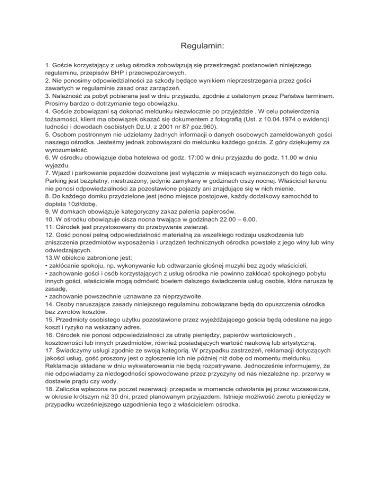 Regulamin: 1. Goście korzystający z usług ośrodka zobowiązują się przestrzegać postanowień niniejszego regulaminu, przepisów BHP i przeciwpożarowych. 2. Nie ponosimy odpowiedzialności za szkody będące wynikiem nieprzestrzegania przez gości zawartych w regulaminie zasad oraz zarządzeń. 3. Należność za pobyt pobierana jest w dniu przyjazdu, zgodnie z ustalonym przez Państwa terminem. Prosimy bardzo o dotrzymanie tego obowiązku. 4. Goście zobowiązani są dokonać meldunku niezwłocznie po przyjeździe . W celu potwierdzenia tożsamości, klient ma obowiązek okazać się dokumentem z fotografią (Ust. z 10.04.1974 o ewidencji ludności i dowodach osobistych Dz.U. z 2001 nr 87 poz.960). 5. Osobom postronnym nie udzielamy żadnych informacji o danych osobowych zameldowanych gości naszego ośrodka. Jesteśmy jednak zobowiązani do meldunku każdego gościa. Z góry dziękujemy za wyrozumiałość. 6. W ośrodku obowiązuje doba hotelowa od godz. 17:00 w dniu przyjazdu do godz. 11.00 w dniu wyjazdu. 7. Wjazd i parkowanie pojazdów dozwolone jest wyłącznie w miejscach wyznaczonych do tego celu. Parking jest bezpłatny, niestrzeżony, jedynie zamykany w godzinach ciszy nocnej. Właściciel terenu nie ponosi odpowiedzialności za pozostawione pojazdy ani znajdujące się w nich mienie. 8. Do każdego domku przydzielone jest jedno miejsce postojowe, każdy dodatkowy samochód to dopłata 10zł/dobę. 9. W domkach obowiązuje kategoryczny zakaz palenia papierosów. 10. W ośrodku obowiązuje cisza nocna trwająca w godzinach 22.00 – 6.00. 11. Ośrodek jest przystosowany do przebywania zwierząt. 12. Gość ponosi pełną odpowiedzialność materialną za wszelkiego rodzaju uszkodzenia lub zniszczenia przedmiotów wyposażenia i urządzeń technicznych ośrodka powstałe z jego winy lub winy odwiedzających. 13.W obiekcie zabronione jest: • zakłócanie spokoju, np. wykonywanie lub odtwarzanie głośnej muzyki bez zgody właścicieli, • zachowanie gości i osób korzystających z usług ośrodka nie powinno zakłócać spokojnego pobytu innych gości, właściciele mogą odmówić bowiem dalszego świadczenia usług osobie, która narusza tę zasadę, • zachowanie powszechnie uznawane za nieprzyzwoite. 14. Osoby naruszające zasady niniejszego regulaminu zobowiązane będą do opuszczenia ośrodka bez zwrotów kosztów. 15. Przedmioty osobistego użytku pozostawione przez wyjeżdżającego gościa będą odesłane na jego koszt i ryzyko na wskazany adres. 16. Ośrodek nie ponosi odpowiedzialności za utratę pieniędzy, papierów wartościowych , kosztowności lub innych przedmiotów, również posiadających wartość naukową lub artystyczną. 17. Świadczymy usługi zgodnie ze swoją kategorią. W przypadku zastrzeżeń, reklamacji dotyczących jakości usług, gość proszony jest o zgłoszenie ich nie później niż dobę od momentu meldunku. Reklamacje składane w dniu wykwaterowania nie będą rozpatrywane. Jednocześnie informujemy, że nie odpowiadamy za niedogodności spowodowane przez przyczyny od nas niezależne np. przerwy w dostawie prądu czy wody. 18. Zaliczka wpłacona na poczet rezerwacji przepada w momencie odwołania jej przez wczasowicza, w okresie krótszym niż 30 dni, przed planowanym przyjazdem. Istnieje możliwość zwrotu pieniędzy w przypadku wcześniejszego uzgodnienia tego z właścicielem ośrodka.
