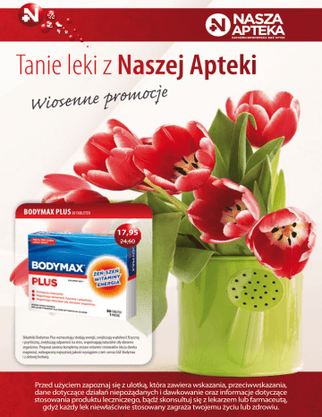 Tanie leki z Naszej Apteki e j c o m o r p e n Wiosen Bodymax Plus 30 tabletek 17,95 24,60 Składniki Bodymax Plus wzmacniają i dodają energii, zwiększają wydolność fizyczną i psychiczną, zwiększają odporność na stres, wspomagają naturalne siły obronne organizmu. Preparat zawiera kompletny zestaw witamin i minerałów (duża dawka magnezu), wzbogacony najwyższej jakości wyciągiem z żeń-szenia GGE Bodymax i z zielonej herbaty. Przed użyciem zapoznaj się z ulotką, która zawiera wskazania, przeciwwskazania, dane dotyczące działań niepożądanych i dawkowanie oraz informacje dotyczące stosowania produktu leczniczego, bądź skonsultuj się z lekarzem lub farmaceutą, gdyż każdy lek niewłaściwie stosowany zagraża twojemu życiu lub zdrowiu. Porą roku, która zazwyczaj najbardziej się dłuży jest zima, a najtrudniejsze do przetrwania są jej ostatnie tygodnie. Organizm zmęczony mało ruchliwym trybem życia, niedoborem światła słonecznego i chłodem, w krótkim czasie jest zmuszony dostosować się do nowego (wiosennego) rytmu. Proces akceptacji w nowych warunkach trwa około miesiąca. Często jednak towarzyszą mu nieprzyjemne objawy tzw. przesilenie wiosennego, takie jak: osłabienie i ciągłe uczucie senności, bóle głowy, trudności z koncentracją, chwiejne nastroje. Zimowo – wiosenne przesilenie to szereg zmian w naszym środowisku. Wzrasta temperatura, dzień ulega wydłużeniu wraz ze wzrostem nasłonecznienia, następuje zmiana czasu, narzucająca zmianę rytmu dobowego, a ponadto zachodzą częste zmiany pogodowe, które wzmagają dolegliwości meteopatyczne. Organizm działający do tej pory na „zmniejszonych obrotach”, pozbawiony odpowiedniej ilości naturalnego światła, często niezbędnych odżywczych jest osłabiony i podatny na różnego rodzaju infekcje. Co zrobić aby odpowiedni przygotować nasz organizm do wiosny? OEPAROL® 60 kapsułek • Najważniejszy jest ośmiogodzinny odpoczynek, który znakomicie zregeneruje nasz organizm i wpłynie na lepsze samopoczucie. Odporność na każdy dzień i pogodę 17,70 • Tuż po przebudzeniu warto przy otwartym oknie wykonać poranną gimnastykę, która doda energii i pozwoli dotlenić organizm po całonocnym odpoczynku. 25,20 • Warto jak najwięcej korzystać z promieni słonecznych – w domy i w pracy, w ciągu dnia, dobrze jest odsunąć zasłony i żaluzje, żeby jak najwięcej światła dziennego wpadło do pomieszczenia. • Niezwykle ważna jest odpowiednia dieta. Obniżony poziom nienasyconych kwasów tłuszczowych w organizmie, to również przyczyna wielu niekorzystnych zmian w układzie odpornościowym. Zaburzony metabolizm NNKT prowadzi bowiem do upośledzonej produkcji limfocytów B i T odpowiedzialnych za produkcję przeciwciał i odpowiedź odpornościową dla patogenów chorobotwórczych. Tym samym zostaje obniżona sprawność układu immunologicznego. Wszystko to powoduje zwiększą podatność naszego organizmu na infekcję i alergię, w tym alergie atopowe. Systematyczne przyjmowanie preparatów z olejem wiesiołka (np. Oeparol firmy Adamed Consumer Healthcare S.A) podnosi poziom kwasów omega 6 przez co wpływa korzystnie na usprawnienie działania i wytrzymałości systemu odpornościowego na rożnego rodzaju bakterie, wirusy, czy czynniku powodujące alergie. Podczas choroby wzmacniają mechanizmy obronne ustroju, natomiast po przebytej chorobie wspomagają procesy regeneracyjne. Stosowanie przynajmniej części zaleceń wpłynie na poprawę samopoczucia w ciągu najbliższych tygodni i pozwoli przywitać wiosnę w dobrym nastroju. 2 suplement diety Skład: 1 kapsułka zawiera 510 mg oleju z nasion z wiesiołka. Oeparol suplement diety zawiera olej z nasion wiesiołka, będący jednym z najcenniejszych źródeł kwasów omega–6. Kwasy omega-6 należą do grupy Niezbędnych Nienasyconych Kwasów Tłuszczowych (NNKT), które pełnią zasadniczą rolę w regulacjach mechanizmów systemu odpornościowego i przebiegu zapalenia. Kwasy OMEGA - 6: • aktywują siły obronne organizmu, • zwiększają odporność na infekcję wirusowe i bakteryjne, • pomagają ograniczyć stan zapalny w organizmie. Dodatkowo kwasy Omega – 6 wspomagają funkcjonowanie układu sercowo – naczyniowego oraz korzystnie wpływają na gospodarkę cholesterolu. Neutralny smak, łatwa do połknięcia kapsułka. Dawkowanie: 1-2 kapsułki 3 razy dziennie podczas posiłku. Dzieci powyżej 6 roku życia: 1 kapsułka dziennie. Adamed Consumer Healthcare S.A. ul. Starościańska 33, 95 – 080 Tuszyn tel. (42) 614 – 32 - 73 WASZEIE ZDROW Otrivin Allergy 15ml PROPOLKI 10 pastylek do ssania 6,49 14,95 9,50 19,40 Fenylefryna 2,5 mg/ml + Maleinian dimetyndenu 0,25 mg/ml aerozol do nosa, roztwór Wskazania do stosowania: Leczenie objawów przeziębienia, przekrwienia błony śluzowej nosa, ostrego i przewlekłego zapalenia błony śluzowej nosa, sezonowego (katar sienny) oraz niesezonowego alergicznego zapalenia błony śluzowej nosa, naczynioruchowego zapalenia błony śluzowej nosa. Wspomagająco w ostrym i przewlekłym zapaleniu zatok oraz w zapaleniu ucha środkowego. Pielęgnacja przed- i pooperacyjna w chirurgii nosa. Przeciwwskazania: Nadwrażliwość na którykolwiek ze składników preparatu. Fenylefryna, podobnie jak i inne substancje obkurczające naczynia krwionośne, jest przeciwwskazana w zanikowym zapaleniu błony śluzowej nosa oraz u pacjentów, którzy przyjmują obecnie inhibitory monoaminooksydazy lub przyjmowali je w ciągu 14 dni poprzedzających leczenie fenylefryną. Nie stosować u dzieci w wieku poniżej 6 lat. pastylki do ssania łagodzą: • podrażnienia jamy ustnej i gardła • suchość w gardle • uczucie dyskomfortu w gardle Propolki dostępne są w 4 smakach: • propolisowe z Vit C • z dziką różą i sokiem malinowym • bez cukru • z aloesem, imbirem i olejkiem z trawy cytrynowej Podmiot odpowiedzialny: NEPENTES S.A. Podmiot odpowiedzialny: Novar