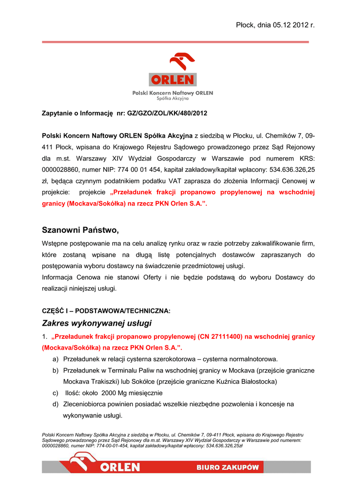 Płock, dnia 05.12 2012 r. Zapytanie o Informację nr: GZ/GZO/ZOL/KK/480/2012 Polski Koncern Naftowy ORLEN Spółka Akcyjna z siedzibą w Płocku, ul. Chemików 7, 09411 Płock, wpisana do Krajowego Rejestru Sądowego prowadzonego przez Sąd Rejonowy dla m.st. Warszawy XIV Wydział Gospodarczy w Warszawie pod numerem KRS: 0000028860, numer NIP: 774 00 01 454, kapitał zakładowy/kapitał wpłacony: 534.636.326,25 zł, będąca czynnym podatnikiem podatku VAT zaprasza do złoŜenia Informacji Cenowej w projekcie: projekcie „Przeładunek frakcji propanowo propylenowej na wschodniej granicy (Mockava/Sokółka) na rzecz PKN Orlen S.A.”. Szanowni Państwo, Wstępne postępowanie ma na celu analizę rynku oraz w razie potrzeby zakwalifikowanie firm, które zostaną wpisane na długą listę potencjalnych dostawców zapraszanych do postępowania wyboru dostawcy na świadczenie przedmiotowej usługi. Informacja Cenowa nie stanowi Oferty i nie będzie podstawą do wyboru Dostawcy do realizacji niniejszej usługi. CZĘŚĆ I – PODSTAWOWA/TECHNICZNA: Zakres wykonywanej usługi 1. „Przeładunek frakcji propanowo propylenowej (CN 27111400) na wschodniej granicy (Mockava/Sokółka) na rzecz PKN Orlen S.A.”. a) Przeładunek w relacji cysterna szerokotorowa – cysterna normalnotorowa. b) Przeładunek w Terminalu Paliw na wschodniej granicy w Mockava (przejście graniczne Mockava Trakiszki) lub Sokółce (przejście graniczne Kuźnica Białostocka) c) Ilość: około 2000 Mg miesięcznie d) Zleceniobiorca powinien posiadać wszelkie niezbędne pozwolenia i koncesje na wykonywanie usługi. Polski Koncern Naftowy Spółka Akcyjna z siedzibą w Płocku, ul. Chemików 7, 09-411 Płock, wpisana do Krajowego Rejestru Sądowego prowadzonego przez Sąd Rejonowy dla m.st. Warszawy XIV Wydział Gospodarczy w Warszawie pod numerem: 0000028860, numer NIP: 774-00-01-454, kapitał zakładowy/kapitał wpłacony: 534.636.326,25zł Płock, dnia 05.12 2012 r. e) Sprzęt wykorzystywany do świadczenia usługi przeładunku powinien posiadać wszelkie niezbędne zezwolenia i legalizacje w chwili świadczenia usługi. f) Zleceniobiorca powinien wydzielić rurociągi technologiczne oraz spręŜarki celem zachowania czystości produktu. Oczyścić i przygotować instalację do przeładunku. g) Zleceniobiorca powinien posiadać ubezpieczenie OC. Warunki niezbędne do rozpatrzenia złoŜonej Informacji Cenowej Językiem Informacji cenowej powinien być język polski. Oferent składając informację musi zapewnić, Ŝe dokładna identyfikacja firmy, określenie „Informacja Cenowa” oraz podpisy osób upowaŜnionych do reprezentacji Oferenta w zakresie niniejszego postępowania ofertowego znajdą się na przekazanych dokumentach. Informacja Cenowa powinna składać się z wymienionych poniŜej dokumentów: 1. Nazwa Firmy, adres, telefon, fax, e-mail. 2. Nazwiska osób reprezentujących Firmę. 3. Wskazanie osoby, z którą naleŜy kontaktować się w sprawie złoŜonej informacji – imię i nazwisko, telefon, e-mail. 4. Aktualny Odpis Krajowego Rejestru Sądowego (KRS) / Rejestru Handlowego w przypadku spółek prawa handlowego lub zaświadczenie o wpisie do ewidencji działalności gospodarczej w przypadku osób fizycznych. WaŜność KRS – 3 miesiące. 5. Podpisane „Oświadczenie” stanowiące Załącznik nr 1 do Zapytania o Informację Cenową. . 6. Określenie terminu waŜności Informacji Cenowej – preferowany termin: 3 miesiące. CZĘŚĆ II CENOWA: 1. Oferent musi określić stawkę za swoje usługi w walucie PLN za przeładunek/1 tony gazu. 2. Stawka podana w ofercie musi być określona w kwocie netto (bez naleŜnego podatku VAT). 3. Cena musi zawierać wszelkie opłaty wynikające w trakcie realizacji usługi 4. Cena będzie stała przez cały okres trwania zlecenia tj. do końca 2013 roku. Polski Koncern Naftowy Spółka Akcyjna z siedzibą w Płocku, ul. Chemików 7, 09-411 Płock, wpisana do Krajowego Rejestru Sądowego prowadzonego przez Sąd Rejonowy dla m.st. Warszawy XIV Wydział Gospodarczy w Warszawie pod numerem: 0000028860, numer NIP: 774-00-01-454, kapitał zakładowy/kapitał wpłacony: 534.636.326,25zł Płock, dnia 05.12 2012 r. 5. Proszę o przesłanie deklaracji niezmienności ceny w trakcie realizacji przedmiotowej usługi. 6. Propozycja sposobu rozliczania – z uwzględnieniem 45 dniowego terminu płatności faktur licząc od dnia otrzymania faktur przez Zleceniodawcę. Sposób złoŜenia Informacji cenowej - terminy 1. Informacja Cenowa powinna być przesłana drogą elektroniczną adres e-mail: [email protected] 2. Dokumenty w formie elektronicznej mogą być zapisane w formatach plików: .doc, .xls, .pdf, 3. Oferta nie moŜe przekraczać 4,5 MB rozmiaru (z uwagi na ograniczenia transferu serwerów pocztowych). Jeśli dokumentacja ma większy rozmiar naleŜy ją podzielić na większa ilość maili, jednak w pierwszej wiadomości naleŜy napisać ilu mali naleŜy się spodziewać, 4. Dokumentacja w formie elektronicznej, zawierająca pliki w formatach podanych powyŜej, musi być zgodna z MS Office wersja 98 do 2003 Ostateczną datą składania Informacji cenowej jest 10.12.2012 do końca dnia. Spółka zastrzega sobie prawo do odrzucenia bez rozpatrywania Informacji Cenowych złoŜonych po tym terminie. W trakcie przygotowania informacji cenowej, oferent ma prawo zgłaszać dodatkowe pytania dotyczące niniejszego postępowania. Pytania muszą być kierowane w formie pisemnej za pomocą poczty elektronicznej na adres [email protected] w terminie do 08.12.2012 Odpowiedzi zostaną przesłane do oferenta w miarę moŜliwości niezwłocznie, z zastrzeŜeniem jak poniŜej. Spółka zastrzega sobie prawo odmowy udzielenia odpowiedzi na zgłoszone pytania bez podania przyczyn. Z powaŜaniem, Katarzyna Kułak-Lauterowska PKN Orlen S.A. Ul. Chemików 7 09-411 Płock, Polska tel. (24) 256 77 12 Polski Koncern Naftowy Spółka Akcyjna z siedzibą w Płocku, ul. Chemików 7, 09-411 Płock,