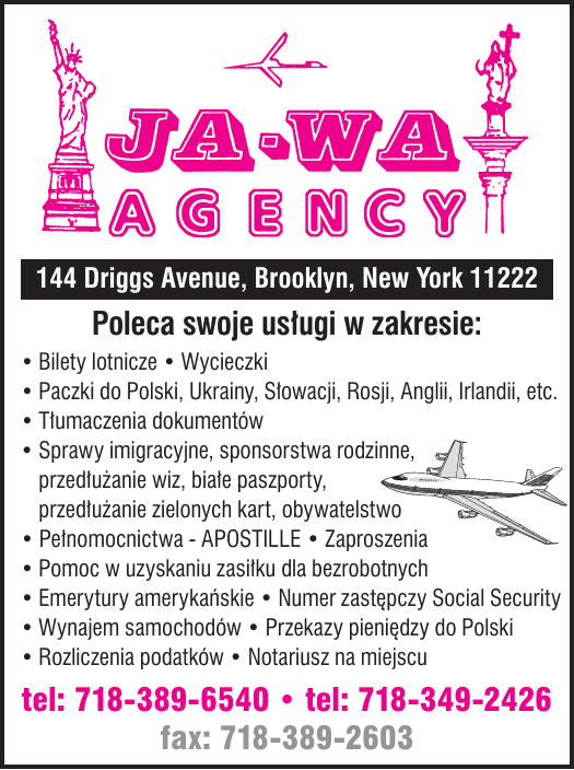 144 Driggs Avenue, Brooklyn, New York 11222 Poleca swoje usługi w zakresie: •Bilety lotnicze • Wycieczki •Paczki do Polski, Ukrainy, Słowacji, Rosji, Anglii, Irlandii, etc. •Tłumaczenia dokumentów •Sprawy imigracyjne, sponsorstwa rodzinne, przedłużanie wiz, białe paszporty, przedłużanie zielonych kart, obywatelstwo • Pełnomocnictwa - APOSTILLE • Zaproszenia •Pomoc w uzyskaniu zasiłku dla bezrobotnych •Emerytury amerykańskie • Numer zastępczy Social Security •Wynajem samochodów • Przekazy pieniędzy do Polski •Rozliczenia podatków • Notariusz na miejscu tel: 718-389-6540 • tel: 718-349-2426 fax: 718-389-2603