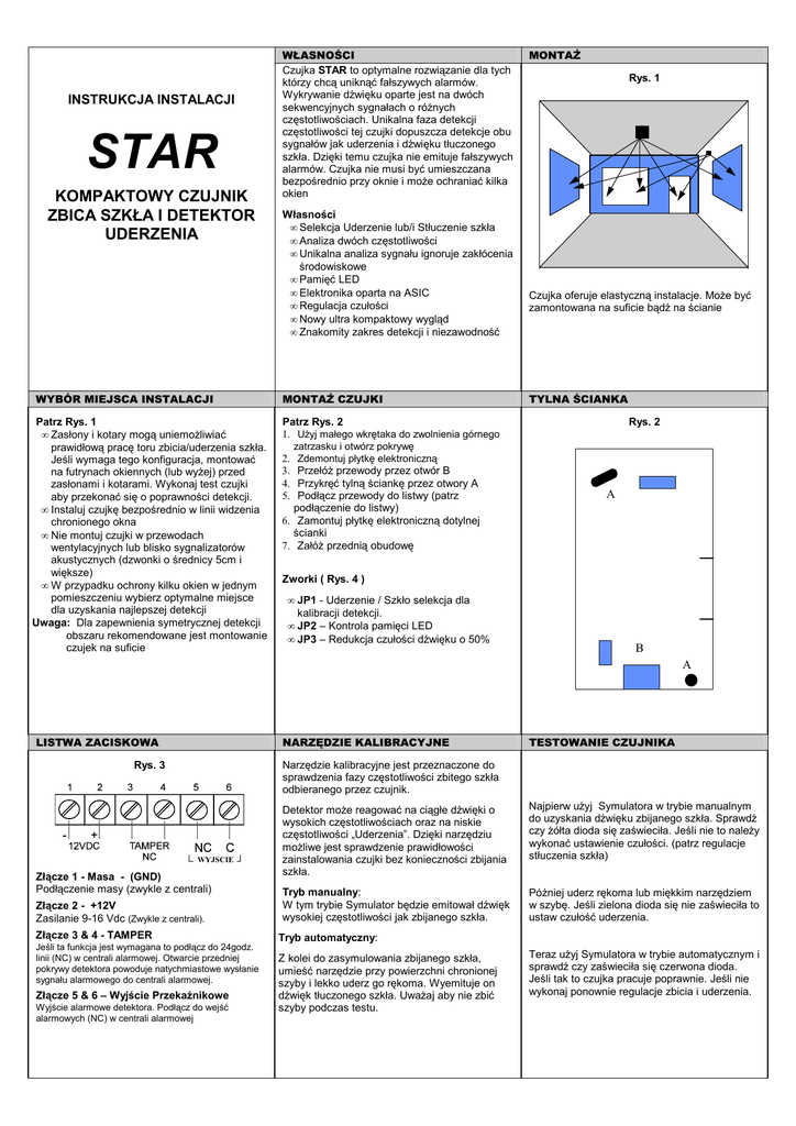 INSTRUKCJA INSTALACJI STAR KOMPAKTOWY CZUJNIK ZBICA SZKŁA I DETEKTOR UDERZENIA WYBÓR MIEJSCA INSTALACJI Patrz Rys. 1 • Zasłony i kotary mogą uniemoŜliwiać prawidłową pracę toru zbicia/uderzenia szkła. Jeśli wymaga tego konfiguracja, montować na futrynach okiennych (lub wyŜej) przed zasłonami i kotarami. Wykonaj test czujki aby przekonać się o poprawności detekcji. • Instaluj czujkę bezpośrednio w linii widzenia chronionego okna • Nie montuj czujki w przewodach wentylacyjnych lub blisko sygnalizatorów akustycznych (dzwonki o średnicy 5cm i większe) • W przypadku ochrony kilku okien w jednym pomieszczeniu wybierz optymalne miejsce dla uzyskania najlepszej detekcji Uwaga: Dla zapewnienia symetrycznej detekcji obszaru rekomendowane jest montowanie czujek na suficie WŁASNOŚCI Czujka STAR to optymalne rozwiązanie dla tych którzy chcą uniknąć fałszywych alarmów. Wykrywanie dźwięku oparte jest na dwóch sekwencyjnych sygnałach o róŜnych częstotliwościach. Unikalna faza detekcji częstotliwości tej czujki dopuszcza detekcje obu sygnałów jak uderzenia i dźwięku tłuczonego szkła. Dzięki temu czujka nie emituje fałszywych alarmów. Czujka nie musi być umieszczana bezpośrednio przy oknie i moŜe ochraniać kilka okien Własności • Selekcja Uderzenie lub/i Stłuczenie szkła • Analiza dwóch częstotliwości • Unikalna analiza sygnału ignoruje zakłócenia środowiskowe • Pamięć LED • Elektronika oparta na ASIC • Regulacja czułości • Nowy ultra kompaktowy wygląd • Znakomity zakres detekcji i niezawodność MONTAś CZUJKI MONTAś Rys. 1 Czujka oferuje elastyczną instalacje. MoŜe być zamontowana na suficie bądź na ścianie TYLNA ŚCIANKA Patrz Rys. 2 1. UŜyj małego wkrętaka do zwolnienia górnego 2. 3. 4. 5. Rys. 2 zatrzasku i otwórz pokrywę Zdemontuj płytkę elektroniczną PrzełóŜ przewody przez otwór B Przykręć tylną ściankę przez otwory A Podłącz przewody do listwy (patrz podłączenie do listwy) 6. Zamontuj płytkę elektroniczną dotylnej ścianki 7. ZałóŜ przednią obudowę A Zworki ( Rys. 4 ) • JP1 - Uderzenie / Szkło selekcja dla kalibracji detekcji. • JP2 – Kontrola pamięci LED • JP3 – Redukcja czułości dźwięku o 50% B A LISTWA ZACISKOWA NARZĘDZIE KALIBRACYJNE TESTOWANIE CZUJNIKA Narzędzie kalibracyjne jest przeznaczone do sprawdzenia fazy częstotliwości zbitego szkła odbieranego przez czujnik. Rys. 3 WYJSCIE Złącze 1 - Masa - (GND) Podłączenie masy (zwykle z centrali) Złącze 2 - +12V Zasilanie 9-16 Vdc (Zwykle z centrali). Złącze 3 & 4 - TAMPER Jeśli ta funkcja jest wymagana to podłącz do 24godz. linii (NC) w centrali alarmowej. Otwarcie przedniej pokrywy detektora powoduje natychmiastowe wysłanie sygnału alarmowego do centrali alarmowej. Złącze 5 & 6 – Wyjście Przekaźnikowe Wyjście alarmowe detektora. Podłącz do wejść alarmowych (NC) w centrali alarmowej Detektor moŜe reagować na ciągłe dźwięki o wysokich częstotliwościach oraz na niskie częstotliwości „Uderzenia”. Dzięki narzędziu moŜliwe jest sprawdzenie prawidłowości zainstalowania czujki bez konieczności zbijania szkła. Najpierw uŜyj Symulatora w trybie manualnym do uzyskania dźwięku zbijanego szkła. Sprawdź czy Ŝółta dioda się zaświeciła. Jeśli nie to naleŜy wykonać ustawienie czułości. (patrz regulacje stłuczenia szkła) Tryb manualny: W tym trybie Symulator będzie emitował dźwięk wysokiej częstotliwości jak zbijanego szkła. Później uderz rękoma lub miękkim narzędziem w szybę. Jeśli zielona dioda się nie zaświeciła to ustaw czułość uderzenia. Tryb automatyczny: Z kolei do zasymulowania zbijanego szkła, umieść narzędzie przy powierzchni chronionej szyby i lekko uderz go rękoma. Wyemituje on dźwięk tłuczonego szkła. UwaŜaj aby nie zbić szyby podczas testu. Teraz uŜyj Symulatora w trybie automatycznym i sprawdź czy zaświeciła się czerwona dioda. Jeśli tak to czujka pracuje poprawnie. Jeśli nie wykonaj ponownie regulacje zbicia i uderzenia. REGULACJA STŁUCZENIA SZKŁA REGULACJA UDERZENIA Do regulacji stłuczenia szkła (ustawienia czułości) umieść zworkę JP1 zgodnie z oznaczeniem GLASS (patrz rys 4, podłączenie środkowego i górnego pina) Zielona dioda powinna się świecić. MoŜna teraz wykonać regulację poprzez obracanie potencjometrem oznaczonym jako GLASS Operuj Symulatorem i ustawiaj potencjometr w stronę zgodną do obrotu wskazówek zegara do zwiększenia czułości i odwrotnie do jej zmniejszenia aŜ do zaświecenia się śółtej diody. Pamiętaj Ŝe regulacja nie przyniesie efektu bez podłączenia zworki do górnego i środkowego pina Aby ustawić poziom uderzenia umieść zworkę JP1 zgodnie z oznaczeniem SHOCK . (połączenie środkowego pina z dolnym)-patrz rys 4. śółta dioda powinna się świecić. MoŜesz ustawić teraz wymaganą czułość poprzez obracanie potencjometru oznaczonego SHOCK. Uderz delikatnie w szybę i ustaw potencjometr w stronę zgodną z obrotem wskazówek zegara do zwiększenia czułości lub odwrotnie do jej zmniejszenia aŜ do zaświecenia się Zielonej diody. Pamiętaj Ŝe regulacja nie przyniesie efektu bez podłączenia zworki do dolnego i środkowego pina Uwaga Jeśli zworka jest ustawiona na GLASS to tylko odbiera wysokie częstotliwości (tłuczenie szkła) TESTY KOŃCOWE • Uwaga Jeśli zworka jest ustawiona na SHOCK to tylko odbiera niskie częstotliwości poprzedzające zbijanie szkła (uderzenie) UKŁAD PŁYTKI Funkcja pamięci alarmu umoŜliwia identyfikacje alarmów z wielu czujek połączonych do tej samej linii w centrali alarmowej. Aby ją załączyć umieść zworkę JP2 (MEM) w oba piny - patrz rys 4 W przypadku alarmu, Czerwona dioda będzie się świecić, aŜ do zresetowania pamięci. Aby zresetować pamięć, wyłącz (rozłącz) zasilanie (+12V) z listwy połączeniowej na min. 15s, a potem włącz zasilanie (moŜe zostać do tego uŜyty klucz 