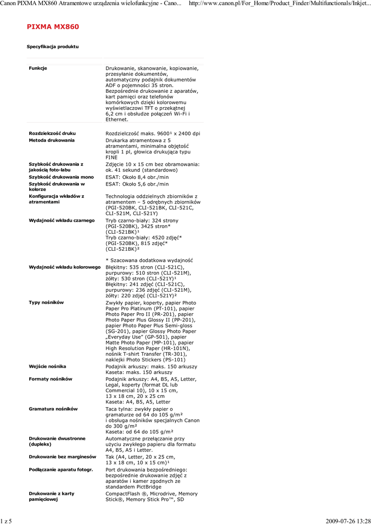 Canon PIXMA MX860 Atramentowe urządzenia wielofunkcyjne - Cano... 1z5 http://www.canon.pl/For_Home/Product_Finder/Multifunctionals/Inkjet... PIXMA MX860 Specyfikacja produktu Funkcje Drukowanie, skanowanie, kopiowanie, przesyłanie dokumentów, automatyczny podajnik dokumentów ADF o pojemności 35 stron. Bezpośrednie drukowanie z aparatów, kart pamięci oraz telefonów komórkowych dzięki kolorowemu wyświetlaczowi TFT o przekątnej 6,2 cm i obsłudze połączeń Wi-Fi i Ethernet. Rozdzielczość druku Rozdzielczość maks. 9600¹ x 2400 dpi Drukarka atramentowa z 5 atramentami, minimalna objętość kropli 1 pl, głowica drukująca typu FINE Zdjęcie 10 x 15 cm bez obramowania: ok. 41 sekund (standardowo) ESAT: Około 8,4 obr./min ESAT: Około 5,6 obr./min Metoda drukowania Szybkość drukowania z jakością foto-labu Szybkość drukowania mono Szybkość drukowania w kolorze Konfiguracja wkładów z atramentami Wydajność wkładu czarnego Wydajność wkładu kolorowego Typy nośników Wejście nośnika Formaty nośników Gramatura nośników Drukowanie dwustronne (dupleks) Drukowanie bez marginesów Podłączanie aparatu fotogr. Drukowanie z karty pamięciowej Technologia oddzielnych zbiorników z atramentem – 5 odrębnych zbiorników (PGI-520BK, CLI-521BK, CLI-521C, CLI-521M, CLI-521Y) Tryb czarno-biały: 324 strony (PGI-520BK), 3425 stron* (CLI-521BK)¹ Tryb czarno-biały: 4520 zdjęć* (PGI-520BK), 815 zdjęć* (CLI-521BK)² * Szacowana dodatkowa wydajność Błękitny: 535 stron (CLI-521C), purpurowy: 510 stron (CLI-521M), żółty: 530 stron (CLI-521Y)¹ Błękitny: 241 zdjęć (CLI-521C), purpurowy: 236 zdjęć (CLI-521M), żółty: 220 zdjęć (CLI-521Y)² Zwykły papier, koperty, papier Photo Paper Pro Platinum (PT-101), papier Photo Paper Pro II (PR-201), papier Photo Paper Plus Glossy II (PP-201), papier Photo Paper Plus Semi-gloss (SG-201), papier Glossy Photo Paper „Everyday Use” (GP-501), papier Matte Photo Paper (MP-101), papier High Resolution Paper (HR-101N), nośnik T-shirt Transfer (TR-301), naklejki Photo Stickers (PS-101) Podajnik arkuszy: maks. 150 arkuszy Kaseta: maks. 150 arkuszy Podajnik arkuszy: A4, B5, A5, Letter, Legal, koperty (format DL lub Commercial 10), 10 x 15 cm, 13 x 18 cm, 20 x 25 cm Kaseta: A4, B5, A5, Letter Taca tylna: zwykły papier o gramaturze od 64 do 105 g/m² i obsługa nośników specjalnych Canon do 300 g/m² Kaseta: od 64 do 105 g/m² Automatyczne przełączanie przy użyciu zwykłego papieru dla formatu A4, B5, A5 i Letter. Tak (A4, Letter, 20 x 25 cm, 13 x 18 cm, 10 x 15 cm)¹ Port drukowania bezpośredniego: bezpośrednie drukowanie zdjęć z aparatów i kamer zgodnych ze standardem PictBridge CompactFlash ®, Microdrive, Memory Stick®, Memory Stick Pro™, SD Memory Card ®, MultiMedia Card™, 2009-07-26 13:28 Canon PIXMA MX860 Atramentowe urządzenia wielofunkcyjne - Cano... 2z5 Inne Funkcje http://www.canon.pl/For_Home/Product_Finder/Multifunctionals/Inkjet... Memory Card ®, MultiMedia Card™, MultiMedia Card Plus™ i SDHC Memory Card. xD-PictureCard™ ¹, xD-PictureCard Type M™ ¹, xD-PictureCard Type H™ ¹, Memory Stick Duo™ ¹, Memory Stick PRO Duo™ ¹, Memory Stick Micro™ ¹, RS-MMC™ ¹, miniSD Card™ ¹, microSD Card™ ¹, miniSDHC Card™ ¹ oraz microSDHC Card™ ¹. Drukowanie z wielokrotnym wyborem (wybór wielu obrazów i określonej liczby poszczególnych obrazów), drukowanie indeksu zdjęć, drukowanie wszystkich zdjęć, drukowanie DPOF, drukowanie układu, drukowanie naklejek, drukowanie z informacjami EXIF, arkusz indeksu zdjęć, pokaz slajdów, drukowanie numeru pliku i daty Poprawa obrazów w przypadku bezpośredniego drukowania z karty: funkcja Auto Photo Fix, funkcja Vivid Photo, funkcja Photo Optimizer PRO, redukcja szumów, rozjaśnianie twarzy, jasność, kontrast, barwy (barwy skóry), sepia/symulacja ilustracji, redukcja efektu czerwonych oczu, funkcja Image Optimizer, kadrowanie Photo Optimizer PRO (tylko system Windows), Image Optimizer (tylko system Windows), Photo Noise Reduction, Vivid Photo, Monochrome Effects (sepia, niebieski, zielony, różowy, wybór koloru), Simple Illustration Faks samodzielny Faks PC Faks kolorowy (zgodność z ITU-T.30E) Szybkość transmisji mono/kolor Szybkość modemu Metoda kompresji mono/kolor Rozdzielczość faksu Gradacja odcieni szarości/Głębia koloru Automatyczny podajnik dokumentów Wysyłanie z pamięci Pamięć faksów Podwójny dostęp Wybieranie jednodotykowe Tak Windows: za pośrednictwem faksmodemu (w urządzeniu wielofunkcyjnym)*, Mac: niedostępne *1 lokalizacja, tylko transmisja cz-b Tak Monochromatyczne: ok. 3 s/stronę (33,6 kb/s) (w oparciu o ustawienia domyślne z wykorzystaniem arkusza nr 1 normy ITU-T) ¹ Kolorowe: ok. 1 min/stronę (33,6 kb/s) (w oparciu o ustawienia domyślne z wykorzystaniem arkusza testowego Canon Colour Fax Standard Test Sheet) ¹ 33,6 k / 31,2 k / 28,8 k / 26,4 k / 24 k / 21,6 k / 19,2 k / 16,8 k / 14,4 k / 12 k / 9,6 k / 7,2 k / 4,8 k / 2,4 kb/s (automatyczna negocjacja prędkości) Tryb czarno-biały: MH, MR, MMR Tryb kolorowy: JPEG Tryb monochromatyczny: 8 piks./mm x 3,85 piks./mm (Standard), 8 piks./mm x 7,7 piks./mm (Dokładna), 300 dpi x 300 dpi (Bardzo dokładna) Tryb kolorowy: 200 x 200 dpi (Foto) Tryb czarno-biały: 256 poziomów, Tryb kolorowy: 24 bity (pełen kolor) (8 bitów na każdy kolor RGB) Do 35 arkuszy (jednostronnych) Tak Do 250 stron (licznik stron w oparciu o arkusz nr 1 normy ITU-T lub arkusz testowy nr 1 Canon Fax Standard) Tak maks. 5 2009-07-26 13:28 Canon PIXMA MX860 Atramentowe urządzenia wielofunkcyjne - Cano... 3z5 Wybieranie kodowe Grupy numerów Powtarzanie wybierania Autom. przełączanie faks/telefon http://www.canon.pl/For_Home/Product_Finder/Multifunctionals/Inkjet... maks. 100 lokalizacji maks. 104 lokalizacje Tak Tak (ręcznie) Podłączanie autom. zgłoszeniowego Tak Zdalne odbieranie Tak Tak Tak, zgodność z normą ITU-T T.30 Rozsyłanie sekwencyjne Tryb