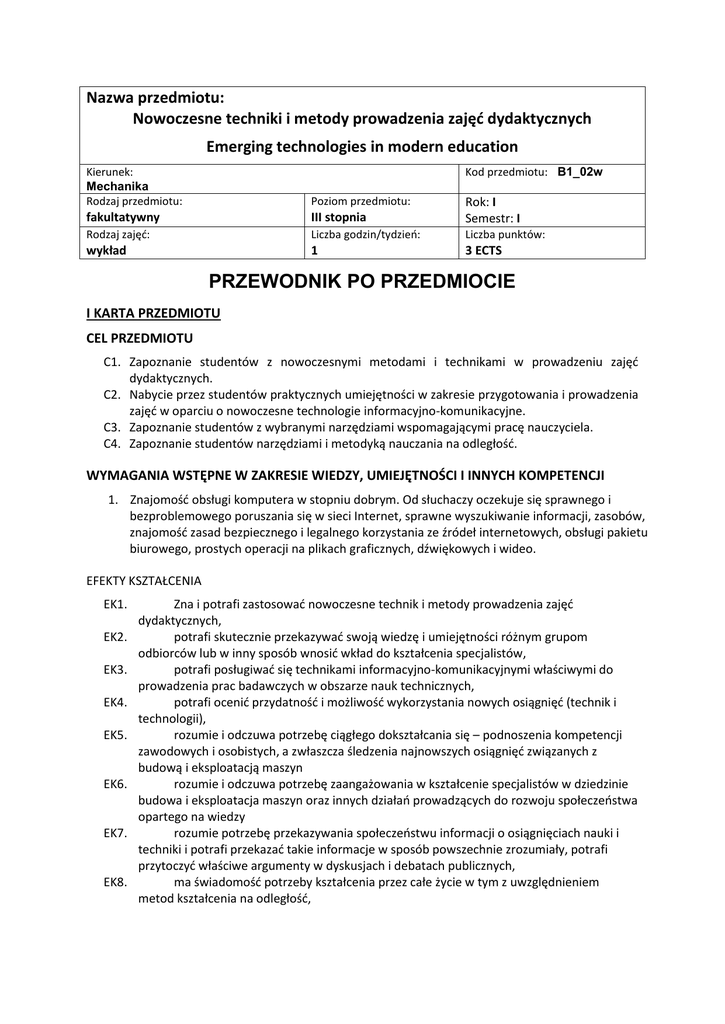Nazwa przedmiotu: Nowoczesne techniki i metody prowadzenia zajęć dydaktycznych Emerging technologies in modern education Kierunek: Mechanika Rodzaj przedmiotu: Kod przedmiotu: B1_02w Poziom przedmiotu: fakultatywny III stopnia Rok: I Semestr: I Rodzaj zajęć: Liczba godzin/tydzień: Liczba punktów: wykład 1 3 ECTS PRZEWODNIK PO PRZEDMIOCIE I KARTA PRZEDMIOTU CEL PRZEDMIOTU C1. Zapoznanie studentów z nowoczesnymi metodami i technikami w prowadzeniu zajęć dydaktycznych. C2. Nabycie przez studentów praktycznych umiejętności w zakresie przygotowania i prowadzenia zajęć w oparciu o nowoczesne technologie informacyjno-komunikacyjne. C3. Zapoznanie studentów z wybranymi narzędziami wspomagającymi pracę nauczyciela. C4. Zapoznanie studentów narzędziami i metodyką nauczania na odległość. WYMAGANIA WSTĘPNE W ZAKRESIE WIEDZY, UMIEJĘTNOŚCI I INNYCH KOMPETENCJI 1. Znajomość obsługi komputera w stopniu dobrym. Od słuchaczy oczekuje się sprawnego i bezproblemowego poruszania się w sieci Internet, sprawne wyszukiwanie informacji, zasobów, znajomość zasad bezpiecznego i legalnego korzystania ze źródeł internetowych, obsługi pakietu biurowego, prostych operacji na plikach graficznych, dźwiękowych i wideo. EFEKTY KSZTAŁCENIA EK1. EK2. EK3. EK4. EK5. EK6. EK7. EK8. Zna i potrafi zastosować nowoczesne technik i metody prowadzenia zajęć dydaktycznych, potrafi skutecznie przekazywać swoją wiedzę i umiejętności różnym grupom odbiorców lub w inny sposób wnosić wkład do kształcenia specjalistów, potrafi posługiwać się technikami informacyjno-komunikacyjnymi właściwymi do prowadzenia prac badawczych w obszarze nauk technicznych, potrafi ocenić przydatność i możliwość wykorzystania nowych osiągnięć (technik i technologii), rozumie i odczuwa potrzebę ciągłego dokształcania się – podnoszenia kompetencji zawodowych i osobistych, a zwłaszcza śledzenia najnowszych osiągnięć związanych z budową i eksploatacją maszyn rozumie i odczuwa potrzebę zaangażowania w kształcenie specjalistów w dziedzinie budowa i eksploatacja maszyn oraz innych działań prowadzących do rozwoju społeczeństwa opartego na wiedzy rozumie potrzebę przekazywania społeczeństwu informacji o osiągnięciach nauki i techniki i potrafi przekazać takie informacje w sposób powszechnie zrozumiały, potrafi przytoczyć właściwe argumenty w dyskusjach i debatach publicznych, ma świadomość potrzeby kształcenia przez całe życie w tym z uwzględnieniem metod kształcenia na odległość, TREŚCI PROGRAMOWE Liczba godzin Forma zajęć – wykład online W1. W2. W3. W4. W5. W6. W7. W8. W9. W10. W11. W12. W13. W14. W15. Narzędzia i techniki wspierające pracę dydaktyczną – Społecznościowe zakładki - Delicious. Narzędzia i techniki wspierające pracę dydaktyczną – Praca grupowa – Wiki. Narzędzia i techniki wspierające pracę dydaktyczną – Blog w pracy edukatora. Narzędzia i techniki wspierające pracę dydaktyczną – aplikacje Google Apps. Urządzenia mobilne w edukacji – m-learning Urządzenia mobilne w edukacji – m-learning Narzędzia i techniki wspierające pracę dydaktyczną – ankiety i kwestionariusze online. Alternatywne narzędzia do prezentacji - Prezi. Alternatywne narzędzia do prezentacji - Sliderocket. Narzędzia do wideokonferencji - WiZiQ. Narzędzia do wideokonferencji – przegląd rozwiązań. Nowoczesne tendencje w dydaktyce – e-learning. Nowoczesne tendencje w dydaktyce – e-learning – zapoznanie z platformą. Nowoczesne tendencje w dydaktyce – e-learning – narzędzia do autoringu. Prezentacja rozwiązań słuchaczy. 1 1 1 1 1 1 1 1 1 1 1 1 1 1 1 NARZĘDZIA DYDAKTYCZNE 1. 2. 3. 4. 5. Zajęcia z wykorzystaniem metod i narzędzi do kształcenia online praca metodą projektu, praca grupowa, zespołowa instrukcje multimedialne do wykonania ćwiczeń prezentacje multimedialne komputer z dostępem do Internetu, kamera, słuchawki. SPOSOBY OCENY ( F – FORMUJĄCA, P – PODSUMOWUJĄCA) F1. – ocena z zadań projektowych sprawdzających umiejętności wykorzystania nabytej wiedzy w praktyce*) F2. – oceny z testów i quizów sprawdzających wiedzę*) F3. – aktywność na zajęciach P1. – wypadkowa ocen uzyskanych w trakcie semestru *) warunkiem uzyskania zaliczenia jest otrzymanie pozytywnych ocen ze wszystkich ćwiczeń, OBCIĄŻENIE PRACĄ DOKTORANTA Forma aktywności Godziny kontaktowe z prowadzącym Średnia liczba godzin na zrealizowanie aktywności 15P 15h Zadania realizowane online 45 h Konsultacje z prowadzącym 5h Zapoznanie się ze wskazaną literaturą, przygotowanie do zajęć, wykonanie pracy końcowej 2 25 h Suma 90 h SUMARYCZNA LICZBA PUNKTÓW ECTS DLA PRZEDMIOTU Liczba punktów ECTS, którą student uzyskuje na zajęciach wymagających bezpośredniego udziału prowadzącego Liczba punktów ECTS, którą student uzyskuje w ramach zajęć o charakterze praktycznym, w tym zajęć laboratoryjnych i projektowych 3 ECTS 1 ECTS 1 ECTS LITERATURA PODSTAWOWA I UZUPEŁNIAJĄCA 1. Problemy nowoczesnej edukacji, red. Majkiewicz A., Walasek T.A.: Podstawy zarządzania jakością, Wyd. Wyż. Szkoły Lingwistycznej, Częstochowa 2011. 2. Prawo mediów, red. Barta J., Markiewicz R., Matlak A., Wyd. Prawnicze LexisNexis, Warszawa 2008 3. Hyla M., Przewodnik po e-learningu, Wolters Kluwer, Kraków 2008. 4. E-mentor PROWADZĄCY PRZEDMIOT ( IMIĘ, NAZWISKO, ADRES E-MAIL) 1. dr inż. Tomasz Walasek, [email protected] MACIERZ REALIZACJI EFEKTÓW KSZTAŁCENIA Efekt kształcenia Odniesienie danego efektu do efektów zdefiniowanych dla całego programu (PEK) Cele przedmiotu Treści programowe Narzędzia dydaktyczne EK1 K_W11 C1-C4 W1-W15 1-7 EK2 – EK4 K_U05 K_U07 K_U13 C1-C4 W1-P15 1-7 EK5-EK8 K_K01 K_K06 K_K07 C1-C4 W1-P15 1-7 Sposób oceny F1 F2 F3 P1 F1 F2 F3 P1 P1 3 II. FORMY OCENY - SZCZEGÓŁY Na pierwszych zajęciach prowadzący przedstawia skalę ocen i sposób weryfikacji efektów kształcenia na studiach