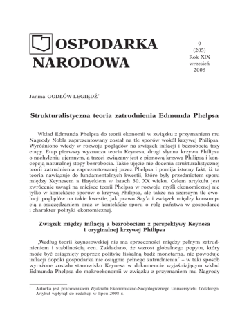 OSPODARKA NARODOWA 9 (205) Rok XIX wrzesień 2008 Janina Godłów-Legiędź* Strukturalistyczna teoria zatrudnienia Edmunda Phelpsa Wkład Edmunda Phelpsa do teorii ekonomii w związku z przyznaniem mu Nagrody Nobla zaprezentowany został na tle sporów wokół krzywej Philipsa. Wyróżniono wtedy w rozwoju poglądów na związek inflacji i bezrobocia trzy etapy. Etap pierwszy wyznacza teoria Keynesa, drugi słynna krzywa Philipsa o nachyleniu ujemnym, a trzeci związany jest z pionową krzywą Philipsa i koncepcją naturalnej stopy bezrobocia. Takie ujęcie nie docenia strukturalistycznej teorii zatrudnienia zaprezentowanej przez Phelpsa i pomija istotny fakt, iż ta teoria nawiązuje do fundamentalnych kwestii, które były przedmiotem sporu między Keynesem a Hayekiem w latach 30. XX wieku. Celem artykułu jest zwrócenie uwagi na miejsce teorii Phelpsa w rozwoju myśli ekonomicznej nie tylko w kontekście sporów o krzywą Philipsa, ale także na szerszym tle ewolucji poglądów na takie kwestie, jak prawo Say’a i związek między konsumpcją a oszczędzaniem oraz w kontekście sporu o rolę państwa w gospodarce i charakter polityki ekonomicznej. Związek między inflacją a bezrobociem z perspektywy Keynesa i oryginalnej krzywej Philipsa „Według teorii keynesowskiej nie ma sprzeczności między pełnym zatrudnieniem i stabilnością cen. Zakładano, że wzrost globalnego popytu, który może być osiągnięty poprzez politykę fiskalną bądź monetarną, nie powoduje inflacji dopóki gospodarka nie osiągnie pełnego zatrudnienia” – w taki sposób wyrażone zostało stanowisko Keynesa w dokumencie wyjaśniającym wkład Edmunda Phelpsa do makroekonomii w związku z przyznaniem mu Nagrody * Autorka jest pracownikiem Wydziału Ekonomiczno-Socjologicznego Uniwersytetu Łódzkiego. Artykuł wpłynął do redakcji w lipcu 2008 r. GOSPODARKA NARODOWA Nr 9/2008 Nobla [Royal Swedish Academy of Sciences, 2006, s. 2-3]. Jednakże Ogólna teoria zatrudnienia procentu i pieniądza nie uzasadnia takiej jednoznacznej interpretacji stanowiska Keynesa. Już definicja bezrobocia niedobrowolnego przedstawiona na początku dzieła Keynesa wskazuje, iż autor wiąże proces dochodzenia do pełnego zatrudnienia ze wzrostem cen: „Ludzie są bezrobotni nie z własnej woli, jeżeli – w wypadku niewielkiej zwyżki artykułów konsumpcji robotniczej w porównaniu z płacą nominalną – zarówno łączna podaż siły roboczej gotowej do podjęcia pracy za wynagrodzenie według bieżących stawek płac nominalnych, jak i łączny popyt na nią przy tych stawkach byłby większy od istniejącego poziomu zatrudnienia” [Keynes, 2003, s. 16]. Definicja ta odpowiada przekonaniu, że wzrost zatrudnienia związany jest z obniżką płac realnych, a obniżka ta jest bardziej prawdopodobna poprzez wzrost cen dóbr, aniżeli przez obniżkę płac nominalnych. Rozważając natomiast problem zatrudnienia z punktu widzenia przedsiębiorców Keynes pisze, że bezrobocie występuje wówczas, gdy przy danej wielkości zatrudnienia N oczekiwany przychód będący funkcją łącznego popytu jest wyższy od ceny łącznej podaży, „zachęci to przedsiębiorców do zwiększenia stanu zatrudnienia ponad N i – gdy będzie to konieczne – do zwiększenia kosztów wskutek konkurencyjnego ubiegania się o czynniki produkcji” [Keynes, 2003, s. 24]. W obu definicjach bezrobocia wyraźnie sygnalizuje się istnienie presji inflacyjnej w sytuacji wychodzenia gospodarki ze stanu bezrobocia. Warto odnotować także następujący fragment rozumowania Keynesa: „Gdy osiągnie się stan pełnego zatrudnienia, każdy wysiłek w kierunku dalszego zwiększenia inwestycji musi doprowadzić do nieustannego zwyżkowego ruchu cen, bez względu na to, jaka jest skłonność do konsumpcji. Inaczej mówiąc dojdziemy wtedy do prawdziwej inflacji. Zanim jednak ten punkt zostanie osiągnięty, rosnącym cenom będzie towarzyszył wzrost łącznego dochodu realnego” [Keynes, 2003, s. 106]. Przekonanie Keynesa, iż polityka skierowana na zwiększanie globalnego popytu jest właściwym środkiem zwalczania bezrobocia związane było z poglądem, że wzrost popytu pociąga za sobą z jednej strony wzrost produkcji i zatrudnienia, a z drugiej wzrost cen. Ponieważ zasoby produkcyjne nie są jednorodne i wzajemnie zastępowalne i niemożliwe jest utrzymanie stałej płacy nominalnej, wzrost ilości pieniądza i efektywnego popytu rozładowuje się częściowo w tym, że wzrasta zatrudnienie, a częściowo w tym, że rosną ceny. „Zamiast stałych cen przy bezrobociu i zamiast cen rosnących proporcjonalnie do ilości pieniądza przy pełnym zatrudnieniu, mamy zatem w rzeczywistości ceny, które rosną stopniowo w miarę wzrostu zatrudnienia” [Keynes, 2003, s. 269, por. s. 274-275]. U podstaw nawoływania Keynesa do ekspansywnej polityki nie leżało przekonanie, że polityka taka nie może powodować tendencji do inflacji, ale raczej przekonanie, że lekka inflacja nie jest zbyt wysoką ceną osiągania stanu pełnego zatrudnienia. Keynes uważał, że dopóki wzrostowi cen towarzyszy wzrost produkcji mamy stany „półinflacyjne”. Zanim gospodarka osiąga punkt krytyczny, w którym płace nominalne rosną proporcjonalnie do wzrostu cen artykułów konsumpcji robotniczej, mamy serię punktów „półkrytycznych”. Dopiero stan Janina Godłów-Legiędź, Strukturalistyczna teoria zatrudnienia Edmunda Phelpsa określony jako punkt krytyczny utożsamia Keynes z prawdziwą bądź „absolutną inflacją”. Interpretacja myśli keynesowskiej zasugerowana na wstępie przedstawiana jest w podręcznikach makroekonomii w postaci krzywej globalnej podaży w formie odwróconej litery L. Silna pozycja tej interpretacji spowodowana jest zapewne jej walorami dydaktycznymi. Mamy świat ekonomii klasycznej prezentowany za pomocą pionowej krzywej globalnej podaży i świat ekonomii keynesowskiej z odcinkiem doskonale elastycznej krzywej p