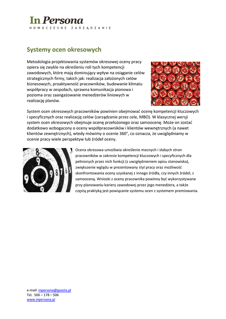 Systemy ocen okresowych Metodologia projektowania systemów okresowej oceny pracy opiera się zwykle na określeniu roli tych kompetencji zawodowych, które mają dominujący wpływ na osiąganie celów strategicznych firmy, takich jak: realizacja założonych celów biznesowych, proaktywność pracowników, budowanie klimatu współpracy w zespołach, sprawna komunikacja pionowa i pozioma oraz zaangażowanie menedżerów liniowych w realizację planów. System ocen okresowych pracowników powinien obejmować ocenę kompetencji kluczowych i specyficznych oraz realizację celów (zarządzanie przez cele, MBO). W klasycznej wersji system ocen okresowych obejmuje ocenę przełożonego oraz samoocenę. Może on zostać dodatkowo wzbogacony o oceny współpracowników i klientów wewnętrznych (a nawet klientów zewnętrznych), wtedy mówimy o ocenie 360°, co oznacza, że uwzględniamy w ocenie pracy wiele perspektyw lub źródeł oceny. Ocena okresowa umożliwia określenie mocnych i słabych stron pracowników w zakresie kompetencji kluczowych i specyficznych dla pełnionych przez nich funkcji (z uwzględnieniem opisu stanowiska), zwiększenie wglądu w prezentowany styl pracy oraz możliwość skonfrontowania oceny uzyskanej z innego źródła, czy innych źródeł, z samooceną. Wnioski z oceny pracownika powinny być wykorzystywane przy planowaniu kariery zawodowej przez jego menedżera, a także częstą praktyką jest powiązanie systemu ocen z systemem premiowania. e-mail: [email protected] Tel. 506 – 178 – 506 www.inpersona.pl