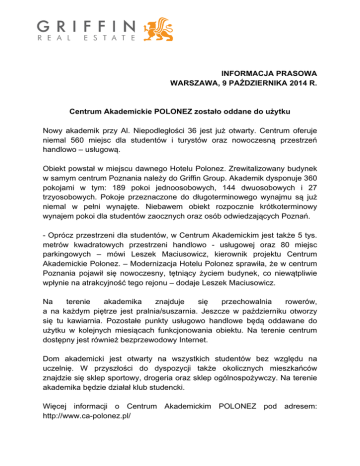 INFORMACJA PRASOWA WARSZAWA, 9 PAŹDZIERNIKA 2014 R. Centrum Akademickie POLONEZ zostało oddane do użytku Nowy akademik przy Al. Niepodległości 36 jest już otwarty. Centrum oferuje niemal 560 miejsc dla studentów i turystów oraz nowoczesną przestrzeń handlowo – usługową. Obiekt powstał w miejscu dawnego Hotelu Polonez. Zrewitalizowany budynek w samym centrum Poznania należy do Griffin Group. Akademik dysponuje 360 pokojami w tym: 189 pokoi jednoosobowych, 144 dwuosobowych i 27 trzyosobowych. Pokoje przeznaczone do długoterminowego wynajmu są już niemal w pełni wynajęte. Niebawem obiekt rozpocznie krótkoterminowy wynajem pokoi dla studentów zaocznych oraz osób odwiedzających Poznań. - Oprócz przestrzeni dla studentów, w Centrum Akademickim jest także 5 tys. metrów kwadratowych przestrzeni handlowo - usługowej oraz 80 miejsc parkingowych – mówi Leszek Maciusowicz, kierownik projektu Centrum Akademickie Polonez. – Modernizacja Hotelu Polonez sprawiła, że w centrum Poznania pojawił się nowoczesny, tętniący życiem budynek, co niewątpliwie wpłynie na atrakcyjność tego rejonu – dodaje Leszek Maciusowicz. Na terenie akademika znajduje się przechowalnia rowerów, a na każdym piętrze jest pralnia/suszarnia. Jeszcze w październiku otworzy się tu kawiarnia. Pozostałe punkty usługowo handlowe będą oddawane do użytku w kolejnych miesiącach funkcjonowania obiektu. Na terenie centrum dostępny jest również bezprzewodowy Internet. Dom akademicki jest otwarty na wszystkich studentów bez względu na uczelnię. W przyszłości do dyspozycji także okolicznych mieszkańców znajdzie się sklep sportowy, drogeria oraz sklep ogólnospożywczy. Na terenie akademika będzie działał klub studencki. Więcej informacji o Centrum Akademickim POLONEZ pod adresem: http://www.ca-polonez.pl/ O GRIFFIN GROUP Griffin Real Estate został założony w 2006 roku jako platforma do zarządzania funduszami, inwestującymi w sektor nieruchomości. Od początku istnienia inwestuje w nie także swój własny kapitał. W marcu 2013 Griffin pozyskał inwestora strategicznego – Oaktree Capital Management, z którym współpracuje od 2010 roku. Oaktree jest hedgingowym funduszem wywodzącym się z USA. Posiada biura na całym świecie, zatrudnia ponad 650 osób oraz zarządza środkami w wysokości prawie 90 miliardów dolarów. Griffin to wiodący na polskim rynku nieruchomości inwestor, który w imieniu zarządzanych przez siebie Funduszy, aktywnie lokuje środki w prestiżowe projekty. Celem strategicznym jest zbudowanie w ciągu kilku lat unikatowego portfela nieruchomości. W portfolio grupy Griffin znajduje się obecnie m.in. Hala Koszyki w Warszawie, Dom Handlowy Renoma we Wrocławiu, Supersam w Katowicach oraz inne obiekty biurowe i handlowe, a także działki inwestycyjne. Griffin wspiera liczne inicjatywy, w tym Fundację Edukacyjną Jana Karskiego. W przestrzeniach należących do Funduszy zarządzanych przez Griffin realizowane są również projekty artystyczne, inicjowane przez Griffin Art Space, instytucję powołaną przez Griffin, aby wspierać sztukę i promować jej obecność w przestrzeni publicznej.