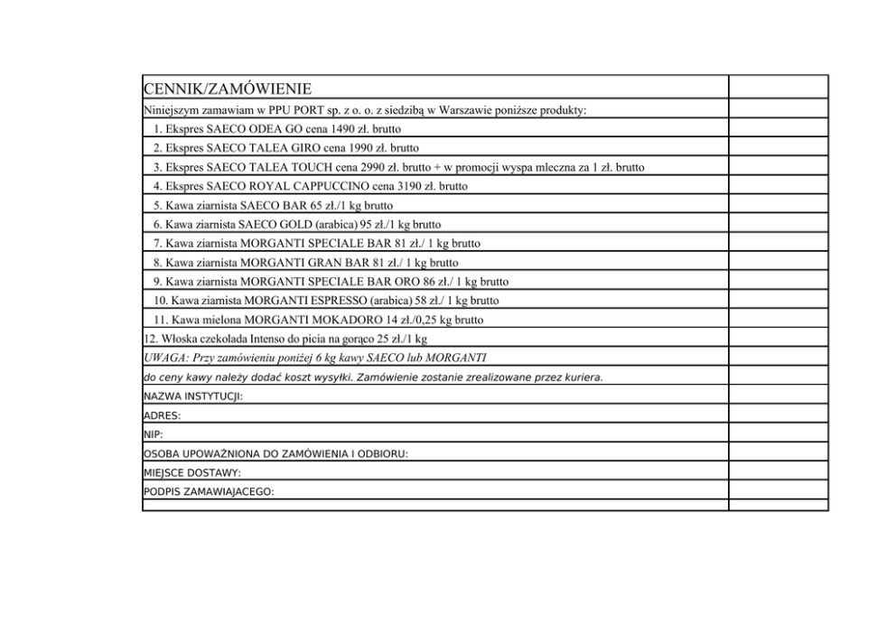 CENNIK/ZAMÓWIENIE Niniejszym zamawiam w PPU PORT sp. z o. o. z siedzibą w Warszawie poniższe produkty: 1. Ekspres SAECO ODEA GO cena 1490 zł. brutto 2. Ekspres SAECO TALEA GIRO cena 1990 zł. brutto 3. Ekspres SAECO TALEA TOUCH cena 2990 zł. brutto + w promocji wyspa mleczna za 1 zł. brutto 4. Ekspres SAECO ROYAL CAPPUCCINO cena 3190 zł. brutto 5. Kawa ziarnista SAECO BAR 65 zł./1 kg brutto 6. Kawa ziarnista SAECO GOLD (arabica) 95 zł./1 kg brutto 7. Kawa ziarnista MORGANTI SPECIALE BAR 81 zł./ 1 kg brutto 8. Kawa ziarnista MORGANTI GRAN BAR 81 zł./ 1 kg brutto 9. Kawa ziarnista MORGANTI SPECIALE BAR ORO 86 zł./ 1 kg brutto 10. Kawa ziarnista MORGANTI ESPRESSO (arabica) 58 zł./ 1 kg brutto 11. Kawa mielona MORGANTI MOKADORO 14 zł./0,25 kg brutto 12. Włoska czekolada Intenso do picia na gorąco 25 zł./1 kg UWAGA: Przy zamówieniu poniżej 6 kg kawy SAECO lub MORGANTI do ceny kawy należy dodać koszt wysyłki. Zamówienie zostanie zrealizowane przez kuriera. NAZWA INSTYTUCJI: ADRES: NIP: OSOBA UPOWAŻNIONA DO ZAMÓWIENIA I ODBIORU: MIEJSCE DOSTAWY: PODPIS ZAMAWIAJACEGO: