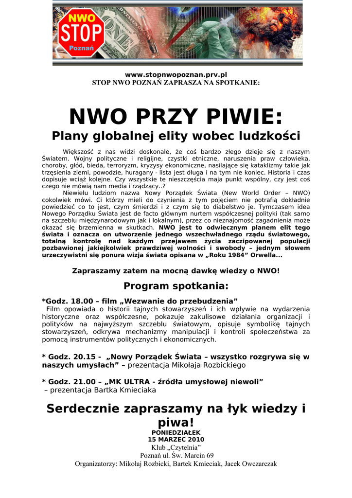 www.stopnwopoznan.prv.pl STOP NWO POZNAŃ ZAPRASZA NA SPOTKANIE: NWO PRZY PIWIE: Plany globalnej elity wobec ludzkości Większość z nas widzi doskonale, że coś bardzo złego dzieje się z naszym Światem. Wojny polityczne i religijne, czystki etniczne, naruszenia praw człowieka, choroby, głód, bieda, terroryzm, kryzysy ekonomiczne, nasilające się kataklizmy takie jak trzęsienia ziemi, powodzie, huragany - lista jest długa i na tym nie koniec. Historia i czas dopisuje wciąż kolejne. Czy wszystkie te nieszczęścia maja punkt wspólny, czy jest coś czego nie mówią nam media i rządzący..? Niewielu ludziom nazwa Nowy Porządek Świata (New World Order – NWO) cokolwiek mówi. Ci którzy mieli do czynienia z tym pojęciem nie potrafią dokładnie powiedzieć co to jest, czym śmierdzi i z czym się to diabelstwo je. Tymczasem idea Nowego Porządku Świata jest de facto głównym nurtem współczesnej polityki (tak samo na szczeblu międzynarodowym jak i lokalnym), przez co nieznajomość zagadnienia może okazać się brzemienna w skutkach. NWO jest to odwiecznym planem elit tego świata i oznacza on utworzenie jednego wszechwładnego rządu światowego, totalną kontrolę nad każdym przejawem życia zaczipowanej populacji pozbawionej jakiejkolwiek prawdziwej wolności i swobody – jednym słowem urzeczywistni się ponura wizja świata opisana w „Roku 1984” Orwella... Zapraszamy zatem na mocną dawkę wiedzy o NWO! Program spotkania: *Godz. 18.00 – film „Wezwanie do przebudzenia” Film opowiada o historii tajnych stowarzyszeń i ich wpływie na wydarzenia historyczne oraz współczesne, pokazuje zakulisowe działania organizacji i polityków na najwyższym szczeblu światowym, opisuje symbolikę tajnych stowarzyszeń, odkrywa mechanizmy manipulacji i kontroli społeczeństwa za pomocą instrumentów politycznych i ekonomicznych. * Godz. 20.15 - „Nowy Porządek Świata – wszystko rozgrywa się w naszych umysłach” – prezentacja Mikołaja Rozbickiego * Godz. 21.00 – „MK ULTRA - źródła umysłowej niewoli” – prezentacja Bartka Kmieciaka Serdecznie zapraszamy na łyk wiedzy i piwa! PONIEDZIAŁEK 15 MARZEC 2010 Klub „Czytelnia” Poznań ul. Św. Marcin 69 Organizatorzy: Mikołaj Rozbicki, Bartek Kmieciak, Jacek Owczarczak