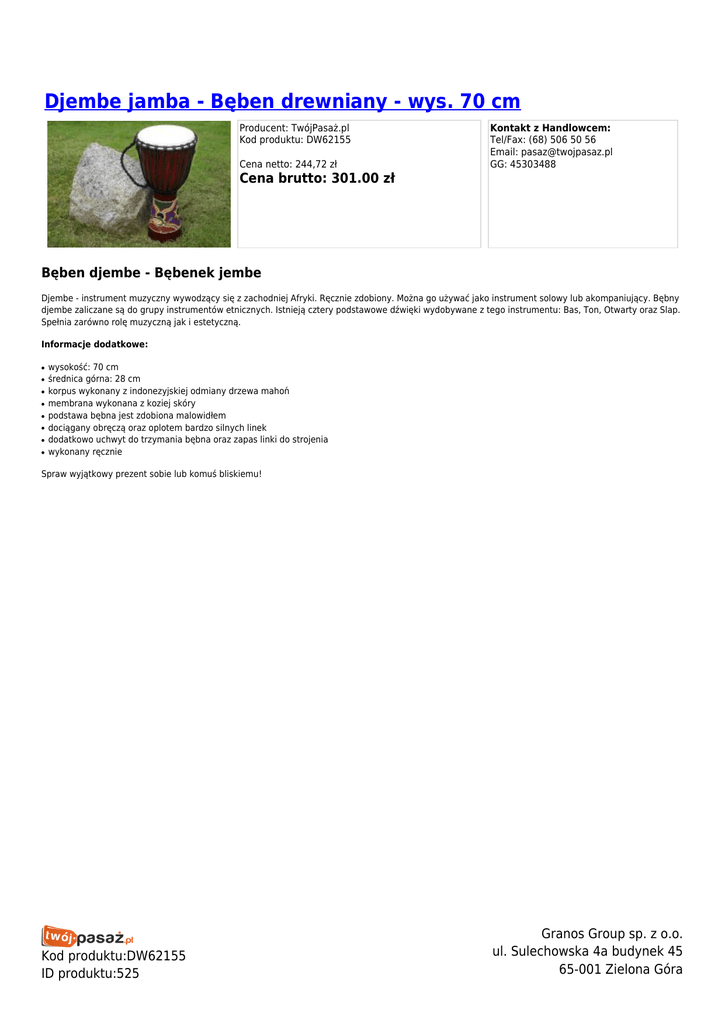 Djembe jamba - Bęben drewniany - wys. 70 cm Producent: TwójPasaż.pl Kod produktu: DW62155 Cena netto: 244,72 zł Kontakt z Handlowcem: Tel/Fax: (68) 506 50 56 Email: [email protected] GG: 45303488 Cena brutto: 301.00 zł Bęben djembe - Bębenek jembe Djembe - instrument muzyczny wywodzący się z zachodniej Afryki. Ręcznie zdobiony. Można go używać jako instrument solowy lub akompaniujący. Bębny djembe zaliczane są do grupy instrumentów etnicznych. Istnieją cztery podstawowe dźwięki wydobywane z tego instrumentu: Bas, Ton, Otwarty oraz Slap. Spełnia zarówno rolę muzyczną jak i estetyczną. Informacje dodatkowe: ● ● ● ● ● ● ● ● wysokość: 70 cm średnica górna: 28 cm korpus wykonany z indonezyjskiej odmiany drzewa mahoń membrana wykonana z koziej skóry podstawa bębna jest zdobiona malowidłem dociągany obręczą oraz oplotem bardzo silnych linek dodatkowo uchwyt do trzymania bębna oraz zapas linki do strojenia wykonany ręcznie Spraw wyjątkowy prezent sobie lub komuś bliskiemu! Kod produktu:DW62155 ID produktu:525 Granos Group sp. z o.o. ul. Sulechowska 4a budynek 45 65-001 Zielona Góra