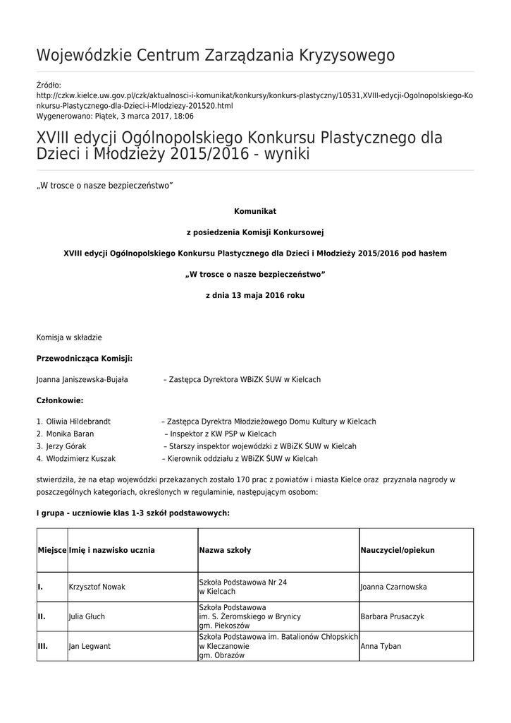 Wojewódzkie Centrum Zarządzania Kryzysowego Źródło: http://czkw.kielce.uw.gov.pl/czk/aktualnosci-i-komunikat/konkursy/konkurs-plastyczny/10531,XVIII-edycji-Ogolnopolskiego-Ko nkursu-Plastycznego-dla-Dzieci-i-Mlodziezy-201520.html Wygenerowano: Piątek, 3 marca 2017, 18:06 XVIII edycji Ogólnopolskiego Konkursu Plastycznego dla Dzieci i Młodzieży 2015/2016 - wyniki „W trosce o nasze bezpieczeństwo” Komunikat z posiedzenia Komisji Konkursowej XVIII edycji Ogólnopolskiego Konkursu Plastycznego dla Dzieci i Młodzieży 2015/2016 pod hasłem „W trosce o nasze bezpieczeństwo” z dnia 13 maja 2016 roku Komisja w składzie Przewodnicząca Komisji: Joanna Janiszewska-Bujała – Zastępca Dyrektora WBiZK ŚUW w Kielcach Członkowie: 1. Oliwia Hildebrandt – Zastępca Dyrektra Młodzieżowego Domu Kultury w Kielcach 2. Monika Baran – Inspektor z KW PSP w Kielcach 3. Jerzy Górak – Starszy inspektor wojewódzki z WBiZK ŚUW w Kielcah 4. Włodzimierz Kuszak – Kierownik oddziału z WBiZK ŚUW w Kielcah stwierdziła, że na etap wojewódzki przekazanych zostało 170 prac z powiatów i miasta Kielce oraz przyznała nagrody w poszczególnych kategoriach, określonych w regulaminie, następującym osobom: I grupa - uczniowie klas 1-3 szkół podstawowych: Miejsce Imię i nazwisko ucznia Nazwa szkoły Nauczyciel/opiekun I. Krzysztof Nowak Szkoła Podstawowa Nr 24 w Kielcach Joanna Czarnowska II. Julia Głuch III. Jan Legwant Szkoła Podstawowa im. S. Żeromskiego w Brynicy Barbara Prusaczyk gm. Piekoszów Szkoła Podstawowa im. Batalionów Chłopskich w Kleczanowie Anna Tyban gm. Obrazów IV. Julia Kacała Ognisko Pracy Pozaszkolnej w Ostrowcu Świętokrzyskim Małgorzata- Winiarska Jóźwik Bożena Sergiel V. Kalina Toborek Zespół Placówek Oświatowych we Włoszczowie Małgorzata Hamera II grupa - uczniowie klas 4-6 szkół podstawowa Miejsce Imię i nazwisko ucznia Nazwa szkoły Nauczyciel/opiekun I. Maja Frank Publiczna Szkoła Podstawowa Nr 3 w Staszowie Beata Rachoń II. Wiktoria Bąk Szkoła Podstawowa Nr 2 w Busku-Zdroju Maria Dziewierz III. Aleksandra Kozieł Szkoła Podstawowa w Szerzawach gm. Pawłów Joanna Latała IV. Patryciusz Leśniewski Zespół Szkono Przedszkolny w Wiślicy Dorota Mades V. Julita Potrzeszcz Szkoła Podstawowa Nr 1 w Starachowicach Barbara Wrzosowska III grupa - uczniowie gimnazjów: Miejsce Imię i nazwisko ucznia Nazwa szkoły Nauczyciel/opiekun I. Marta Maroń Zespół Szkół w Seceminie Beata Maroń Marzena Falińska II. Justyna Bubel Publiczne Gimnazjum w Rudzie Malenieckiej Anna Cel III. Natalia Jagieła Gimnazjum Nr 1 w Starachowicach Małgorzata Skorek IV. Natalia Łyczek Publiczne Gimnazjum w Rudzie Malenieckiej Anna Cel V. Magdalena Kasperkiewicz Gimnazjum Nr 1 w Starachowicach Małgorzata Skorek IV grupa – uczniowie i wychowankowie specjalnych ośrodków szkolno--wychowawczych, świetlic terapeutycznych , oddziałów integracyjnych: Miejsce Imię i nazwisko ucznia Nazwa szkoły Nauczyciel/opiekun I. Specjalny Ośrodek Szkolno-Wychowawczy Nr 1 w Kielcach Ewelina Wiech Patryk Konik II. Karolina Krzewicka Warsztaty Terapii Zajęciowej przy Parafii Św. Judy Tadeusza w Starachowicach III. Krzysztof Kozioł Specjalny Osrodek Szkolkno-Wychowawczy w Arleta Sadło-Paterek Broninie IV. Jakub Łukawski Państwowe Ognisko Plastyczne w Starachowicah Marcin Bondarowicz V. Artur Serafin Warsztaty Terapii Zajęciowej przy Parafii Św. Judy Tadeusza w Starachowicach Katarzyna Murawska Katarzyna Murawska Dla laureatów etapu wojewódzkiego przewidziane są atrakcyjne nagrody (sprzęt audiowizualny). Wręczenie nagród i dyplomów odbędzie się w dniu 20 maja 2016 r. (piątek) w godz. 10.00 do 11.30 w Sali nr 10 na parterze w budynku „B” w Świętokrzyskim Urzędzie Wojewódzkim. Następnie nagrodzone prace zostaną przesłane do Centralnej Komisji Konkursowej. Lista laureatów ukaże się w czerwcu 2016 r. na stronie (www.straz.gov.pl) oraz na łamach Przeglądu Pożarniczego” . Zwycięzcy otrzymają cenne nagrody i dyplomy, które zostaną wręczone w placówkach oświatowych podczas inauguracji nowego roku szkolnego we wrześniu 2016 roku. Głównym celem konkursu jest rozwijanie wśród dzieci i młodzieży wyobraźni i świadomości, co może się stać, gdy nie przestrzegamy podstawowych zasad bezpieczeństwa w domu, na ulicy, w szkole, na wycieczce, podczas nauki, a także ukazanie strażaków ratowników w szerokim spektrum działań ratowniczo-gaśniczych. Konkurs ma za zadanie promować wiedzę o bezpieczeństwie oraz kształtować prawidłowe postawy. Konkurs organizowany jest przez Komendanta Głównego Państwowej Straży Pożarnej, natomiast w województwie świętokrzyskim patronat nad konkursem sprawuje Wojewoda Świętokrzyski przy współudziale Świętokrzyskiego Komendanta Wojewódzkiego Państwowej Straży Pożarnej oraz Świętokrzyskiego Kuratora Oświaty w Kielcach. Na stronie Internetowej (http://czkw.kielce.uw.gov.pl) Wydziału Bezpieczeństwa i Zarządzania Kryzysowego ŚUW w Kielcach, który był koordynatorem konkursu w zakładce (Konkursy) opublikowane zostały wyniki eliminacji wojewódzkich oraz na stronach internetowych KW PSP w Kielcach (http://www.straz.kielce.pl). ŚWIĘTOKRZYSKI URZĄD WOJEWÓDZKI W KIELCAH Wydział Bezpieczeństwa i Zarządzania Kryzysowego Al. IX Wieków Kielc 3, Drukuj Generuj PDF Powiadom znajomego Wstecz 25-516 Kielce