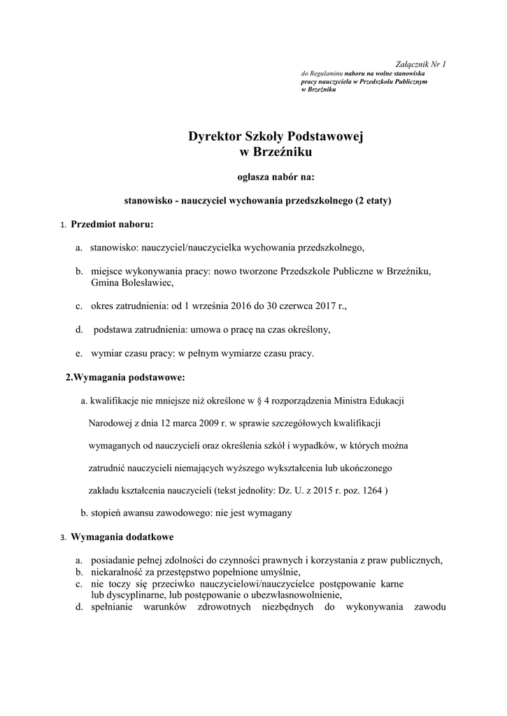 Załącznik Nr 1 do Regulaminu naboru na wolne stanowiska pracy nauczyciela w Przedszkolu Publicznym w Brzeźniku Dyrektor Szkoły Podstawowej w Brzeźniku ogłasza nabór na: stanowisko - nauczyciel wychowania przedszkolnego (2 etaty) 1. Przedmiot naboru: a. stanowisko: nauczyciel/nauczycielka wychowania przedszkolnego, b. miejsce wykonywania pracy: nowo tworzone Przedszkole Publiczne w Brzeźniku, Gmina Bolesławiec, c. okres zatrudnienia: od 1 września 2016 do 30 czerwca 2017 r., d. podstawa zatrudnienia: umowa o pracę na czas określony, e. wymiar czasu pracy: w pełnym wymiarze czasu pracy. 2.Wymagania podstawowe: a. kwalifikacje nie mniejsze niż określone w § 4 rozporządzenia Ministra Edukacji Narodowej z dnia 12 marca 2009 r. w sprawie szczegółowych kwalifikacji wymaganych od nauczycieli oraz określenia szkół i wypadków, w których można zatrudnić nauczycieli niemających wyższego wykształcenia lub ukończonego zakładu kształcenia nauczycieli (tekst jednolity: Dz. U. z 2015 r. poz. 1264 ) b. stopień awansu zawodowego: nie jest wymagany 3. Wymagania dodatkowe a. posiadanie pełnej zdolności do czynności prawnych i korzystania z praw publicznych, b. niekaralność za przestępstwo popełnione umyślnie, c. nie toczy się przeciwko nauczycielowi/nauczycielce postępowanie karne lub dyscyplinarne, lub postępowanie o ubezwłasnowolnienie, d. spełnianie warunków zdrowotnych niezbędnych do wykonywania zawodu doświadczenie w pracy z dziećmi w wieku przedszkolnym przestrzeganie podstawowych zasad moralnych, kreatywność, umiejętność podejmowania decyzji, zdolność i otwartość na komunikowanie się w grupie pracowniczej i poza nią, poczucie odpowiedzialności, znajomość i obsługa programów komputerowych: pakietu MS Office, umiejętność korzystania z poczty elektronicznej, Internetu, k. wysoka kultura osobista e. f. g. h. i. j. 4. Zakres wykonywanych zadań na stanowisku: a. tworzenie warunków do optymalnego rozwoju każdego dziecka we wszystkich sferach jego rozwoju zgodnie z podstawą programową wychowania przedszkolnego, b. systematyczne planowanie i realizacja zajęć wychowawczo –dydaktycznoopiekuńczych, c. rozpoznawanie potrzeb, możliwości zdolności i zainteresowań wychowanków, d. dokumentowanie wyników obserwacji pedagogicznych, e. organizowanie pomocy psychologiczno-pedagogicznej, f. współdziałanie i informowanie rodziców o postępach dzieci, g. realizowanie zasad i czynności wynikających ze statutu przedszkola, h. prowadzenie dokumentacji nauczyciela zgodnie z wytycznymi. 5. Wymagane dokumenty: a. życiorys (CV), b. list motywacyjny, c. dyplomu ukończenia studiów, świadectwa ukończenia szkół potwierdzające zdobyte wykształcenie -oryginały, odpisy lub kopie potwierdzone przez kandydata za zgodność z oryginałem, d. akt nadania awansu zawodowego nauczyciela- oryginał lub kopia potwierdzona przez kandydata za zgodność z oryginałem, e. inne dodatkowe dokumenty poświadczające inne posiadane kwalifikacje umiejętności, ( kopie) f. świadectwa pracy potwierdzające zatrudnienie na stanowisku nauczyciela- oryginały lub kopie potwierdzone przez kandydata za zgodność z oryginałem g. zaświadczenie lekarskie o stanie zdrowia pozwalającym na pracę na stanowisku nauczyciela, i h. kserokopia książeczki sanitarno-epidemiologicznej; i. informacja z Krajowego Rejestru Karnego o niekaralności za przestępstwo popełnione umyślnie, j. oświadczenie o tym, że nie toczy się przeciwko kandydatowi postępowanie karne, dyscyplinarne, lub postępowanie o ubezwłasnowolnienie. Wymagane dokumenty: list motywacyjny, szczegółowe CV (z uwzględnieniem dokładnego przebiegu kariery zawodowej), powinny być opatrzone klauzulą: „Wyrażam zgodę na przetwarzanie moich danych osobowych zawartych w ofercie pracy dla potrzeb niezbędnych do realizacji procesu rekrutacji zgodnie z ustawą z dnia 29 sierpnia 1997 r. o ochronie danych osobowych ( Dz. U. z 2015 r. poz 2135 i 2281 oraz z 2016 r. poz. 195 i 677) .” Dokumenty aplikacyjne należy składać w zamkniętej kopercie w sekretariacie Szkoły Podstawowej w Brzeźniku; Brzeźnik 67; 59 – 700 Bolesławiec w nieprzekraczalnym terminie do dnia 5 sierpnia 2016 r. do godz. 14.00 (liczy się data wpływu) z dopiskiem „Oferta na stanowisko pracy: nauczyciel w Przedszkolu Publicznym w Brzeźniku” 6. Opis procedury wyłaniania kandydata Kandydaci spełniający wymagania podstawowe i dodatkowe zostaną zaproszeni telefonicznie lub za pośrednictwem poczty elektronicznej na rozmowę kwalifikacyjną, którą przeprowadzi Komisja Rekrutacyjna. Informacje o wyniku naboru zostaną zamieszczone na www.bip.gminaboleslawiec.pl, stronie internetowej Szkoły Podstawowej w Brzeźniku oraz na tablicy ogłoszeń szkoły. Dokumenty aplikacyjne kandydata, który zostanie wyłoniony w procesie naboru zostaną dołączone do jego akt osobowych. Dokumenty aplikacyjne osób, które w procesie rekrutacji zakwalifikowały się do II etapu i zostały umieszczone w protokole, będą przechowywane, zgodnie z instrukcją kancelaryjną. Dokumenty aplikacyjne pozostałych osób będą odsyłane lub odbierane osobiście przez zainteresowanych. Dyrektor Szkoły Podstawowej w Brzeźniku (-)
