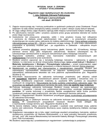 WYDZIAŁ NAUK O ZDROWIU STUDIA IO STACJONARNE Regulamin zajęć dydaktycznych dla studentów I roku Oddziału Zdrowia Publicznego Biologia i parazytologia rok akad. 2015/2016 1. Zajęcia rozpoczynają się i kończą punktualnie w godzinach podanych przez Dziekanat. Przed wejściem na salę odzież zewnętrzną należy zostawić w szatni i włożyć czysty fartuch lekarski. 2. W ciągu całego okresu zajęć Studenci zajmują stałe miejsca numerowane kolejno według listy. 3. Po zakończeniu ćwiczeń szkło i przybory używane przez grupę sprawdza starosta lub osoba przez niego wyznaczona. 4. Uszkodzone lub zniszczone preparaty, szkło i inne przybory muszą być odkupione i zwrócone do Zakładu przed zakończeniem roku zajęć - w przeciwnym przypadku student/grupa nie uzyska wpisu zaliczenia do indeksu elektronicznego. Cena jednego preparatu mikroskopowego wynosi 50 – 150 zł w zależności od jego rodzaju. W razie braku odpowiednich preparatów w sprzedaży możliwe jest - po uzgodnieniu w Zakładzie - odkupienie innych materiałów. 5. Studenci prowadzą ołówkiem zeszyt ćwiczeniowy gładki, formatu A5, 32-kartkowy, którego pierwsza strona służy jako książeczka zaliczeniowa. Studenci zobowiązani są do sukcesywnego zamieszczania w zeszycie ćwiczeniowym planu bieżącego ćwiczenia. 6. Nagrywanie wykładów, prelekcji oraz kserowanie materiałów ćwiczeniowych jest niedozwolone (naruszenie praw autorskich). 7. Studenci powinni zapoznać się z tematyką kolejnego ćwiczenia – ogłoszoną w gablocie Zakładu i w internecie na stronie Uniwersytetu Medycznego (www.umed.lodz.pl > Studenci > Materiały dydaktyczne > Biologia i Parazytologia Lekarska) – przed rozpoczęciem zajęć oraz opanować zalecony materiał, sprawdzany w trakcie bieżących ćwiczeń (forma pisemna). 8. Nieobecność na prelekcji jest równoznaczna z niezaliczeniem ćwiczenia. Student jest zobowiązany usprawiedliwić nieobecność na zajęciach dydaktycznych przedstawiając odpowiednio zaświadczenie lekarskie lub inne pisemne usprawiedliwienie (por. Regulamin Studiów § 10) 9. Warunkiem dopuszczenia do zaliczenia końcowego przedmiotu jest aktywny udział we wszystkich zajęciach przewidzianych planem studiów (wykłady i ćwiczenia) oraz co najmniej dostateczna znajomość materiału, tj. uzyskanie 60% punktów ze wszystkich możliwych do osiągnięcia. Nieuzyskanie tej liczby punktów uniemożliwia zaliczenie zajęć. Nie przewiduje się żadnych dodatkowych terminów dla osób, które nie spełniły tego kryterium. 10. Podczas testowego zaliczenia końcowego Studenci muszą wykazać się opanowaniem materiału z wykładów i ćwiczeń oraz wskazanego piśmiennictwa, uzyskując minimum 60% punktów. W ocenie końcowej z przedmiotu będzie uwzględniona także liczba punktów uzyskanych podczas zajęć praktycznych, ale tylko w pierwszym terminie zaliczenia. 11. Zgodnie z Regulaminem Studiów Studentowi przysługuje prawo trzykrotnego przystępowania do zaliczenia końcowego. 1. Niezgłoszenie się w ustalonym terminie na zaliczenie końcowe jest równoznaczne z utratą terminu. W uzasadnionych przypadkach losowych Student może ubiegać się o wyznaczenie nowego terminu (por. Regulamin Studiów § 24). 12. Na terenie Zakładu należy utrzymywać porządek i czystość oraz zachować ciszę, palenie tytoniu jest zabronione. Przebywanie Słuchaczy poza częścią dydaktyczną Zakładu wymaga zezwolenia. 13. Wątpliwości nasuwające się w toku zajęć rozstrzyga asystent prowadzący ćwiczenia, opiekun dydaktyczny przedmiotu (dr Barbara Modrzewska), a w razie potrzeby kierownik przedmiotu (dr hab., prof. UM Joanna Błaszkowska) lub kierownik Katedry Biologii i Parazytologii Lekarskiej (prof. Piotr Kurnatowski). 14. Studenci zapoznają się z przedstawionym regulaminem i potwierdzają to podpisem. „Biologia z parazytologią” – I rok Oddziału Zdrowia Publicznego „Biologia z parazytologią” – I rok Oddziału Zdrowia Publicznego Ćwiczenie nr 1 Ćwiczenie nr 2 Temat: Poziomy organizacji materii - struktury nieożywione Temat: Poziomy organizacji biologicznej. Organizm jako układ regulacji 1. Zasady techniki mikroskopowania - obserwacja pyłku Lilium sp. a. okiem nieuzbrojonym - pokaz z opisem b. pod powiększeniem 10× - pokaz z opisem c. pod powiększeniem 100× - pokaz z opisem d. pod powiększeniem 400/600× - rys. 2. Kryształy NaCl – prep. mikr., pow. 100× - rys. 3. Kryształy leków a. kryształy penicyliny - prep. mikr. bezp., pow. 100× - pokaz b. kryształy innych leków - zdjęcia - pokaz 1. Układ regulacji stabilnej a. testy wysiłkowe - próba Ruffiera - protokół doświadczenia - próba Mastera - protokół doświadczenia b. właściwości buforowe surowicy krwi - protokół doświadczenia 2. Układ regulacji niestabilnej a. komórka Traubego - doświadczenie - pokaz z opisem b. Fucus sp. (morszczyn) - prep. makr. - pokaz 4. Kryształy ciekłe - ciekłokrystaliczna termografia kontaktowa a. ocena ciepłoty ciała termometrem paskowym - pokaz b. mapa rozkładu temperatury twarzy - demonstracja przeźroczy 5. Liść tytoniu zakażony wirusem mozaiki tytoniowej (Nicotiana virus) i liść zdrowy (kontrola) - prep. mikr., pow. 10× - pokaz 6. Włókna DNA otrzymane z komórek grasicy cielęcej a. prep. makr. - pokaz b. prep. mikr., pow. 100× - pokaz Materiały obowiązujące do przygotowania: Wykład „Biologia z parazytologią” – I rok Oddziału Zdrowia Publicznego „Biologia z parazytologią” – I rok Oddziału Zdrowia Publicznego Ćwiczenie nr 3 Ćwiczenie nr 4 Temat: Poziomy organizacji biologicznej: poziom subkomórkowy - chromosomy; podział komórki Temat: Poziomy organizacji biologicznej: Procaryota 1. Chromosomy olbrzymie w śliniankach larwy muchy owocowej (Drosophila sp.) - prep. mikr. utrw. alkoholem metylowym, niebarw., pow. 400× - rys. 2. Chromosomy olbrzymie larwy ochotki (Chironomus sp.) - prep. mikr. utrw., pow. 400× - pokaz 3. Chromosomy z k