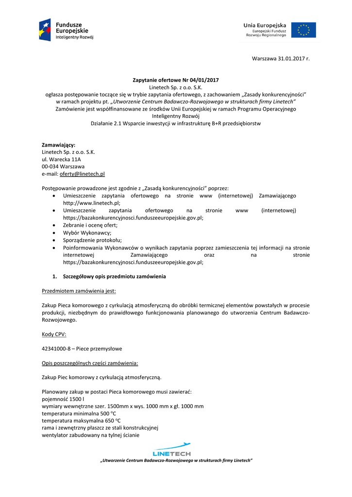 Warszawa 31.01.2017 r. Zapytanie ofertowe Nr 04/01/2017 Linetech Sp. z o.o. S.K. ogłasza postępowanie toczące się w trybie zapytania ofertowego, z zachowaniem „Zasady konkurencyjności” w ramach projektu pt. „Utworzenie Centrum Badawczo-Rozwojowego w strukturach firmy Linetech” Zamówienie jest współfinansowane ze środków Unii Europejskiej w ramach Programu Operacyjnego Inteligentny Rozwój Działanie 2.1 Wsparcie inwestycji w infrastrukturę B+R przedsiębiorstw Zamawiający: Linetech Sp. z o.o. S.K. ul. Warecka 11A 00-034 Warszawa e-mail: [email protected] Postępowanie prowadzone jest zgodnie z „Zasadą konkurencyjności” poprzez: Umieszczenie zapytania ofertowego na stronie www (internetowej) Zamawiającego http://www.linetech.pl; Umieszczenie zapytania ofertowego na stronie www (internetowej) https://bazakonkurencyjnosci.funduszeeuropejskie.gov.pl; Zebranie i ocenę ofert; Wybór Wykonawcy; Sporządzenie protokołu; Poinformowania Wykonawców o wynikach zapytania poprzez zamieszczenia tej informacji na stronie internetowej Zamawiającego oraz na stronie https://bazakonkurencyjnosci.funduszeeuropejskie.gov.pl; 1. Szczegółowy opis przedmiotu zamówienia Przedmiotem zamówienia jest: Zakup Pieca komorowego z cyrkulacją atmosferyczną do obróbki termicznej elementów powstałych w procesie produkcji, niezbędnym do prawidłowego funkcjonowania planowanego do utworzenia Centrum BadawczoRozwojowego. Kody CPV: 42341000-8 – Piece przemysłowe Opis poszczególnych części zamówienia: Zakup Piec komorowy z cyrkulacją atmosferyczną. Planowany zakup w postaci Pieca komorowego musi zawierać: pojemność 1500 l wymiary wewnętrzne szer. 1500mm x wys. 1000 mm x gł. 1000 mm temperatura minimalna 500 oC temperatura maksymalna 650 oC rama i zewnętrzny płaszcz ze stali konstrukcyjnej wentylator zabudowany na tylnej ścianie „Utworzenie Centrum Badawczo-Rozwojowego w strukturach firmy Linetech” instalacja elektryczna umieszczona w tablicy rozdzielczej z boku pieca drzwi sterowane hydraulicznie otwierane do góry elementy grzejne umieszczone na obydwu bokach pieca, regulator umożliwiający zapisanie w pamięci programów sterujących graficzny rejestrator temperatury gwarancja min. 3 lata 2. Termin realizacji usług Zamówienie powinno być zrealizowane w okresie obowiązywania umowy zawartej pomiędzy Zamawiającym, a Wykonawcą, przewiduje się aby zakres zamówienia zrealizowany został w ciągu 15 dni kalendarzowych od dnia podpisania umowy z Wykonawcą. 3. Warunki udziału w postępowaniu (kryteria dostępu) O zamówienie mogą ubiegać się Wykonawcy, którzy spełniają łącznie następujące kryteria: a) nie są powiązani osobowo lub kapitałowo z Zamawiającym do realizacji zamówienia i na czas jego trwania – Załącznik nr 4. Przez powiązania kapitałowe lub osobowe rozumie się wzajemne powiązania między beneficjentem lub osobami upoważnionymi do zaciągania zobowiązań w imieniu beneficjenta lub osobami wykonującymi w imieniu beneficjenta czynności związane z przeprowadzeniem procedury wyboru wykonawcy a wykonawcą, polegające w szczególności na: i. uczestniczeniu w spółce jako wspólnik spółki cywilnej lub spółki osobowej, ii. posiadaniu co najmniej 10% udziałów lub akcji, o ile niższy próg nie wynika z przepisów prawa lub nie został określony przez IZ w wytycznych programowych, iii. pełnieniu funkcji członka organu nadzorczego lub zarządzającego, prokurenta, pełnomocnika, iv. pozostawaniu w związku małżeńskim, w stosunku pokrewieństwa lub powinowactwa w linii prostej, pokrewieństwa drugiego stopnia lub powinowactwa drugiego stopnia w linii bocznej lub w stosunku przysposobienia, opieki lub kurateli. b) nie znajdują się w sytuacji ekonomicznej i finansowej mogącej budzić poważne wątpliwości co do możliwości prawidłowego wykonania zamówienia, nie wszczęto wobec nich postępowania upadłościowego, ani nie ogłoszono upadłości; nie zalegają z opłacaniem podatków, opłat lub składek na ubezpieczenie społeczne lub zdrowotne - Załącznik nr 2. c) Posiadają doświadczenie oraz zasoby osobowe, tj.: - posiadają doświadczenie w zakresie wykonania podobnych zamówień, tj. w okresie ostatnich trzech lat przed upływem terminu składania ofert, a jeżeli okres prowadzenia działalności jest krótszy, w tym okresie, wykonali należycie zlecenie podobne do niniejszego zapytania ofertowego o wartości min. 30 000,00 zł. netto; Zamawiający nie wymaga, aby ww. wymaganie wykonano w ramach jednego zamówienia. Ocena spełnienia powyższych warunków oparta będzie o zasadę spełnia - nie spełnia (1-0) i zostanie przeprowadzona na podstawie: 1. złożonego wykazu wykonanych, a w przypadku świadczeń okresowych lub ciągłych również wykonywanych, głównych usług, w okresie ostatnich 3 lat przed upływem terminu składania ofert, a jeżeli okres prowadzenia działalności jest krótszy – w tym okresie, wraz z podaniem przedmiotu, dat wykonania i podmiotów, na rzecz których zlecenia zostały wykonane, oraz załączeniem dowodów, czy zostały wykonane lub są wykonywane należycie – wg wzoru stanowiącego Załącznik nr 3 Zamawiający dokona oceny spełnienia warunków udziału w postępowaniu poprzez zastosowanie kryterium spełnia – nie spełnia, tj. zgodnie z zasadą, czy dokumenty zostały dołączone do oferty i „Utworzenie Centrum Badawczo-Rozwojowego w strukturach firmy Linetech” czy spełniają określone w zapytaniu ofertowym wymagania. Brak któregokolwiek z wymaganych oświadczeń lub dokumentów lub załączenie ich w niewłaściwej formie lub niezgodnie z wymaganiami określonymi w zapytaniu ofertowym, będzie skutkowało odrzuceniem oferty Wykonawcy, z wyjątkiem wystąpienia powiązań kapitałowych lub osobowych między Wykonawcą a Zamawiającym, kiedy to Wykonawca zostanie wykluczony z udziału w postępowaniu. Niespełnienie któregokolwiek z kryteriów dostępu będzie 