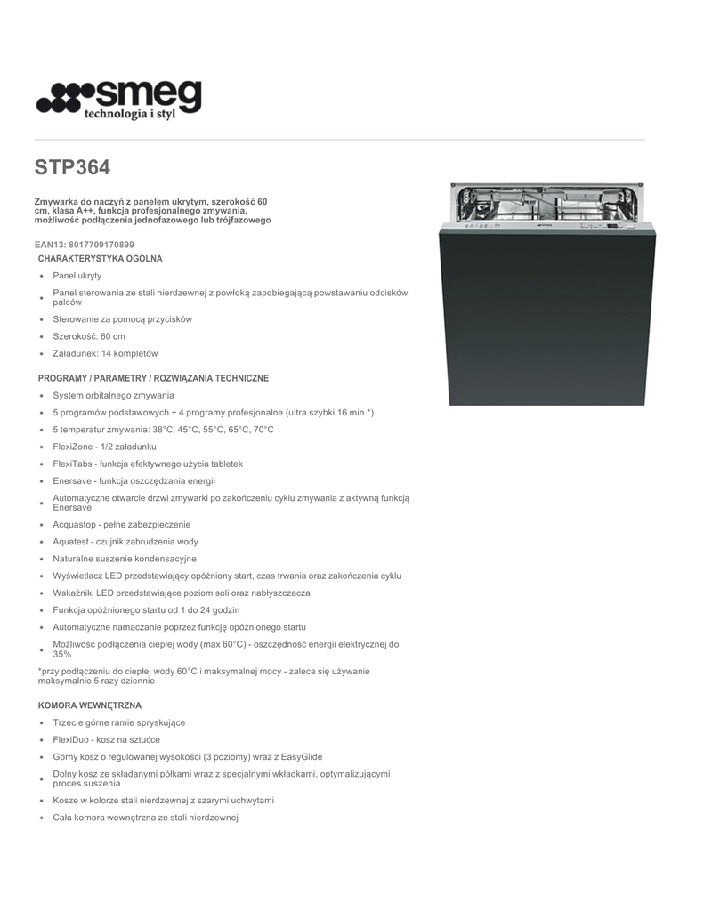 STP364 Zmywarka do naczyń z panelem ukrytym, szerokość 60 cm, klasa A++, funkcja profesjonalnego zmywania, możliwość podłączenia jednofazowego lub trójfazowego EAN13: 8017709170899 CHARAKTERYSTYKA OGÓLNA Panel ukryty Panel sterowania ze stali nierdzewnej z powłoką zapobiegającą powstawaniu odcisków palców Sterowanie za pomocą przycisków Szerokość: 60 cm Załadunek: 14 kompletów PROGRAMY / PARAMETRY / ROZWIĄZANIA TECHNICZNE System orbitalnego zmywania 5 programów podstawowych + 4 programy profesjonalne (ultra szybki 16 min.*) 5 temperatur zmywania: 38°C, 45°C, 55°C, 65°C, 70°C FlexiZone - 1/2 załadunku FlexiTabs - funkcja efektywnego użycia tabletek Enersave - funkcja oszczędzania energii Automatyczne otwarcie drzwi zmywarki po zakończeniu cyklu zmywania z aktywną funkcją Enersave Acquastop - pełne zabezpieczenie Aquatest - czujnik zabrudzenia wody Naturalne suszenie kondensacyjne Wyświetlacz LED przedstawiający opóźniony start, czas trwania oraz zakończenia cyklu Wskaźniki LED przedstawiające poziom soli oraz nabłyszczacza Funkcja opóźnionego startu od 1 do 24 godzin Automatyczne namaczanie poprzez funkcję opóźnionego startu Możliwość podłączenia ciepłej wody (max 60°C) - oszczędność energii elektrycznej do 35% *przy podłączeniu do ciepłej wody 60°C i maksymalnej mocy - zaleca się używanie maksymalnie 5 razy dziennie KOMORA WEWNĘTRZNA Trzecie górne ramie spryskujące FlexiDuo - kosz na sztućce Górny kosz o regulowanej wysokości (3 poziomy) wraz z EasyGlide Dolny kosz ze składanymi półkami wraz z specjalnymi wkładkami, optymalizującymi proces suszenia Kosze w kolorze stali nierdzewnej z szarymi uchwytami Cała komora wewnętrzna ze stali nierdzewnej Filtr ze stali nierdzewnej Zawiasy samopoziomujące Regulacja tylnych nóżek od frontu SPECYFIKACJA TECHNICZNA Moc przyłączeniowa: 5,45 kW Zużycie energii: 0,92 kWh/cykl Zużycie wody: 10,5 l/cykl Cykl normatywny: ECO Czas trwania cyklu normatywnego: 175 min. Roczne zużycie energii: 261 kWh Roczne zużycie wody: 2 940 l Poziom hałasu: 45 dB(A) Zabezpieczenie: 32 A Napięcie: 380-415 V (trójfazowe) Napięcie: 220-230 V (jednofazowe) Częstotliwość: 50 Hz Podłączenie jednofazowe lub trójfazowe Functions Smeg Polska Sp. z o.o. ul. Cybernetyki 9 02-677 Warszawa Tel. +48 22 276 14 00 STP364 do zabudowy z panelem ukrytym 60 cm OPCJE PROFESJONALNE: Opcja Professional daje możliwość przekształcenia urządzenia w półprofesjonalne ze względu na programy które znacząco redukują czas zmywania. A++: Zmywarki, chłodziarki, pralki w klasie A ++ zużywają do 20% mniej energii w stosunku do urządzeń należących do klasy A. Urządzenia tej klasy gwarantują zmniejszone zużycie energii, maksymalną efektywność energetyczną i poszanowanie dla środowiska naturalnego. MAKSYMALNY ZAŁADUNEK: Załadunek od 7 do 14 kompletów w zależności od modelu. KOSZ FLEXIDUO: Smeg opracował całkowicie nowy trzeci górny kosz na sztućce FlexiDuo, który składa się z dwóch części, które mogą być zdejmowane, wymieniane lub umieszczone jeden na drugim, co zapewnia maksymalny komfort podczas załadunku zmywarki. OPTCJA ENERSAVE: Specjalny system, który zwiększa efektywność energetyczna zmywarki, poprzez automatyczne otwarcie drzwi zmywarki. Część procesu suszenia odbywa się przy otwartych drzwiach. OPÓŹNIONY START: Opóźniony start do 24h. Naczynia, które oczekują na włączenie się zmywarki są automatycznie namaczane. Szybki 16min: Program przeznaczony jest do zmywania silnie zabrudzonych naczyń z zaschniętymi pozostałościami jedzenia w bardzo krótkim czasie. FLEXIZONE ½ ZAŁADUNKU: Ta opcja umożliwia zmywanie połowy załadunku. Niewielką ilość sprzętów i naczyń kuchennych, umieszczamy w dowolnym koszu, co pozwala zaoszczędzić energię, wodę i skraca czas zmywania. OPCJA TABLETEK: Opcja, która maksymalnie ułatwia korzystanie z urządzenia. EASYGLIDE SYSTEM: System pozwalający na wygodny rozładunek naczyń. AQUATEST: Czujnik zabrudzenia wody, który sprawdza jej jakość przed każdym zmywaniem. Dzięki temu zmywanie zawsze następuje do czysta i minimalnym zużyciu wody i energii. PEŁEN ACQUASTOP: Pełne zabezpieczenie przed zalaniem, z dodatkowy zaworem, który odcina dopływ wody nawet przy najmniejszym przecieku. PODŁĄCZENIE CIEPŁEJ I ZIMNEJ WODY: Wiele modeli Smeg daje możliwość podłączenia do ciepłej i zimnej wody (maksymalna temperatura wody 60 ° C). Dzięki temu zużywamy mniej energii i skracamy czas zmywania. ROMPI-GOCCIA: Niektóre modele zmywarek są wyposażone w specjalne polimerowe dysze RompiGoccia, które poprawiają proces suszenia poprzez kierowanie kropli wody wewnątrz urządzenia. POWŁOKA ZAPOBIEGAJĄCA POWSTAWANIU ODCISKÓW PALCÓW: W większości urządzeń firmy SMEG stosowana jest, przy użyciu specjalnej technologii, powłoka zapobiegająca pozostawianiu odcisków palców na powierzchni stali nierdzewnej. PŁUKANIE: Płukanie w zimnej wodzie. PROGRAM MYCIA SZKLANEK: Bardzo delikatny program z temperaturą 45 °C PROGRAM ECO: Program redukujący zużycie wody i energii, do mniej zabrudzonych naczyń. PROGRAM AUTO 60 °C: Do zmywania bardzo brudnych naczyń o różnej strukturze, w temperaturze 60 °C Ultraclean: Ostatnie płukanie w programie Ultraclean odbywa się w temperaturze 70 ° C i zapewnia działanie bakteriobójcze, dodatkowo dokładnie czyści naczynia. Party: Program dedykowane do mycia szklanek. Szybki 16min: Program przeznaczony jest do zmywania silnie zabrudzonych naczyń z zaschniętymi pozostałościami jedzenia w bardzo krótkim czasie. UniversaleProf: Program uniwersalny , przeznaczony jest do zmywania normalnie zabrudzonych zastaw stołowych. IntensivoProf: Program intensywny, przeznaczony jest do zmywania garnków i patelnie mocno zabrudzonych z zaschniętymi pozostałościami jedzenia , które wymagają mocnego czyszczenia. Smeg Polska Sp. z o.o. ul. Cybernetyki 9 02-677 Wa