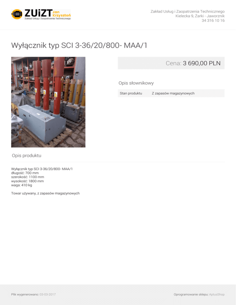 Zakład Usług i Zaopatrzenia Technicznego Kielecka 9, Żarki - Jaworznik 34 316 10 16 Wyłącznik typ SCI 3-36/20/800- MAA/1 Cena: 3 690,00 PLN Opis słownikowy Stan produktu Z zapasów magazynowych Opis produktu Wyłącznik typ SCI 3-36/20/800- MAA/1 długość: 700 mm szerokość: 1100 mm wysokość: 1800 mm waga: 410 kg Towar używany, z zapasów magazynowych Plik wygenerowano: 03-03-2017 Powered by TCPDF (www.tcpdf.org) Oprogramowanie sklepu: AptusShop
