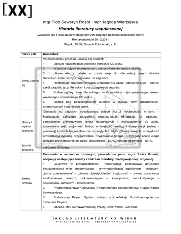 mgr Piotr Seweryn Rosół i mgr Jagoda Wierzejska Historia literatury współczesnej Ćwiczenia dla I roku studiów stacjonarnych drugiego poziomu kształcenia (60 h) Rok akademicki 2010/2011 Piątek, 15:00, Gmach Polonistyki, s. 8. Nazwa pola Komentarz Po zakończeniu procesu uczenia się student: 1. Opisuje najważniejsze zjawiska literackie XX wieku. 2. Wyjaśnia pojęcia teoretycznych, zastosowane do analizy tekstów. 3. Używa wiedzy nabytej w czasie zajęć do interpretacji innych tekstów literackich, które nie były omawiane na zajęciach. Efekty uczenia się 4. Rozpoznaje charakterystyczną problematykę epoki, odmienne style i poetyki szkół, prądów, grup literackich i poszczególnych autorów. 5. Buduje ogólny obraz literackiego dwudziestolecia międzywojennego, okresu wojennego i powojennego XX wieku. 6. Ocenia rolę poszczególnych autorów w rozwoju form prozatorskich, dramatycznych i poetyckich epoki. Obecność na zajęciach obowiązkowa (więcej niż 2 nieobecności w sem. – konieczność zaliczenia wszystkich nieobecności). dodatkowych i Aktywność na „wprowadzenia” zajęciach, Metody i samodzielne przygotowanie lektur do zajęć, kryteria sprawdzana jest znajomość lektur, umiejętność analizy i interpretacji (ustnej i oceniania pisemnej) krótkich fragmentów zaczerpniętych z lektur obowiązkowych, umiejętność prowadzenia dyskusji, przygotowanie i wygłoszenie referatu. Szczegóły: ocena ciągła (bieżące przygotowanie do zajęć i aktywność) – 50 %, kontrola obecności – 50 %. Sposób zaliczenia zaliczenie na ocenę Ćwiczenia w semestrze zimowym, prowadzone przez mgra Piotra Rosoła, obejmują następujące tematy z zakresu literatury międzywojennej i wojennej: 1. „Wyprawa w Dwudziestolecie”. Periodyzacja, podstawowe antynomie dwudziestolecia m.in.: modernizacja – antymodernizacja, egalitaryzm – elitaryzm, „jasne dziesięciolecie” – „ciemne dziesięciolecie”, tragiczność – drwina, obserwacja Zakres środowiskowa, tematów nacjonalizm, autotelizm - heterotelizm. 2. realizm, dokumentaryzm – kreacjonizm; demokratyzacja – Programotwórstwo Futurystów i Programofobia Skamandrytów: krytyka Karola Irzykowskiego. 3. Budowniczy Peiper. System estetyczny i refleksja filozoficzno-społeczna Tadeusza Peipera. 4. Obcość, Mit i Karnawał Wielkiej Wojny. Józef Wittlin, Sól ziemi 5. Literatura choromaniaków? Potęga spojrzenia, magiczny akt mowy. Michał Choromański, Zazdrość i medycyna 6. Człowiek pierwotny/człowiek nowoczesny. Bolesław Leśmian. 7. Zapis nieudanej inicjacji. Witold Gombrowicz, Pamiętnik z okresu dojrzewania 8. Formowanie/ujarzmianie podmiotu. Witold Gombrowicz, Ferdydurke 9. Pamięć, żałoba i melancholia. Jarosław Iwaszkiewicz, Panny z Wilka, Brzezina 10. W poszukiwaniu utraconej Księgi. Bruno Schulz 11. „Powieść nie jest dziełem sztuki; nie działa bezpośrednio swoją konstrukcją”. Witkacy, Ciało i metafizyka. 12. Opowieść o końcu i o początku, rewolucja Stanisława Witkacego. 13. Obrazy niemożliwe. Tadeusz Borowski. 14. Bezzdarzeniowość wielkiej historii. Miron Białoszewski. Ćwiczenia w semestrze letnim, prowadzone przez mgr Jagodę Wierzejską, obejmują następujące tematy z zakresu literatury powojennej: Metody dydaktyczne 1. Socrealistyczna utrata złudzeń. 2. Prozatorskie debiuty odwilżowe – legenda literacka Marka Hłaski. 3. Żydowski świat w polskiej prozie. 4. Wizja Europy (I) – pozytywny projekt rodzinności Europy. 5. Wizja Europy (II) – katastroficzne wyobrażenie upadku Starego Świata. 6. Gombrowicza gry autobiograficzne. 7. Zapis cielesności. 8. Kresy (I) – wspominanie przeszłości między melancholią a fantazmatem. 9. Kresy (II) – kreacja galicyjskiego świata możliwego. 10. Poetyka Nowej Fali. 11. Sylwa współczesna. 12. Białoszewskiego „sobąpisanie”. 13. Polska szkoła eseju – esej filozoficzny. 14. Pokolenie bruLionu. Ćwiczenia są realizowane w trybie dyskusji osoby prowadzącej z uczestnikami. 1. Semestr 1. Stefan Żeromski, Literatura a życie polskie (1915); Wyprawa w Dwudziestolecie, Album z wystawy, Muzeum Narodowe w Warszawie, Warszawa Literatura 2008; Czesław Miłosz, Wyprawa w Dwudziestolecie, Kraków 1999; Wiersze: Julian Tuwim, Ja, *** Życie?---; Jan Lechoń, Herostrates; Bruno Jasienski, But w butonierce; Artur Hutnikiewicz, Od czystej formy do literatury faktu. Główne teorie i programy literackie XX stulecia, Warszawa 1999. (rozdz. Wiek rewolucji, U źródeł współczesnej myśli literackiej, Ekspresjonizm, Futuryzm), A. Wat, Mój wiek, Warszawa 1998. (fragmenty) 2. Karol Irzykowski, Programofobia, Talent jako fetysz, Plagiatowy charakter przełomów literackich w Polsce, Niezrozumialstwo, Futuryzm a szachy, Likwidacja futuryzmu [w:] tegoż, Słoń wśród porcelany, Pisma pod red. Andrzeja Lama, Kraków1976; Manifesty: Słowo wstępne do „Skamandra”, Manifest w sprawie ortografii fonetycznej, Do narodu polskiego. Manifest w sprawie natychmiastowej futuryzacji życia, Manifest w sprawie poezji futurystycznej. Wiersze: Julian Tuwim, Do krytyków; Stefan Żeromski, Snobizm i postęp (fragmenty); Przemysław Czapliński, Poetyka manifestu literackiego 1918-1939, Warszawa 1997; T. Burek, Cztery dyskusje Karola Irzykowskiego, w: Problemy literatury polskiej lat 1890-1939. Ser 1. Wrocław, 1972; R. Nycz, Wynajdywanie porządku. Karola Irzykowskiego koncepcje krytyki i literatury [w:] tegoż, Język modernizmu, Stanisław Ignacy Witkiewicz, Nowe Formy w malarstwie i wynikające stąd nieporozumienia. 3. T. Peiper, Punkt wyjścia; Miasto, masa, maszyna; Metafora teraźniejszości; Droga rymu; Rytm nowoczesny; Rozbijanie tworzydeł, Futuryzm, Nie gejzery. Gejsze! [w:] tegoż, Tędy, Pisma wybrane, BN I, Nr 235, Wrocław 1979; Karol Irzykowski, „Burmistrz marzeń niezamieszkanych” [w:] tegoż, Słoń wśród porcelany, Pisma pod red. Andrzeja Lama, Kraków1976; S. Jaworski, wstęp do wydania BN; S. Jaworski