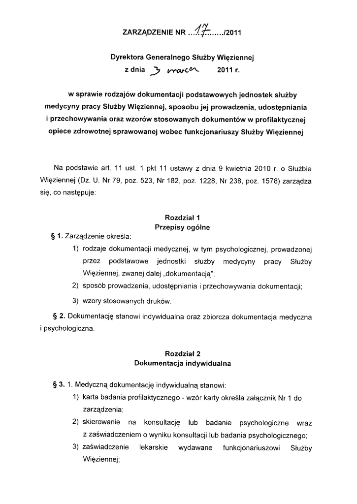 ZARZĄDZENIE NR ...7..tT. /2011 Dyrektora Generalnego Służby Więziennej z dnia JJ? fr-YwC6^ 2011 r. w sprawie rodzajów dokumentacji podstawowych jednostek służby medycyny pracy Służby Więziennej, sposobu jej prowadzenia, udostępniania i przechowywania oraz wzorów stosowanych dokumentów w profilaktycznej opiece zdrowotnej sprawowanej wobec funkcjonariuszy Służby Więziennej Na podstawie art. 11 ust. 1 pkt 11 ustawy z dnia 9 kwietnia 2010 r. o Służbie Więziennej (Dz. U. Nr 79, poz. 523, Nr 182, poz. 1228, Nr 238, poz. 1578) zarządza się, co następuje: Rozdział 1 Przepisy ogólne § 1. Zarządzenie określa: 1) rodzaje dokumentacji medycznej, w tym psychologicznej, prowadzonej przez podstawowe jednostki służby medycyny pracy Służby Więziennej, zwanej daiej „dokumentacją"; 2) sposób prowadzenia, udostępniania i przechowywania dokumentacji; 3) wzory stosowanych druków. § 2. Dokumentację stanowi indywidualna oraz zbiorcza dokumentacja medyczna i psychologiczna. Rozdział 2 Dokumentacja indywidualna § 3. 1. Medyczną dokumentację indywidualną stanowi: 1) karta badania profilaktycznego - wzór karty określa załącznik Nr 1 do zarządzenia; 2) skierowanie na konsultację lub badanie psychologiczne wraz z zaświadczeniem o wyniku konsultacji lub badania psychologicznego; 3) zaświadczenie Więziennej; lekarskie wydawane funkcjonariuszowi Służby 4) kopia orzeczenia komisji lekarskiej podległej ministrowi właściwemu do spraw wewnętrznych, przekazana przez zwaną dalej kierownika „komisją jednostki lekarską MSWiA", organizacyjnej Służby Więziennej. 2. Do karty badania profilaktycznego dołącza się skierowanie na badanie profilaktyczne, wystawione przez kierownika jednostki organizacyjnej Służby Więziennej lub przez osobę upoważnioną przez tego kierownika zawierające: 1) określenie rodzaju badania profilaktycznego, jakie ma być wykonane; 2) określenie stanowiska służbowego, na którym funkcjonariusz pełni lub będzie pełnił służbę; 3) informacje o występowaniu na stanowisku służbowym czynników szkodliwych lub uciążliwych dla zdrowia; 4) aktualne wyniki badań i pomiarów czynników szkodliwych dla zdrowia, wykonanych na danym stanowisku. 3. Wzór skierowania na konsultację lub badanie psychologiczne wraz z zaświadczeniem o wyniku konsultacji lub badania psychologicznego, o którym mowa w ust. 1 pkt 2, określa załącznik Nr 2 do zarządzenia. 4. Wzór zaświadczenia lekarskiego, o którym mowa w ust. 1 pkt 3, określa załącznik Nr 3 do zarządzenia. 5. Dokumentację, o której mowa w § 3 ust. 1 załącza się do karty badania p rof i I aktyczneg o f u n kejo n a ri u sza. § 4. 1 Psychologiczną dokumentację indywidualną stanowi w szczególności: 1) karta badania psychologicznego - Część I Metryczka, której wzór stanowi załącznik Nr 4 do zarządzenia; 2) karta badania psychologicznego - Część II Badanie, której wzór stanowi załącznik Nr 5 do zarządzenia; 3) kserokopia skierowania wraz z zaświadczeniem o wyniku konsultacji lub badania psychologicznego, o którym mowa w § 3 ust. 1 pkt 2; 4) materiały stanowiące metodę badań, w szczególności: a) wywiad, b) badania testowe i ankietowe (test i/lub ankieta, wynik, interpretacja), c) notatki z rozmów indywidualnych. 2. Dokumentacja, o której mowa w ust. 1 pkt 2 zawiera: 1) pieczęć jednostki, datę i miejsce badania; 2) dane z wywiadu i dokumentacji; 3) diagnozę problemową; 4) wnioski/zalecenia; 5) wynik badania psychologicznego. 3. Dokumentację, o której mowa w ust. 1 pkt 4 załącza się do Karty badania psychologicznego - Część II Badanie. Rozdział 3 Dokumentacja zbiorcza § 5. Dokumentację zbiorczą stanowią: 1) rejestr wydawanych zaświadczeń lekarskich z badań profilaktycznych; 2) rejestr podejrzeń, rozpoznań i stwierdzeń związku poszczególnych chorób ze służbą; 3) księga konsultacji i badań specjalistycznych; 4) rejestr badań psychologicznych; 5) rejestr innych wydawanych zaświadczeń. § 6. 1. Rejestr wydawanych zaświadczeń, o których mowa w § 5 pkt 1 zawiera: 1) liczbę porządkową; 2) dane identyfikujące funkcjonariusza, któremu wydano zaświadczenie imię i nazwisko, symbol numeryczny identyfikujący osobę (PESEL); 3) nazwę i adres jednostki organizacyjnej Służby Więziennej, w której badany funkcjonariusz pełni służbę; 4) określenie rodzaju wydanego zaświadczenia; 5) datę wydania zaświadczenia; 6) potwierdzenie odbioru zaświadczenia; 7) datę i treść orzeczenia komisji lekarskiej MSWiA; 8) uwagi. 2. Adnotacje, o których mowa w ust. 1 pkt 7 dotyczą funkcjonariuszy kierowanych na komisje lekarską na wniosek medycyny pracy. § 7. Rejestr podejrzeń, rozpoznań i stwierdzeń związku poszczególnych chorób ze służbą zawiera: 1) liczbę porządkową; 2) nazwisko i imię funkcjonariusza; 3) PESEL; 4) adres zamieszkania; 5) jednostkę organizacyjną, w której funkcjonariusz pełni lub pełnił służbę; 6) datę zarejestrowania podejrzenia związku chorób ze służbą; 7) datę orzeczenia komisji lekarskiej o rozpoznaniu i stwierdzeniu związku poszczególnych chorób ze służbą lub braku podstaw do rozpoznania i stwierdzenia związku tych chorób ze służbą. § 8. Księga konsultacji i badań specjalistycznych zawiera: 1) liczbę porządkową; 2) dane identyfikujące funkcjonariusza, któremu wydano skierowanie na konsultację lub badanie (imię i nazwisko, numer PESEL); 3) nazwę i adres jednostki organizacyjnej Służby Więziennej, w której badany funkcjonariusz pełni służbę; 4) rodzaj zleconej konsultacji lub badania specjalistycznego. § 9. Rejestr konsultacji lub badań psychologicznych zawiera: 1) liczbę porządkową; 2) dane identyfikujące funkcjonariusza któremu wydano skierowanie na badanie (imię i nazwisko, numer PESEL); 3) nazwę i adres jednostki organizacyjnej Służby Więziennej, w której badany funkcjonariusz pełni służbę; 4) dane osoby kierującej n