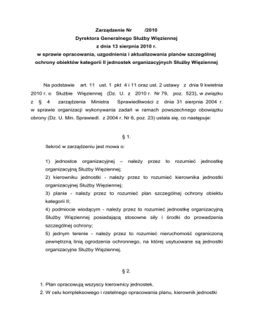 Zarządzenie Nr /2010 Dyrektora Generalnego SłuŜby Więziennej z dnia 13 sierpnia 2010 r. w sprawie opracowania, uzgodnienia i aktualizowania planów szczególnej ochrony obiektów kategorii II jednostek organizacyjnych SłuŜby Więziennej Na podstawie art. 11 ust. 1 pkt 4 i 11 oraz ust. 2 ustawy z dnia 9 kwietnia 2010 r. o SłuŜbie Więziennej (Dz. U. z 2010 r. Nr 79, poz. 523), w związku z § 4 zarządzenia Ministra Sprawiedliwości z dnia 31 sierpnia 2004 r. w sprawie organizacji wykonywania zadań w ramach powszechnego obowiązku obrony (Dz. U. Min. Sprawiedl. z 2004 r. Nr 6, poz. 23) ustala się, co następuje: § 1. Ilekroć w zarządzeniu jest mowa o: 1) jednostce organizacyjnej – naleŜy przez to rozumieć jednostkę organizacyjną SłuŜby Więziennej; 2) kierowniku jednostki - naleŜy przez to rozumieć kierownika jednostki organizacyjnej SłuŜby Więziennej; 3) planie - naleŜy przez to rozumieć plan szczególnej ochrony obiektu kategorii II; 4) podmiocie wiodącym - naleŜy przez to rozumieć jednostkę organizacyjną SłuŜby Więziennej posiadającą stosowne siły i środki do prowadzenia szczególnej ochrony; 5) jednym terenie - naleŜy przez to rozumieć nieruchomość ograniczoną zewnętrzną linią ogrodzenia ochronnego, na której usytuowane są jednostki organizacyjne SłuŜby Więziennej. § 2. 1. Plan opracowują wszyscy kierownicy jednostek. 2. W celu kompleksowego i rzetelnego opracowania planu, kierownik jednostki powołuje zespół, w skład którego wchodzą kierownicy poszczególnych słuŜb oraz funkcjonariusze i pracownicy, którzy zajmują samodzielne stanowiska. § 3. 1. JeŜeli jednostki organizacyjne funkcjonują na jednym terenie lub są ochraniane przez podmiot wiodący, opracowuje się jeden plan. 2. Szczególną ochroną obiektu kieruje kierownik podmiotu wiodącego. § 4. 1. Plan opracowuje się w dwóch egzemplarzach. 2. Pierwszy egzemplarz przechowuje słuŜba dyŜurna jednostki organizacyjnej, natomiast drugi egzemplarz przechowuje funkcjonariusz odpowiedzialny za sprawy obronne w jednostce organizacyjnej. 3. W sytuacjach, o których mowa w § 3, sporządza się trzeci egzemplarz planu dla podmiotu uczestniczącego w szczególnej ochronie. Przepis ust. 2 stosuje się odpowiednio. § 5. Plan podlega uzgodnieniu: 1) z właściwą terytorialnie jednostką organizacyjną Państwowej StraŜy PoŜarnej i jednostką organizacyjną Policji; 2) ze specjalistą okręgowego inspektoratu SłuŜby Więziennej nadzorującym sprawy obronne. § 6. 1. Plan zatwierdza bezpośredni przełoŜony kierownika jednostki. 2. W sytuacjach, o których mowa w § 3, plan zatwierdza przełoŜony kierownika podmiotu wiodącego. § 7. Plan sporządza się, kwalifikuje, przechowuje i udostępnia zgodnie z przepisami o ochronie informacji niejawnych. § 8. Plan podlega aktualizacji stosownie do zmian i uwarunkowań mających wpływ na szczególną ochronę obiektu, nie rzadziej jednak niŜ raz w roku, w terminie do dnia 31 stycznia, według stanu na dzień 31 grudnia roku poprzedniego. § 9. W sprawach nie uregulowanych niniejszym zarządzeniem mają zastosowanie ustalenia zawarte w rozdziale 3 „Ogólnych wymagań dotyczących szczególnej ochrony obiektów kategorii II”, wydanych przez Ministra Spraw Wewnętrznych i Administracji w dniu 9 grudnia 2004 r. § 10. Zarządzenie wchodzi w Ŝycie z dniem podpisania. § 11 Traci moc Zarządzenie Nr 1/2008 Dyrektora Generalnego SłuŜby Więziennej z dnia 28 stycznia 2008 r. w sprawie opracowania, uzgodnienia i aktualizowania planów szczególnej ochrony obiektów kategorii II jednostek organizacyjnych SłuŜby Więziennej Dyrektor Generalny SłuŜby Więziennej płk Kajetan Dubiel UZASADNIENIE Prawną podstawę do wydania zarządzenia stanowi art. 11 ust. 1 pkt 4 i 11 oraz ust. 2 ustawy z dnia 9 kwietnia 2010 r. o SłuŜbie Więziennej (Dz. U. z 2010 r. Nr 79, poz. 523), w związku z § 4 zarządzenia Ministra Sprawiedliwości z dnia 31 sierpnia 2004 r. w sprawie organizacji wykonywania zadań w ramach powszechnego obowiązku obrony (Dz. U. Min. Sprawiedl. z 2004 r. Nr 6, poz. 23). Zmiany dokonane w stosunku do poprzedniego tekstu zarządzenia polegają jedynie na aktualizacji podstawy prawnej w związku z wejściem w Ŝycie nowej Ustawy o SłuŜbie Więziennej.