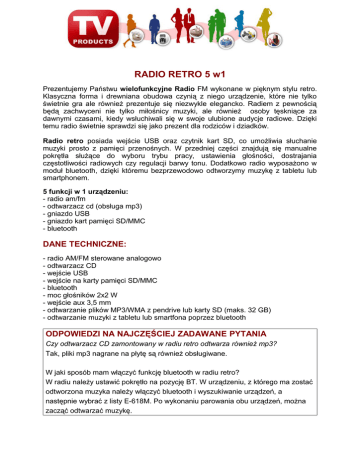 RADIO RETRO 5 w1 Prezentujemy Państwu wielofunkcyjne Radio FM wykonane w pięknym stylu retro. Klasyczna forma i drewniana obudowa czynią z niego urządzenie, które nie tylko świetnie gra ale również prezentuje się niezwykle elegancko. Radiem z pewnością będą zachwyceni nie tylko miłośnicy muzyki, ale również osoby tęskniące za dawnymi czasami, kiedy wsłuchiwali się w swoje ulubione audycje radiowe. Dzięki temu radio świetnie sprawdzi się jako prezent dla rodziców i dziadków. Radio retro posiada wejście USB oraz czytnik kart SD, co umożliwia słuchanie muzyki prosto z pamięci przenośnych. W przedniej części znajdują się manualne pokrętła służące do wyboru trybu pracy, ustawienia głośności, dostrajania częstotliwości radiowych czy regulacji barwy tonu. Dodatkowo radio wyposażono w moduł bluetooth, dzięki któremu bezprzewodowo odtworzymy muzykę z tabletu lub smartphonem. 5 funkcji w 1 urządzeniu: - radio am/fm - odtwarzacz cd (obsługa mp3) - gniazdo USB - gniazdo kart pamięci SD/MMC - bluetooth DANE TECHNICZNE: - radio AM/FM sterowane analogowo - odtwarzacz CD - wejście USB - wejście na karty pamięci SD/MMC - bluetooth - moc głośników 2x2 W - wejście aux 3,5 mm - odtwarzanie plików MP3/WMA z pendrive lub karty SD (maks. 32 GB) - odtwarzanie muzyki z tabletu lub smartfona poprzez bluetooth ODPOWIEDZI NA NAJCZĘŚCIEJ ZADAWANE PYTANIA Czy odtwarzacz CD zamontowany w radiu retro odtwarza również mp3? Tak, pliki mp3 nagrane na płytę są również obsługiwane. W jaki sposób mam włączyć funkcję bluetooth w radiu retro? W radiu należy ustawić pokrętło na pozycję BT. W urządzeniu, z którego ma zostać odtworzona muzyka należy włączyć bluetooth i wyszukiwanie urządzeń, a następnie wybrać z listy E-618M. Po wykonaniu parowania obu urządzeń, można zacząć odtwarzać muzykę.
