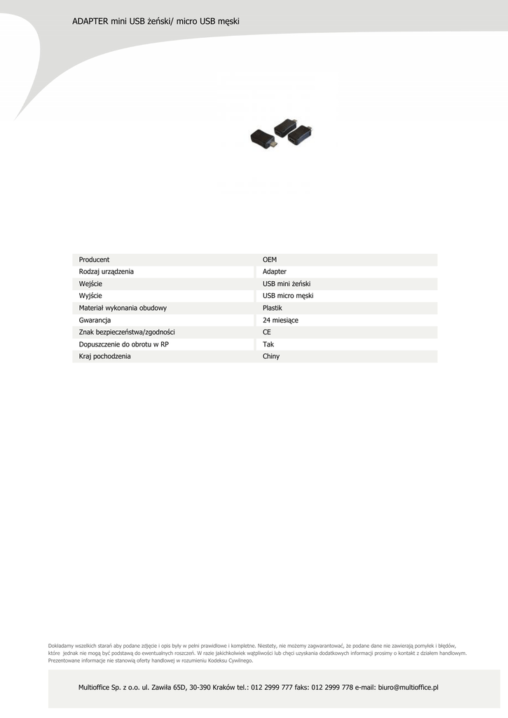ADAPTER mini USB żeński/ micro USB męski Producent OEM Rodzaj urządzenia Adapter Wejście USB mini żeński Wyjście USB micro męski Materiał wykonania obudowy Plastik Gwarancja 24 miesiące Znak bezpieczeństwa/zgodności CE Dopuszczenie do obrotu w RP Tak Kraj pochodzenia Chiny Dokładamy wszelkich starań aby podane zdjęcie i opis były w pełni prawidłowe i kompletne. Niestety, nie możemy zagwarantować, że podane dane nie zawierają pomyłek i błędów, które jednak nie mogą być podstawą do ewentualnych roszczeń. W razie jakichkolwiek wątpliwości lub chęci uzyskania dodatkowych informacji prosimy o kontakt z działem handlowym. Prezentowane informacje nie stanowią oferty handlowej w rozumieniu Kodeksu Cywilnego. Multioffice Sp. z o.o. ul. Zawiła 65D, 30-390 Kraków tel.: 012 2999 777 faks: 012 2999 778 e-mail: [email protected]
