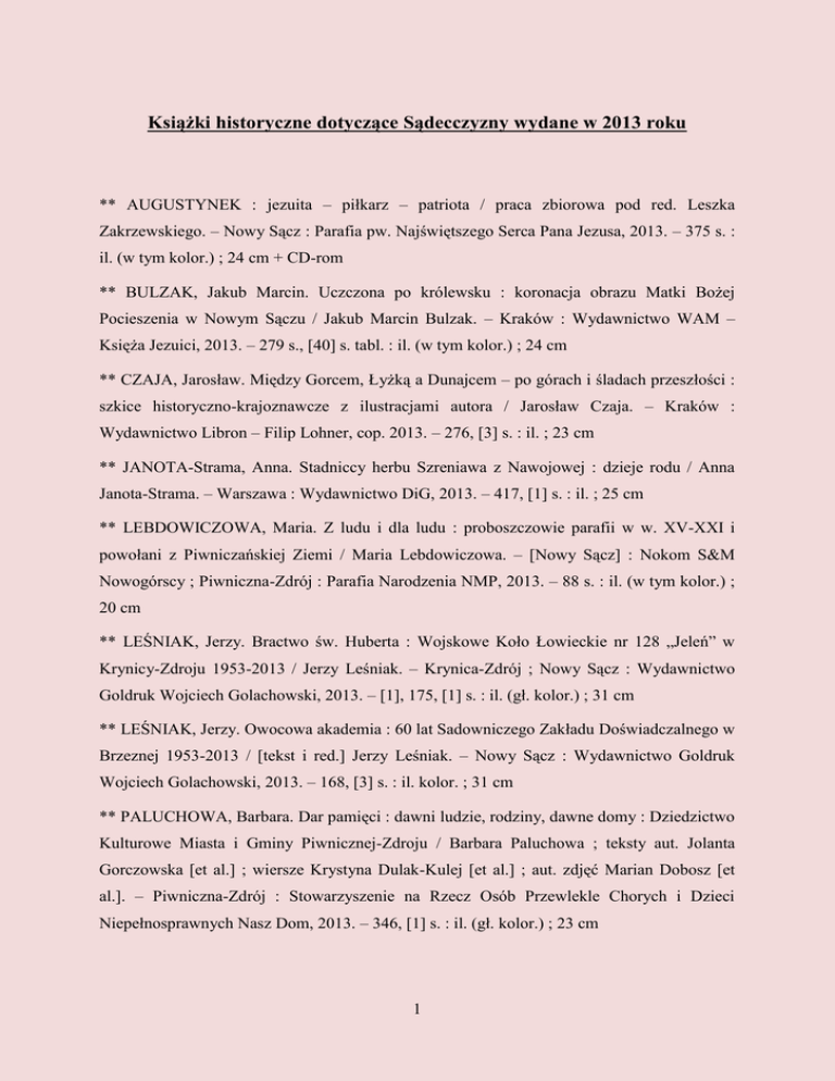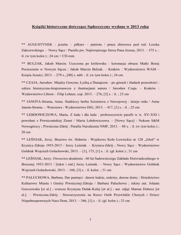 Książki historyczne dotyczące Sądecczyzny wydane w 2013 roku ** AUGUSTYNEK : jezuita – piłkarz – patriota / praca zbiorowa pod red. Leszka Zakrzewskiego. – Nowy Sącz : Parafia pw. Najświętszego Serca Pana Jezusa, 2013. – 375 s. : il. (w tym kolor.) ; 24 cm + CD-rom ** BULZAK, Jakub Marcin. Uczczona po królewsku : koronacja obrazu Matki Bożej Pocieszenia w Nowym Sączu / Jakub Marcin Bulzak. – Kraków : Wydawnictwo WAM – Księża Jezuici, 2013. – 279 s., [40] s. tabl. : il. (w tym kolor.) ; 24 cm ** CZAJA, Jarosław. Między Gorcem, Łyżką a Dunajcem – po górach i śladach przeszłości : szkice historyczno-krajoznawcze z ilustracjami autora / Jarosław Czaja. – Kraków : Wydawnictwo Libron – Filip Lohner, cop. 2013. – 276, [3] s. : il. ; 23 cm ** JANOTA-Strama, Anna. Stadniccy herbu Szreniawa z Nawojowej : dzieje rodu / Anna Janota-Strama. – Warszawa : Wydawnictwo DiG, 2013. – 417, [1] s. : il. ; 25 cm ** LEBDOWICZOWA, Maria. Z ludu i dla ludu : proboszczowie parafii w w. XV-XXI i powołani z Piwniczańskiej Ziemi / Maria Lebdowiczowa. – [Nowy Sącz] : Nokom S&M Nowogórscy ; Piwniczna-Zdrój : Parafia Narodzenia NMP, 2013. – 88 s. : il. (w tym kolor.) ; 20 cm ** LEŚNIAK, Jerzy. Bractwo św. Huberta : Wojskowe Koło Łowieckie nr 128 „Jeleń” w Krynicy-Zdroju 1953-2013 / Jerzy Leśniak. – Krynica-Zdrój ; Nowy Sącz : Wydawnictwo Goldruk Wojciech Golachowski, 2013. – [1], 175, [1] s. : il. (gł. kolor.) ; 31 cm ** LEŚNIAK, Jerzy. Owocowa akademia : 60 lat Sadowniczego Zakładu Doświadczalnego w Brzeznej 1953-2013 / [tekst i red.] Jerzy Leśniak. – Nowy Sącz : Wydawnictwo Goldruk Wojciech Golachowski, 2013. – 168, [3] s. : il. kolor. ; 31 cm ** PALUCHOWA, Barbara. Dar pamięci : dawni ludzie, rodziny, dawne domy : Dziedzictwo Kulturowe Miasta i Gminy Piwnicznej-Zdroju / Barbara Paluchowa ; teksty aut. Jolanta Gorczowska [et al.] ; wiersze Krystyna Dulak-Kulej [et al.] ; aut. zdjęć Marian Dobosz [et al.]. – Piwniczna-Zdrój : Stowarzyszenie na Rzecz Osób Przewlekle Chorych i Dzieci Niepełnosprawnych Nasz Dom, 2013. – 346, [1] s. : il. (gł. kolor.) ; 23 cm 1 ** RYŚ, Zbigniew. Wspomnienia kuriera / Zbigniew Ryś ; [kom. red. Feliks Kiryk et al.]. – Nowy Sącz : Prezydent Miasta Nowego Sącza : Polskie Towarzystwo Historyczne. Oddział, 2013. – 80 s. : il. ; 23 cm. – (Biblioteka „Rocznika Sądeckiego”) ** SĄDECCZYZNA : w historiografii, literaturze i mediach / pod red. Bolesława Farona. – Kraków : Wydawnictwo Edukacyjne, 2013. – 344, [1] s. : il. ; 25 cm ** SUŁKOWSKA, Danuta. Za klauzurą : starosądecki klasztor klarysek od założenia do współczesności / Danuta Sułkowska. – Wyd. 2. – Stary Sącz : Wydawnictwo Oksymoron, 2013. – 165, [1] s, [32] s. tabl. : il. kolor. ; 25 cm ** ŚLADAMI podziemia : działalność niepodległościowa w rejonie Tęgoborza w latach 1939-1953 / pod red. Dawida Golika. – Kraków : Instytut Pamięci Narodowej – Komisja Ścigania Zbrodni przeciwko Narodowi Polskiemu : Ośrodek Myśli Politycznej, 2013. – 166, [1] s. : il. ; 20 cm. – (Z Archiwów Bezpieki – Nieznane Karty PRL ; 21) ** TABKOWSKI, Sławomir Jerzy. „Wiadomości Sądeckie” : studium historycznoprasoznawcze / Sławomir J. Tabkowski. – Nowy Sącz : Prezydent Miasta Nowego Sącza : Polskie Towarzystwo Historyczne. Oddział, 2013. – 125, [1] s. : il. ; 23 cm. – (Biblioteka „Rocznika Sądeckiego”) ** TRZESZCZYŃSKA, Patrycja. Łemkowszczyzna zapamiętana : opowieści o przeszłości i przestrzeni / Patrycja Trzeszczyńska. – Kraków : Wydawnictwo Uniwersytetu Jagiellońskiego, 2013. – 444, [1] s. : il. ; 24 cm. – (Anthropos) ** TUREK, Jacek. Jan Stach twórca największego kamiennego mostu : historia prawdziwa / Jacek Turek. – Brzezia Łąka : Wydawnictwo Poligraf, cop. 2013. – 60 s. : il. ; 21 cm ** Z BIEGIEM lat : historia szkoły w Wielogłowach w świetle starych kronik / aut. Janusz Bielec, Janusz Rojek, Franciszek Szarata, Anna Turek. – Wielogłowy : Fundacja im. Gizów przy Zespole Szkół w Wielogłowach, [2013]. – 119, [1] s. : il. (w tym kolor.) ; 24 cm Zestawienie – na prośbę Kapituły Nagrody Szczęsnego Morawskiego „Sądecczyzna” – zostało przygotowane przez Martę Treit z Sądeckiej Szujskiego. 2 Biblioteki Publicznej im. Józefa