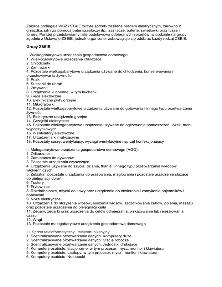 Zbiórce podlegają WSZYSTKIE zużyte sprzęty zasilane prądem elektrycznym, zarówno z gniazdka, jak i za pomocą baterii/zasilaczy itp., zasilacze, baterie, świetlówki oraz tusze i tonery. Poniżej przedstawiamy listę podstawową odbieranych sprzętów, w podziale na grupy zgodnie z Ustawą o ZSEiE, jednak organizator zobowiązuje się odebrać każdy rodzaj ZSEiE. Grupy ZSEiE: I. Wielkogabarytowe urządzenia gospodarstwa domowego: 1. Wielkogabarytowe urządzenia chłodzące 2. Chłodziarki 3. Zamrażarki 4. Pozostałe wielkogabarytowe urządzenia używane do chłodzenia, konserwowania i przechowywania żywności 5. Pralki 6. Suszarki do ubrań 7. Zmywarki 8. Urządzenia kuchenne, w tym kuchenki 9. Piece elektryczne 10. Elektryczne płyty grzejne 11. Mikrofalówki 12. Pozostałe wielkogabarytowe urządzenia używane do gotowania i innego typu przetwarzania żywności 13. Elektryczne urządzenia grzejne 14. Grzejniki elektryczne 15. Pozostałe wielkogabarytowe urządzenia używane do ogrzewania pomieszczeń, łóżek, mebli wypoczynkowych 16. Wentylatory elektryczne 17. Urządzenia klimatyzacyjne 18. Pozostały sprzęt wentylujący, wyciągi wentylacyjne i sprzęt konfekcjonujący II. Małogabarytowe urządzenia gospodarstwa domowego (AGD): 1. Odkurzacze 2. Zamiatacze do dywanów 3. Pozostałe urządzenia czyszczące 4. Urządzenia używane do szycia, dziania, tkania i innego typu przetwarzania wyrobów włókienniczych 5. Żelazka i pozostałe urządzenia do prasowania, maglowania i pozostałe urządzenia służące do pielęgnacji ubrań 6. Tostery 7. Frytownice 8. Rozdrabniacze, młynki do kawy oraz urządzenia do otwierania i zamykania pojemników i opakowań 9. Noże elektryczne 10. Urządzenia do strzyżenia włosów, suszenia włosów, szczotkowania zębów, golenia, masażu oraz pozostałe urządzenia do pielęgnacji ciała 11. Zegary, zegarki oraz urządzenia do celów odmierzania, wskazywania lub rejestrowania czasu 12. Wagi 13. Pozostałe małogabarytowe urządzenia gospodarstwa domowego III. Sprzęt teleinformatyczny i telekomunikacyjny: 1. Scentralizaowane przetwarzanie danych: Komputery duże 2. Scentralizaowane przetwarzanie danych: Stacje robocze 3. Scentralizaowane przetwarzanie danych: Jednostki drukujące 4. Komputery osobiste: stacjonarne, w tym procesor, mysz, monitor i klawiatura 5. Komputery osobiste: Laptopy, w tym procesor, mysz, monitor i klawiatura 6. Komputery osobiste: Notebooki 7. Komputery osobiste: Notepady 8. Komputery osobiste: Drukarki 9. Komputery osobiste: Sprzęt kopiujący 10. Komputery osobiste: Elektryczne i elektroniczne maszyny do pisania 11. Komputery osobiste: Kalkulatory kieszonkowe i biurowe 12. Komputery osobiste: Pozostały sprzęt do zbierania, przechowywania, przetwarzania, prezentowania lub przekazywania informacji drogą elektroniczną 13. Komputery osobiste: Terminale i systemy użytkownika 14. Komputery osobiste: Faksy 15. Komputery osobiste: Teleksy 16. Komputery osobiste: Telefony 17. Komputery osobiste: Automaty telefoniczne 18. Komputery osobiste: Telefony bezprzewodowe 19. Komputery osobiste: Telefony komórkowe 20. Komputery osobiste: Systemy zgłoszeniowe/ sekretarki automatyczne 21. Komputery osobiste: Pozostałe produkty lub sprzęt służący do transmisji głosu, obrazu lub innych informacji za pomocą technologii telekomunikacyjnej IV. Sprzęt audiowizualny: 1. Odbiorniki radiowe 2. Odbiorniki telewizyjne 3. Kamery video 4. Sprzęt video 5. Sprzęt hi-fi 6. Wzmacniacze dzwięku 7. Instrumenty muzyczne 8. Pozostałe produkty lub sprzęt do celów nagrywania lub odtwarzania dźwięku lub obrazów, w tym sygnałów lub innych technologii, dystrybucji dźwięku i obrazu za pomocą technologii telekomunikacyjnych V. Sprzęt oświetleniowy: 1. Oprawy oświetleniowe do lamp fluorescencyjnych, z wyjątkiem opraw oświetleniowych stosowanych w gospodarstwach domowych 2. Liniowe lampy fluorescencyjne 3. Kompaktowe lampy fluorescencyjne 4. Wysokoprężne lampy wyładowcze, w tym ciśnieniowe lampy sodowe oraz lampy metalohalogenkowe 5. Niskoprężne lampy sodowe 6. Pozostałe urządzenia oświetleniowe służące do celów rozpraszania i kontroli światła, z wyjątkiem żarówek VI. Narzędzia elektryczne i elektroniczne, z wyjątkiem wielkogabarytowych, stacjonarnych narzędzi przemysłowych: 1. Wiertarki 2. Piły 3. Maszyny do szycia 4. Urządzenia do skręcania, mielenia, piaskowania, przemiału, piłowania, cięcia, nawiercania, robienia otworów, nabijania, składania, gięcia lub podobnych metod przetwarzania drewna, metalu i innych materiałów 5. Narzędzia do nitowania, przybijania lub przyśrubowania lub usuwania nitów, gwoździ, śrub lub podobnych zastosowań 6. Narzędzia do spawania, lutowania lub podobnych zastosowań 7. Urządzenia do rozpylania, rozprowadzania, rozpraszania lub innego typu nanoszenia cieczy lub substancji gazowych innymi metodami 8. Narzędzia do koszenia trawy lub innych prac ogrodniczych 9. Pozostałe narzędzia elektryczne i elektroniczne VII. Zabawki, sprzęt rekreacyjny i sportowy: 1. Kolejki elektryczne lub tory wyścigowe 2. Kieszonkowe konsole do gier video 3. Gry video 4. Komputerowo sterowane urządzenia do uprawiania sportów rowerowych, nurkowania, biegania, wiosłowania 5. Sprzęt sportowy z elektrycznymi lub elektronicznymi częściami składowymi 6. Automaty uruchamiane monetą, banknotem VIII. Przyrządy medyczne, z wyjątkiem wszystkich wszczepianych i skażonych produktów: 1. Sprzęt do radioterapii 2. Sprzęt do badań kardiologicznych 3. Sprzęt do dializoterapii 4. Sprzęt do wentylacji płuc 5. Urządzenia medyczne wykorzystujące technikę nuklearną 6. Sprzęt laboratoryjny do diagnozowania in vitro 7. Analizatory 8. Zamrażarki laboratoryjne 9. Testy płodności 10. Pozostałe urządzenia do wykrywania, zapobiegania, monitorowania, leczenia, łagodzenia choroby, urazów lub niepełnosprawności IX. Przyrządy do nadzoru i kontroli: 1. Czujniki dymu 2. Regulatory ciep