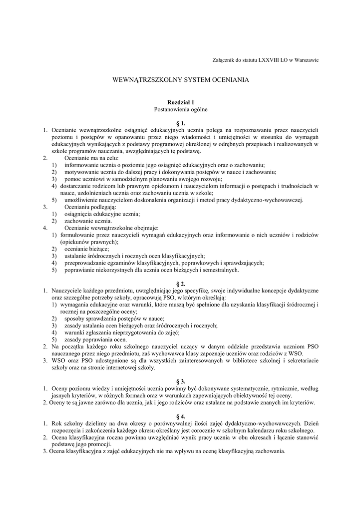 Załącznik do statutu LXXVIII LO w Warszawie WEWNĄTRZSZKOLNY SYSTEM OCENIANIA Rozdział 1 Postanowienia ogólne § 1. 1. Ocenianie wewnątrzszkolne osiągnięć edukacyjnych ucznia polega na rozpoznawaniu przez nauczycieli poziomu i postępów w opanowaniu przez niego wiadomości i umiejętności w stosunku do wymagań edukacyjnych wynikających z podstawy programowej określonej w odrębnych przepisach i realizowanych w szkole programów nauczania, uwzględniających tę podstawę. 2. Ocenianie ma na celu: 1) informowanie ucznia o poziomie jego osiągnięć edukacyjnych oraz o zachowaniu; 2) motywowanie ucznia do dalszej pracy i dokonywania postępów w nauce i zachowaniu; 3) pomoc uczniowi w samodzielnym planowaniu swojego rozwoju; 4) dostarczanie rodzicom lub prawnym opiekunom i nauczycielom informacji o postępach i trudnościach w nauce, uzdolnieniach ucznia oraz zachowaniu ucznia w szkole; 5) umożliwienie nauczycielom doskonalenia organizacji i metod pracy dydaktyczno-wychowawczej. 3. Ocenianiu podlegają: 1) osiągnięcia edukacyjne ucznia; 2) zachowanie ucznia. 4. Ocenianie wewnątrzszkolne obejmuje: 1) formułowanie przez nauczycieli wymagań edukacyjnych oraz informowanie o nich uczniów i rodziców (opiekunów prawnych); 2) ocenianie bieżące; 3) ustalanie śródrocznych i rocznych ocen klasyfikacyjnych; 4) przeprowadzanie egzaminów klasyfikacyjnych, poprawkowych i sprawdzających; 5) poprawianie niekorzystnych dla ucznia ocen bieżących i semestralnych. § 2. 1. Nauczyciele każdego przedmiotu, uwzględniając jego specyfikę, swoje indywidualne koncepcje dydaktyczne oraz szczególne potrzeby szkoły, opracowują PSO, w którym określają: 1) wymagania edukacyjne oraz warunki, które muszą być spełnione dla uzyskania klasyfikacji śródrocznej i rocznej na poszczególne oceny; 2) sposoby sprawdzania postępów w nauce; 3) zasady ustalania ocen bieżących oraz śródrocznych i rocznych; 4) warunki zgłaszania nieprzygotowania do zajęć; 5) zasady poprawiania ocen. 2. Na początku każdego roku szkolnego nauczyciel uczący w danym oddziale przedstawia uczniom PSO nauczanego przez niego przedmiotu, zaś wychowawca klasy zapoznaje uczniów oraz rodziców z WSO. 3. WSO oraz PSO udostępnione są dla wszystkich zainteresowanych w bibliotece szkolnej i sekretariacie szkoły oraz na stronie internetowej szkoły. § 3. 1. Oceny poziomu wiedzy i umiejętności ucznia powinny być dokonywane systematycznie, rytmicznie, według jasnych kryteriów, w różnych formach oraz w warunkach zapewniających obiektywność tej oceny. 2. Oceny te są jawne zarówno dla ucznia, jak i jego rodziców oraz ustalane na podstawie znanych im kryteriów. § 4. 1. Rok szkolny dzielimy na dwa okresy o porównywalnej ilości zajęć dydaktyczno-wychowawczych. Dzień rozpoczęcia i zakończenia każdego okresu określany jest corocznie w szkolnym kalendarzu roku szkolnego. 2. Ocena klasyfikacyjna roczna powinna uwzględniać wynik pracy ucznia w obu okresach i łącznie stanowić podstawę jego promocji. 3. Ocena klasyfikacyjna z zajęć edukacyjnych nie ma wpływu na ocenę klasyfikacyjną zachowania. § 5. 1. O postępach i trudnościach ucznia w nauce oraz o jego zachowaniu wychowawca informuje rodziców (opiekunów prawnych) na zebraniach lub podczas dni otwartych, a w sprawach pilnych zaprasza rodziców do szkoły na rozmowę lub przeprowadza ją telefonicznie. Możliwy jest również kontakt z rodzicem pocztą elektroniczną lub poprzez dziennik elektroniczny. W wyjątkowych przypadkach powiadamia rodziców (opiekunów prawnych) listem poleconym. 2. Oceny umieszczane są w dzienniku elektronicznym. 3. Sprawdzone i ocenione pisemne prace kontrolne uczeń otrzymuje do wglądu na lekcji danego przedmiotu. Rodzice ucznia mają prawo wglądu do pracy pisemnej ucznia w czasie zebrań z rodzicami. § 6. 1. Dyrektor szkoły powołuje zespoły do spraw pomocy psychologiczno-pedagogicznej dla uczniów o specjalnych wymaganiach. Nauczyciele są zobowiązani do dostosowania wymagań do indywidualnych potrzeb uczniów objętych pomocą psychologiczno-pedagogiczną. 2. Przy ustalaniu oceny z zajęć artystycznych i wychowania fizycznego – jeżeli nie są one zajęciami kierunkowymi – należy w szczególności brać pod uwagę wysiłek wkładany przez ucznia w wywiązywanie się z obowiązków wynikających ze specyfiki tych zajęć. 3. W uzasadnionych przypadkach uczeń może być zwolniony z zajęć wychowania fizycznego, zajęć komputerowych, informatyki lub technologii informacyjnej na podstawie opinii o ograniczonych możliwościach uczestniczenia ucznia w tych zajęciach, wydanej przez lekarza na czas określony w tej opinii. Decyzję o zwolnieniu podejmuje dyrektor szkoły. 4. Na wniosek rodziców lub prawnych opiekunów oraz na podstawie opinii poradni psychologicznopedagogicznej, w tym poradni specjalistycznej, uczeń może być zwolniony przez dyrektora szkoły do końca etapu edukacyjnego z nauki drugiego języka obcego. 5. Zwolnienie z zajęć wychowania fizycznego powinno być dostarczone nauczycielowi wychowania fizycznego, który przekazuje je do szkolnego gabinetu lekarskiego i informuje o nim wychowawcę ucznia. 6. W przypadku zwolnienia ucznia zajęć w dokumentacji przebiegu nauczania zamiast oceny klasyfikacyjnej wpisuje się „zwolniony/a”. Rozdział 2 Zasady sprawdzania oraz oceniania wiedzy i umiejętności uczniów § 7. 1. Nauczyciel realizujący zajęcia dydaktyczne przeprowadza kontrolę stopnia opanowania materiału przez uczniów, stosując różnorodne jej formy uwzględniające specyfikę przedmiotu i oddziału. 2. Wiedzę i umiejętności uczniów nauczyciel może sprawdzać w następujących wybranych formach: 1) jednogodzinne i dwugodzinne sprawdziany pisemne (kilkugodzinna próbna matura); 2) kartkówki (zapowiedziane lub niezapowiedziane); 3) wypracowania; 4) prace domowe; 5) referaty; 6) prezentacje; 7) projekty; 8) odpowiedzi ustne; 9) ćwiczenia praktyczne; 10