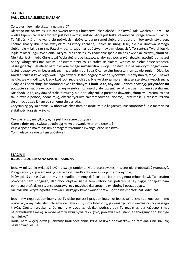 STACJA I PAN JEZUS NA ŚMIERĆ SKAZANY Co czułeś niewinnie skazany na śmierć? Dlaczego nie objawiłeś u Piłata swojej potęgi i bogactwa, ale słabość i ubóstwo? Tak, wcielenie Boże – to wielka tajemnica! Jego źródłem jest Boża miłość, miłość, która jest łaską, ofiarnością, pragnieniem bliskości. To Miłość, która nie waha się poświęcić i złożyć w darze samej siebie dla dobra umiłowanych stworzeń. Kochać znaczy dzielić we wszystkim los istoty kochanej. Stałeś się ubogi Jezu, nie dla ubóstwa samego siebie, ale – jak pisze św. Paweł – po, to „aby nas ubóstwem swoim ubogacić”. To synteza Twojej logiki, logiki miłości, logiki Wcielenia i Krzyża. Nie chciałeś, by zbawienie spadło na nas z wysoka, niczym jałmużna. Nie taka jest miłość Chrystusa! Wybrałeś drogę krzyżową, aby nas pocieszyć, zbawić, uwolnić od naszej nędzy. Ubogaciłeś nas swoim ubóstwem przez to, że stałeś się ciałem, wziąłeś na siebie nasze słabości, nasze grzechy, udzielając nam nieskończonego miłosierdzia. Twoje ubóstwo jest największym bogactwem: jesteś bogaty swoim bezgranicznym zaufaniem do Boga Ojca, swoim bezustannym zawierzeniem Ojcu, bo zawsze szukasz tylko Jego woli i Jego chwały. Jesteś bogaty miłością synowską. Nie wystarczą moje – nawet najdłuższe – modlitwy, kiedy ktoś potrzebuje chleba. Nie wystarczą moje najszczersze słowa współczucia, kiedy ktoś potrzebuje świadomości bycia kochanym. Chodzi o to, aby dać ludziom nadzieję, przywrócić im poczucie sensu, przywrócić im wiarę w siebie i w innych, aby uczynić świat bardziej ludzkim i życzliwym. Nie chodzi o to, aby dawać stale jałmużnę, ale o to, aby znikła potrzeba dawania jałmużny. Czasami trzeba tak niewiele pomóc, podać rękę, okazać życzliwe zainteresowanie, dobroć, uprzejmość. A czasami trzeba się umieć podzielić tym co samemu się posiada. Chrystus żyjący skromnie i w ubóstwie chce nam pokazać, że nie bogactwo, nie zamożność i nie materialna stabilność liczą się w życiu. Czy wystarczy mi tylko tyle, ile jest konieczne do życia? Które z dóbr tego świata utrudniają mi wędrowanie w stronę szczytu? W jaki sposób moim bliskim pomagam zrozumieć ewangeliczne ubóstwo? Co mi ułatwia życie w tym ubóstwie? STACJA II JEZUS BIERZE KRZYŻ NA SWOJE RAMIONA Jezu, w milczeniu wziąłeś krzyż na swoje ramiona. Nie protestowałeś, niczego nie próbowałeś tłumaczyć. Przygnieciony ciężarem naszych grzechów, szedłeś do końca swojej ziemskiej drogi. Poświęciłeś za nas Zycie, a my tak rzadko umiemy dać coś od siebie drugiemu człowiekowi. Tak trudno pokochać nam ubogiego, dać choć cząstkę siebie temu który nas potrzebuje. Ty ciągle podajesz nam pomocną dłoń, dajesz szansę poprawy, gdy przychodzisz spragniony, głodny i potrzebujący. Nie rozumie krzyża egoista, człowiek szukający tylko swoich spraw. Będzie krzyż przeklinał i odrzucał. Jezu – my często zapominamy, ze Ty cicho pukasz i przypominasz, że Jesteś tak blisko i że kochasz mimo wszystko, a my dalej ślepi chcemy żyć łatwo i myślimy tylko o ty, jak uniknąć odpowiedzialności i naszego krzyża. Często narzekamy, że mamy w życiu za ciężko, podczas gdy Ty przeżyłeś dla każdego z nas najprawdziwszą mękę. A może nam w życiu bywa tak ciężko, ponieważ nieustannie zabiegamy o to, by było nam lekko? Dodaj nam więcej odwagi, abyśmy brali codziennie krzyż naszych obowiązków na ramiona i nie bali się naśladować Jezusa. STACJA III PIERWSZY UPADEK PANA JEZUSA POD KRZYŻEM Jezus upada pod krzyżem. Upada z wycieczenia, a krzyż przygniata Go swoim ciężarem do ziemi. Zakrwawione biczowaniem ciało, zatknięta na głowie cierniowa korona i wbijające się kolce – wszystko to sprawia, że brak Mu sił. Jeszcze niedawno rozkazywał wiatrowi i morzu, uzdrawiał chorych, przywracał wzrok i słuch, wskrzeszał umarłych, dawał dowody boskiej mocy i z mocą nauczał. A teraz rzucony na ziemię przez ciężar krzyża. Chrystus z trudem się dźwiga aby iść dalej. Żołnierze krzykiem i uderzeniami starają się Go pobudzić aby ta droga Golgoty mogła trwać dalej.... „Oto Ten przeznaczony jest na upadek i powstanie wielu” (Łk2,34) Są w naszym życiu sytuacje trudne , gdy wszystko wypada nam z rąk, rozsypuje się i rozpada, gdy wręcz nie możemy utrzymać się o własnych siłach. Upadamy. Wtedy pojawia się pokusa rezygnacji z dalszej walki „Już nie mam sił!”, „Dłużej już nie wytrzymam!”, „To nie ma sensu!”, „Już nie mogę!” Trudno nam dostrzec w tych doświadczeniach sens trudu, pracy, wysiłku i życia... Jedynym lekarstwem na zło świata jest miłość. Wielu ludzi pogubionych, poranionych, może też do cna zepsutych, po zetknięciu się z Twoją miłością Panie, stało się innymi, lepszymi ludźmi. Wielu, tak jak syn marnotrawny napotkawszy przebaczające ramiona Ojca (męża, żony, przyjaciół, rodziców, rodziny) odzyskało radość i sens życia. Jezu! Przywalony ciężarem krzyża naszych słabości, pokonujesz ból i podnosisz się by na nowo obdarzyć nas upadających, swoją niewyczerpaną miłością, która dźwiga nas z każdego upadku. Panie nasz!, powstający, by dalej iść, naucz nas przeżywać chwile załamań i klęsk tak, byśmy powstawali wierząc Tobie, i abyśmy nie zniechęcali się trudnościami, lecz z odwagą dawali świadectwo radości Ewangelii w naszym życiu. STACJA IV JEZUS SPOTYKA MATKĘ SWOJĄ Spotkanie z Maryją było spotkaniem bez słów. Ich wzajemna więź była tak głęboka, że żadne słowa nie były potrzebne. Wystarczyła wymiana spojrzeń. Jednak, aby ludzie mogli porozumieć się bez słów muszą się bardzo dobrze znać. A żeby się poznać trzeba ze sobą rozmawiać, przebywać, znać się nawzajem. Często w naszych rodzinach lub środowiskach rozmawiamy wiele o sprawach codziennych – zakupach, rachunkach, rz