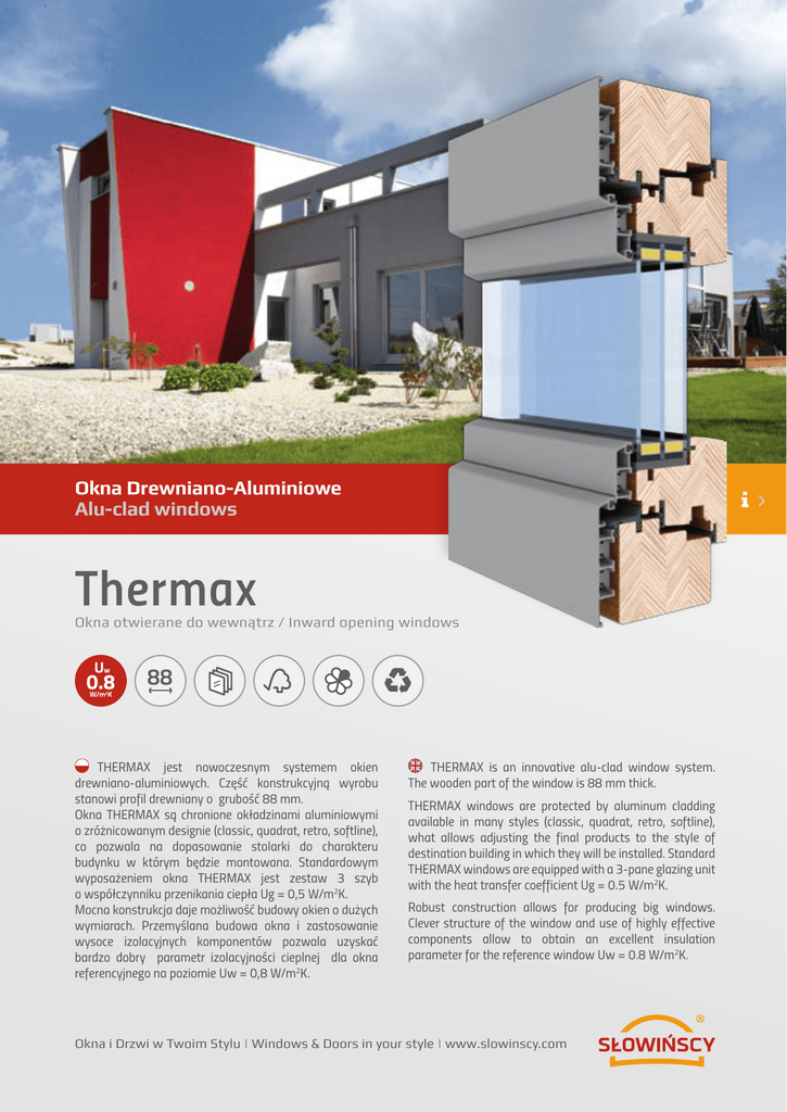 Okna Drewniano-Aluminiowe Alu-clad windows Thermax Okna otwierane do wewnątrz / Inward opening windows Uw 0.8 W/m2K 88 THERMAX jest nowoczesnym systemem okien drewniano-aluminiowych. Część konstrukcyjną wyrobu stanowi profil drewniany o grubość 88 mm. Okna THERMAX są chronione okładzinami aluminiowymi o zróżnicowanym designie (classic, quadrat, retro, softline), co pozwala na dopasowanie stolarki do charakteru budynku w którym będzie montowana. Standardowym wyposażeniem okna THERMAX jest zestaw 3 szyb o współczynniku przenikania ciepła Ug = 0,5 W/m2K. Mocna konstrukcja daje możliwość budowy okien o dużych wymiarach. Przemyślana budowa okna i zastosowanie wysoce izolacyjnych komponentów pozwala uzyskać bardzo dobry parametr izolacyjności cieplnej dla okna referencyjnego na poziomie Uw = 0,8 W/m2K. THERMAX is an innovative alu-clad window system. The wooden part of the window is 88 mm thick. THERMAX windows are protected by aluminum cladding available in many styles (classic, quadrat, retro, softline), what allows adjusting the final products to the style of destination building in which they will be installed. Standard THERMAX windows are equipped with a 3-pane glazing unit with the heat transfer coefficient Ug = 0.5 W/m2K. Robust construction allows for producing big windows. Clever structure of the window and use of highly effective components allow to obtain an excellent insulation parameter for the reference window Uw = 0.8 W/m2K. Okna i Drzwi w Twoim Stylu | Windows & Doors in your style | www.slowinscy.com Okna Drewniano-Aluminiowe Alu-clad windows Thermax Okna otwierane do wewnątrz / Inward opening windows DANE TECHNICZNE UW TECHNICAL DATA Materiał drzewny Material Klejona warstwowo sosna łączona, sosna lita, mahoń meranti, dąb, inne na zapytanie. Engineered fingerjointed pine, selected pine, meranti, oak, other on request, laminated. Współczynnik przenikania ciepła Uw Uw value 0,8 W/m2K (dla okna o wym testowym =1230 x 1480 mm) 0.8 W/m2K (for test size window = 1230x1480 mm) Pakiety szybowe, współczynnik Ug Glazing packages, Ug value 48mm (4-18-4-18-4), Ug = 0,5 W/m2K / 54mm (6-18-6-18-6), Ug = 0,5 W/m2K Infiltracja powietrza Air permeability Klasa 4 Class 4 Wodoszczelność Watertightness Klasa 3A Class 3A Odporność na obciążenia wiatrem Wind load Klasa C3 Class C3 Okucia Fittings Roto NT; Siegenia Titan VV Wykończenie powierzchni Surface treatment Kolory transparentne zgodnie z obowiązującą kartą kolorów. Kolory kryjące według palety RAL i NCS. Transparent colours based on current colour chart. Opaque colours based on RAL and NCS charts. Okładziny aluminiowe Aluminium claddings Malowane proszkowo według RAL (zgodnie z Qualicoat, numer licencji: 1515). Powder coated colours based on RAL chart (by Qualicoat sign, licence number: 1515). ZAKRES WYMIAROWY Typ okucia Hinge type DIMENSIONAL RANGE Max. wysokość ramy Max frame height Min. szerokość ramy Min frame width Max. szerokość ramy Max frame width Min. wysokość ramy Min frame height Standard 450 1521 402 2450 Kryte Concealed 577 1521 406 2450 Power hinge - 1300 - 3100 Okna Windows Balkony French door Dodatkowe informacje techniczne dotyczące produktów Firmy Słowińscy znajdziecie Państwo na naszej stronie internetowej www.slowinscy.com Further technical information concerning Slowinscy products is available at our website www.slowinscy.com Okna i Drzwi w Twoim Stylu | Windows & Doors in your style | www.slowinscy.com