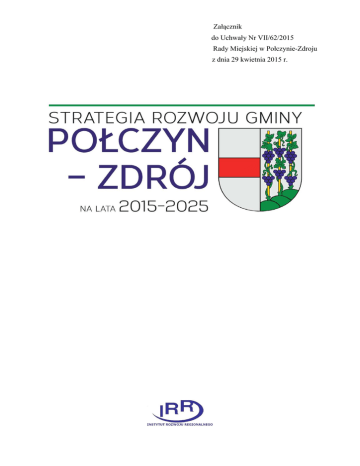 Załącznik do Uchwały Nr VII/62/2015 Rady Miejskiej w Połczynie-Zdroju z dnia 29 kwietnia 2015 r. SPIS TREŚCI WPROWADZENIE ............................................................................................................................................. 2 1. POŁOŻENIE, ŚRODOWISKO NATURALNE ................................................................................................. 8 2. RYS HISTORYCZNY ................................................................................................................................. 14 3. WSPÓŁPRACA MIĘDZYNARODOWA ...................................................................................................... 16 4. SFERA SPOŁECZNA ................................................................................................................................ 17 4.1 4.2 4.3 4.4 4.5 4.6 4.7 5. DEMOGRAFIA.............................................................................................................................................. 17 OPIEKA SPOŁECZNA ...................................................................................................................................... 20 KULTURA I DZIEDZICTWO KULTUROWE.............................................................................................................. 23 EDUKACJA .................................................................................................................................................. 32 SPORT I REKREACJA ...................................................................................................................................... 40 OCHRONA ZDROWIA .................................................................................................................................... 43 BEZPIECZEŃSTWO ........................................................................................................................................ 44 SFERA GOSPODARCZA ........................................................................................................................... 52 5.1 5.2 5.3 6. PODMIOTY GOSPODARCZE ............................................................................................................................. 52 RYNEK PRACY .............................................................................................................................................. 56 TURYSTYKA ................................................................................................................................................. 61 SFERA INFRASTRUKTURALNA ................................................................................................................ 70 6.1 6.2 6.3 6.4 6.5 6.6 6.7 6.8 6.9 6.10 INFRASTRUKTURA TRANSPORTU DROGOWEGO ................................................................................................... 70 INFRASTRUKTURA TRANSPORTU KOLEJOWEGO I AUTOBUSOWEGO.......................................................................... 71 INFRASTRUKTURA TRANSPORTU LOTNICZEGO ..................................................................................................... 72 INFRASTRUKTURA WODOCIĄGOWA I KANALIZACYJNA .......................................................................................... 72 INFRASTRUKTURA ELEKTROENERGETYCZNA ........................................................................................................ 76 INFRASTRUKTURA GAZOWA............................................................................................................................ 77 INFRASTRUKTURA CIEPŁOWNICZA .................................................................................................................... 78 INFRASTRUKTURA TELEKOMUNIKACYJNA ........................................................................................................... 79 GOSPODARKA ODPADAMI .............................................................................................................................. 80 GOSPODARKA MIESZKANIOWA ................................................................................................................... 82 7. ANALIZA STANU REALIZACJI „STRATEGII ROZWOJU MIASTA I GMINY POŁCZYN-ZDRÓJ Z 1999 ROKU (STAN PO AKTUALIZACJI)................................................................................................................................ 84 8. ANALIZA SWOT ..................................................................................................................................... 85 9. MISJA GMINY POŁCZYN-ZDRÓJ ............................................................................................................. 88 10. WIZJA GMINY POŁCZYN-ZDRÓJ ............................................................................................................. 89 11. CELE STRATEGICZNE I OPERACYJNE ....................................................................................................... 91 11.1 11.2 11.3 11.4 SFERA SPOŁECZNA ................................................................................................................................... 91 SFERA GOSPODARCZA W TYM TURYSTYKA ..................................................................................................... 94 SFERA ŚRODOWISKOWA ........................................................................................................................... 96 SFERA INFRASTRUKTURALNA...................................................................................................................... 97 12. REALIZACJA (WDRAŻANIE) STRATEGII GMINY POŁCZYN-ZDRÓJ ............................................................ 98 13. INDEKSY .............................................................................................................................................. 102 13.1 13.2 13.3 13.4 INDEKS RYSUNKÓW....................................................