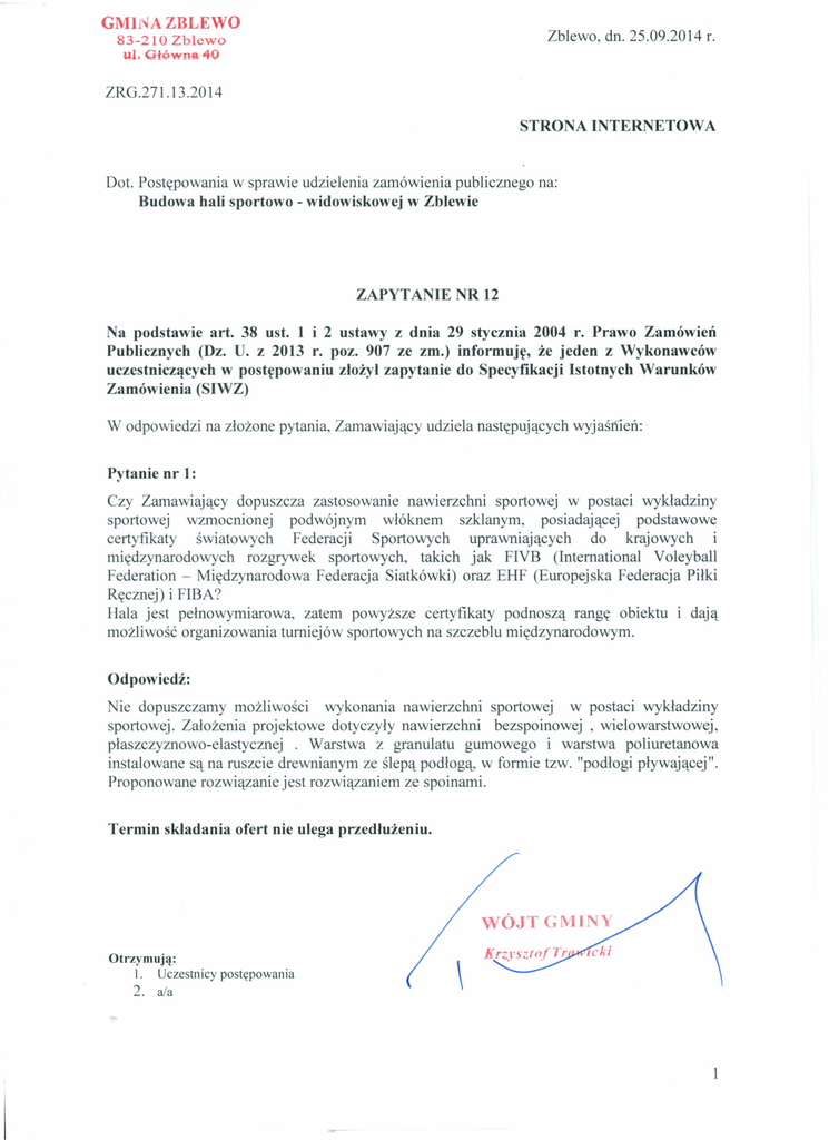 GMll~A ZBLEWO Zblewo, dn. 25.09.2014 r. 83-210 Zblewo ul. Główn 40 ZRG.271.13.2014 STRONA INTERNETOWA Dot. Postępowania w sprawie udzielenia zamówienia publicznego na: Budowa hali sportowo - widowiskowej w Zblewie ZAPYT ANIE NR 12 Na podstawie art. 38 ust. 1 i 2 ustawy z dnia 29 stycznia 2004 r. Prawo Zamówień Publicznych (Dz. U. z 2013 r. poz. 907 ze zm.) informuję, że jeden z Wykonawców uczestniczących w postępowaniu złożył zapytanie do Specyfikacji Istotnych Warunków Zamówienia (SIWZ) W odpowiedzi na złożone pytania, Zamawiający udziela następujących wyjaśnień: Pytanie nr 1: Czy Zamawiający dopuszcza zastosowanie nawierzchni sportowej w postaci wykładziny sportowej wzmocnionej podwójnym włóknem szklanym, posiadającej podstawowe certyfikaty światowych Federacji Sportowych uprawniających do krajowych i międzynarodowych rozgrywek sportowych, takich jak FIVB (International Voleyball Federation - Międzynarodowa Federacja Siatkówki) oraz EHF (Europejska Federacja Piłki Ręcznej) i FIBA? Hala jest pełnowymiarowa, zatem powyższe certyfikaty podnoszą rangę obiektu i dają możliwość organizowania turniejów sportowych na szczeblu międzynarodowym. Odpowiedź: ie dopuszczamy możliwości wykonania nawierzchni sportowej w postaci wykładziny sportowej. Założenia projektowe dotyczyły nawierzchni bezspoinowej , wielowarstwowej, płaszczyznowo-elastycznej . Warstwa z granulatu gumowego i warstwa poliuretanowa instalowane są na ruszcie drewnianym ze ślepą podłogą, w formie tzw. "podłogi pływającej". Proponowane rozwiązanie jest rozwiązaniem ze spoinami. Termin składania ofert nie ulega przedłużeniu. WÓJTGMINY Otrzymują: I. Uczestnicy postępowania 2. aJa 1