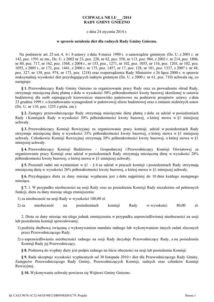 UCHWAŁA NR LI/___/2014 RADY GMINY GNIEZNO z dnia 24 stycznia 2014 r. w sprawie ustalenia diet dla radnych Rady Gminy Gniezno. Na podstawie art. 25 ust. 4, 6 i 8 ustawy z dnia 8 marca 1990 r. o samorządzie gminnym (Dz. U. z 2001 r. nr 142, poz. 1591 ze zm., Dz. U. z 2002 nr 23, poz. 220, nr 62, poz. 558, nr 113, poz. 984, z 2003 r. nr 214, poz. 1806, nr 80, poz. 717, nr 162, poz. 1568, z 2004 r., nr 153, poz., 1271, nr 102, poz. 1055, nr 116, poz. 1203, nr 102, poz. 1055, z 2005 r., nr 172, poz. 1441, z 2006 r. nr 175, poz. 1457, nr 17, poz. 128, nr 181, poz. 1337, z 2007 r. nr 48, poz. 327, nr 138, poz. 974, nr 173, poz. 1218) oraz rozporządzenia Rady Ministrów z 26 lipca 2000 r. w sprawie maksymalnej wysokości diet przysługujących radnym gminnym (Dz. U. z 2000 r. nr 61, poz. 710) uchwala się, co następuje: § 1. Przewodniczący Rady Gminy Gniezno za organizowanie pracy Rady oraz za prowadzenie obrad Rady, otrzymuje miesięczną dietę płatną z dołu w wysokości 50% półtorakrotności kwoty bazowej określonej w ustawie budżetowej dla osób zajmujących kierownicze stanowisko państwowe na podstawie przepisów ustawy z dnia 23 grudnia 1999 r. o kształtowaniu wynagrodzeń w państwowej sferze budżetowej oraz o zmianie niektórych ustaw (Dz. U. nr 110, poz. 1255 z późn. zm.) § 2. Zastępcy przewodniczącego Rady otrzymują miesięcznie dietę płatną z dołu za udział w posiedzeniach Rady i Komisjach Rady w wysokości 30% półtorakrotności kwoty bazowej, o której mowa w §1 niniejszej uchwały. § 3. Przewodniczący Komisji Rewizyjnej za organizowanie pracy komisji, udział w posiedzeniach Rady otrzymuje miesięczną dietę w wysokości 35% półtorakrotności kwoty bazowej, o której mowa w §1 niniejszej uchwały. Członkowie Komisji Rewizyjnej otrzymują 30% półtorakrotności kwoty bazowej, o której mowa w §1 niniejszej uchwały. § 4. Przewodniczący Komisji Budżetowo – Gospodarczej i Przewodniczący Komisji Oświatowej za organizowanie pracy Komisji oraz udział w posiedzeniach Rady otrzymują miesięczną dietę w wysokości 28% półtorakrotności kwoty bazowej, o której mowa w §1 niniejszej uchwały. § 5. Pozostali radni nie wymienieni w §1 - § 4 za udział w pracach komisji i posiedzeniach Rady otrzymują miesięczną dietę w wysokości 26% półtorakrotności kwoty bazowej, o której mowa w §1 niniejszej uchwały. § 6. Przysługująca dieta za dany miesiąc wypłacana jest z dołu najpóźniej do 10 dnia każdego następnego miesiąca. § 7. 1. W przypadku nieobecności na sesji Rady oraz na posiedzeniu Komisji Rady niezależnie od pełnionych funkcji, dieta za dany miesiąc ulega zmniejszeniu: 1) za nieobecność na sesji Rady w wysokości 100,00 zł. 2) za nieobecność na posiedzeniach komisji Rady w wysokości 80,00 zł. 2. Dieta za dany miesiąc nie ulega jednak zmniejszeniu w przypadku usprawiedliwionej nieobecności na sesji lub posiedzeniu komisji spowodowanej: 1) podróżą służbową związaną z wykonywaniem mandatu radnego lub wykonywaniem innych zadań zleconych przez Przewodniczącego Rady. 2) o usprawiedliwieniu nieobecności radnego na sesji Rady decyduje Przewodniczący Rady, a na posiedzeniu Komisji Rady jej Przewodniczący. § 8. Podstawą do wypłaty diety jest podpis radnego na liście obecności na sesji lub posiedzeniu Komisji. § 9. Rada akceptuje wysokości wypłacanych od 30 listopada 2010 r diet dla Przewodniczącego Rady Gminy, Zastępców Przewodniczącego Rady Gminy, Przewodniczących Komisji, radnych oraz członków Komisji Rewizyjnej. § 10. Wykonywanie uchwały powierza się Wójtowi Gminy Gniezno. Id: CACC9676-1C12-441D-98F2-DB959ED81C79. Projekt Strona 1 § 11. Traci moc uchwała Rady Gminy Gniezno nr I/3/2010 z dnia 30 listopada 2010 r. w sprawie ustalenia diet dla radnych Rady Gminy Gniezno. § 12. Uchwała wchodzi w życie z dniem podjęcia. Id: CACC9676-1C12-441D-98F2-DB959ED81C79. Projekt Strona 2 Uzasadnienie Zgodnie z zapisem art. 25 ust. 4-8 ustawy z dnia 8 marca 1990 r. o samorządzie gminnym (Dz. U. z 2001 r. nr 142, poz. 1591 ze zm.) Rada Gminy ustala zasady, według których radnemu przysługują diety. W zapisach dotychczas obowiązującej uchwały Rady Gminy na skutek błędu pisarskiego pomijającego słowo ”półtorakrotność„ wypaczeniu uległa idea i sens określania wysokości diety radnego. Wysokość diety przysługującej radnemu w ciągu miesiąca nie może przekraczać łącznie półtorakrotności kwoty bazowej, określonej w ustawie budżetowej dla osób zajmujących stanowiska państwowe na podstawie przepisów ustawy z dnia 23.12.1999 r. Dz. U. nr 110, poz. 1255 ze zm. oraz przy uwzględnianiu Rozporządzenia Rady Ministrów z dnia 26 lipca 2000 r. w sprawie maksymalnej wysokości diet przysługujących radnemu Gminy. Pominięcie w treści uchwały słowa „półtorakrotność” wpływa w sposób niezgodny z intencją uchwałodawcy na wysokość diet jakie przysługują radnym, bowiem nie było intencją podejmujących uchwałę obniżenie przysługujących radnym diet lecz pozostawienie ich na co najmniej dotychczasowym poziomie. Dodać należy, że radni w momencie podejmowania uchwały znali wysokość przysługującej im diety wyliczonej w oparciu o „maksymalną dietę radnego” stanowiącą procent półtorakrotności kwoty bazowej określanej w ustawie budżetowej i wobec tego z pewnością nie podjęliby uchwały, która w sposób zasadniczy obniża wysokość przysługujących im diet. Stwierdzić należy, że diety radnych obliczane i wypłacane były zgodnie z duchem uchwały oraz obowiązującymi przepisami prawa. W powyższym stanie rzeczy podjęcie uchwały jest uzasadnione. Id: CACC9676-1C12-441D-98F2-DB959ED81C79. Projekt Strona 1
