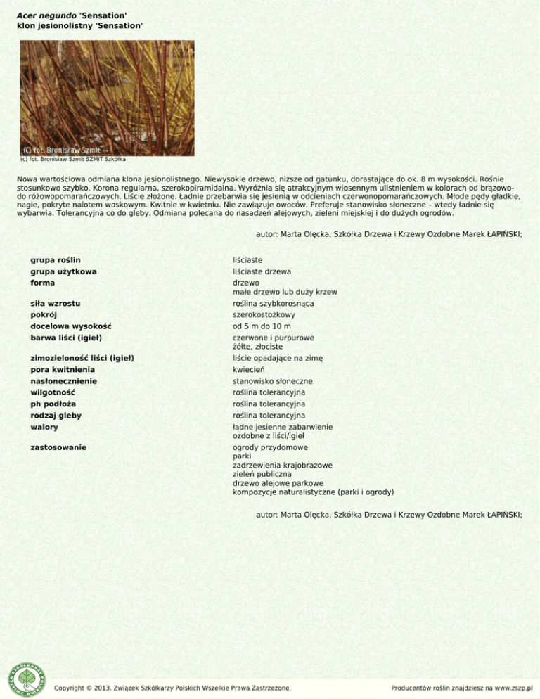Acer negundo 'Sensation' klon jesionolistny 'Sensation' (c) fot. Bronisław Szmit SZMIT Szkółka Nowa wartościowa odmiana klona jesionolistnego. Niewysokie drzewo, niższe od gatunku, dorastające do ok. 8 m wysokości. Rośnie stosunkowo szybko. Korona regularna, szerokopiramidalna. Wyróżnia się atrakcyjnym wiosennym ulistnieniem w kolorach od brązowodo różowopomarańczowych. Liście złożone. Ładnie przebarwia się jesienią w odcieniach czerwonopomarańczowych. Młode pędy gładkie, nagie, pokryte nalotem woskowym. Kwitnie w kwietniu. Nie zawiązuje owoców. Preferuje stanowisko słoneczne – wtedy ładnie się wybarwia. Tolerancyjna co do gleby. Odmiana polecana do nasadzeń alejowych, zieleni miejskiej i do dużych ogrodów. autor: Marta Olęcka, Szkółka Drzewa i Krzewy Ozdobne Marek ŁAPIŃSKI; grupa roślin liściaste grupa użytkowa liściaste drzewa forma drzewo małe drzewo lub duży krzew siła wzrostu roślina szybkorosnąca pokrój szerokostożkowy docelowa wysokość od 5 m do 10 m barwa liści (igieł) czerwone i purpurowe żółte, złociste zimozieloność liści (igieł) liście opadające na zimę pora kwitnienia kwiecień nasłonecznienie stanowisko słoneczne wilgotność roślina tolerancyjna ph podłoża roślina tolerancyjna rodzaj gleby roślina tolerancyjna walory ładne jesienne zabarwienie ozdobne z liści/igieł zastosowanie ogrody przydomowe parki zadrzewienia krajobrazowe zieleń publiczna drzewo alejowe parkowe kompozycje naturalistyczne (parki i ogrody) autor: Marta Olęcka, Szkółka Drzewa i Krzewy Ozdobne Marek ŁAPIŃSKI; Copyright © 2013. Związek Szkółkarzy Polskich Wszelkie Prawa Zastrzeżone. Producentów roślin znajdziesz na www.zszp.pl