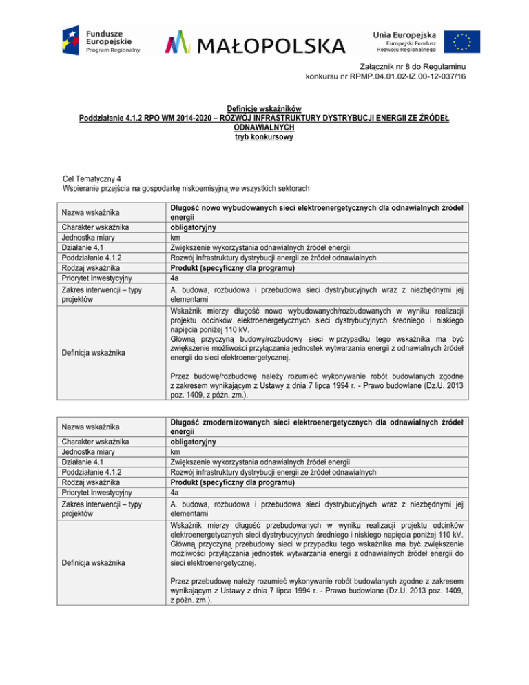 Załącznik nr 8 do Regulaminu konkursu nr RPMP.04.01.02-IZ.00-12-037/16 Definicje wskaźników Poddziałanie 4.1.2 RPO WM 2014-2020 – ROZWÓJ INFRASTRUKTURY DYSTRYBUCJI ENERGII ZE ŹRÓDEŁ ODNAWIALNYCH tryb konkursowy Cel Tematyczny 4 Wspieranie przejścia na gospodarkę niskoemisyjną we wszystkich sektorach Nazwa wskaźnika Charakter wskaźnika Jednostka miary Działanie 4.1 Poddziałanie 4.1.2 Rodzaj wskaźnika Priorytet Inwestycyjny Zakres interwencji – typy projektów Definicja wskaźnika Długość nowo wybudowanych sieci elektroenergetycznych dla odnawialnych źródeł energii obligatoryjny km Zwiększenie wykorzystania odnawialnych źródeł energii Rozwój infrastruktury dystrybucji energii ze źródeł odnawialnych Produkt (specyficzny dla programu) 4a A. budowa, rozbudowa i przebudowa sieci dystrybucyjnych wraz z niezbędnymi jej elementami Wskaźnik mierzy długość nowo wybudowanych/rozbudowanych w wyniku realizacji projektu odcinków elektroenergetycznych sieci dystrybucyjnych średniego i niskiego napięcia poniżej 110 kV. Główną przyczyną budowy/rozbudowy sieci w przypadku tego wskaźnika ma być zwiększenie możliwości przyłączania jednostek wytwarzania energii z odnawialnych źródeł energii do sieci elektroenergetycznej. Przez budowę/rozbudowę należy rozumieć wykonywanie robót budowlanych zgodne z zakresem wynikającym z Ustawy z dnia 7 lipca 1994 r. - Prawo budowlane (Dz.U. 2013 poz. 1409, z późn. zm.). Nazwa wskaźnika Charakter wskaźnika Jednostka miary Działanie 4.1 Poddziałanie 4.1.2 Rodzaj wskaźnika Priorytet Inwestycyjny Zakres interwencji – typy projektów Definicja wskaźnika Długość zmodernizowanych sieci elektroenergetycznych dla odnawialnych źródeł energii obligatoryjny km Zwiększenie wykorzystania odnawialnych źródeł energii Rozwój infrastruktury dystrybucji energii ze źródeł odnawialnych Produkt (specyficzny dla programu) 4a A. budowa, rozbudowa i przebudowa sieci dystrybucyjnych wraz z niezbędnymi jej elementami Wskaźnik mierzy długość przebudowanych w wyniku realizacji projektu odcinków elektroenergetycznych sieci dystrybucyjnych średniego i niskiego napięcia poniżej 110 kV. Główną przyczyną przebudowy sieci w przypadku tego wskaźnika ma być zwiększenie możliwości przyłączania jednostek wytwarzania energii z odnawialnych źródeł energii do sieci elektroenergetycznej. Przez przebudowę należy rozumieć wykonywanie robót budowlanych zgodne z zakresem wynikającym z Ustawy z dnia 7 lipca 1994 r. - Prawo budowlane (Dz.U. 2013 poz. 1409, z późn. zm.). Nazwa wskaźnika Charakter wskaźnika Jednostka miary Działanie 4.1 Poddziałanie 4.1.2 Rodzaj wskaźnika Priorytet Inwestycyjny Zakres interwencji – typy projektów Definicja wskaźnika Nazwa wskaźnika Charakter wskaźnika Jednostka miary Działanie 4.1 Poddziałanie 4.1.2 Rodzaj wskaźnika Priorytet Inwestycyjny Zakres interwencji – typy projektów Definicja wskaźnika Nazwa wskaźnika Charakter wskaźnika Jednostka miary Działanie 4.1 Poddziałanie 4.1.2 Rodzaj wskaźnika Priorytet Inwestycyjny Zakres interwencji – typy projektów Definicja wskaźnika Długość nowo wybudowanych lub zmodernizowanych sieci elektroenergetycznych dla odnawialnych źródeł energii obligatoryjny km Zwiększenie wykorzystania odnawialnych źródeł energii Rozwój infrastruktury dystrybucji energii ze źródeł odnawialnych Produkt 4a A. budowa, rozbudowa i przebudowa sieci dystrybucyjnych wraz z niezbędnymi jej elementami Wskaźnik jest sumą wskaźników „Długość nowo wybudowanych sieci elektroenergetycznych dla odnawialnych źródeł energii” i "Długość zmodernizowanych sieci elektroenergetycznych dla odnawialnych źródeł energii”. Dodatkowa zdolność przyłączania źródeł odnawialnych do sieci elektroenergetycznej obligatoryjny MW Zwiększenie wykorzystania odnawialnych źródeł energii Rozwój infrastruktury dystrybucji energii ze źródeł odnawialnych Rezultat bezpośredni (specyficzny dla programu) 4a A. budowa, rozbudowa i przebudowa sieci dystrybucyjnych wraz z niezbędnymi jej elementami Wskaźnik mierzy wzrost możliwości przyłączania do wybudowanej/rozbudowanej/przebudowanej w wyniku realizacji projektu sieci dystrybucyjnej jednostek wytwarzania energii z odnawialnych źródeł. Przewidywana liczba jednostek wytwarzania energii z OZE przyłączonych do sieci dystrybucyjnej obligatoryjny szt. Zwiększenie wykorzystania odnawialnych źródeł energii Rozwój infrastruktury dystrybucji energii ze źródeł odnawialnych Rezultat bezpośredni (specyficzny dla programu) 4a A. budowa, rozbudowa i przebudowa sieci dystrybucyjnych wraz z niezbędnymi jej elementami W ramach wskaźnika należy wskazać liczbę planowanych i istniejących jednostek wytwarzania energii z odnawialnych źródeł energii, które w wyniku realizacji projektu uzyskają możliwość przyłączenia do wybudowanej/rozbudowanej/przebudowanej sieci dystrybucyjnej. W ramach wskaźnika należy podać liczbę jednostek wytwarzania energii z OZE, które nie zostały jeszcze przyłączone do sieci dystrybucyjnej. Definicje zostały opracowane na podstawie Wspólnej Listy Wskaźników Kluczowych stanowiącej załącznik do Wytycznych w zakresie monitorowania postępu rzeczowego realizacji programów operacyjnych na lata 2014-2020 z dnia 22 kwietnia 2015 r. (i dokumentów do których zawiera odwołania, np. wytycznych horyzontalnych), aktów prawnych oraz, w odniesieniu do wskaźników EFRR, Katalogu definicji dla Celów Tematycznych finansowanych z Europejskiego Funduszu Rozwoju Regionalnego, Funduszu Spójności oraz dla pomocy technicznej (wersja dokumentu z dnia 7 marca 2014 r.). Wszelkie zmiany ww. dokumentów będą skutkowały koniecznością stosowania przez beneficjentów aktualnych definicji (ujętych w obowiązujących wersjach dokumentów).
