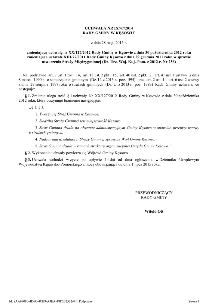 UCHWAŁA NR IX/47/2014 RADY GMINY W KĘSOWIE z dnia 28 maja 2015 r. zmieniającą uchwałę nr XX/127/2012 Rady Gminy w Kęsowie z dnia 30 października 2012 roku zmieniającą uchwałę XIII/77/2011 Rady Gminy Kęsowo z dnia 29 grudnia 2011 roku w sprawie utworzenia Straży Międzygminnej (Dz. Urz. Woj. Kuj.-Pom. z 2012 r. Nr 236) Na podstawie art. 7 ust. 1 pkt. 14, art. 18 ust. 2 pkt. 15, art. 40 ust. 2 pkt. 2, art. 41 ust. 1 ustawy z dnia 8 marca 1990 r. o samorządzie gminnym (Dz. U. z 2013 r. poz. 594) oraz art. 2 ust. 1 i art. 6 ust. 2 ustawy z dnia 29 sierpnia 1997 roku o strażach gminnych (Dz. U. z 2013 r. poz. 1383) Rada Gminy uchwala, co następuje: § 1. Zmianie ulega treść § 1 uchwały Nr XX/127/2012 Rady Gminy w Kęsowie z dnia 30 października 2012 roku, który otrzymuje brzmienie następujące: „§ 1. § 1. 1. Tworzy się Straż Gminną w Kęsowie. 2. Siedzibą Straży Gminnej jest miejscowość Kęsowo. 3. Straż Gminna działa na obszarze administracyjnym Gminy Kęsowo w oparciuo przepisy ustawy o strażach gminnych. 4. Nadzór nad działalności Straży Gminnej sprawuje Wójt Gminy Kęsowo. 5. Straż Gminna działa w ramach struktury organizacyjnej Urzędu Gminy Kęsowo.”. § 2. Wykonanie uchwały powierza się Wójtowi Gminy Kęsowo. § 3. Uchwała wchodzi w życie po upływie 14 dni od dnia ogłoszenia w Dzienniku Urzędowym Województwa Kujawsko-Pomorskiego z mocą obowiązującą od dnia 1 lipca 2015 roku. PRZEWODNICZĄCY RADY GMINY Witold Ott Id: 8AA99080-4D6C-4CB9-A3EA-48F6B252244F. Podpisany Strona 1 Uzasadnienie Na podstawie Uchwały Nr XI/56/2011 Rady Gminy w Kęsowie z dnia 4 października 2011 r. w sprawie zawarcia porozumienia międzygminnego pomiędzy Gminą Kęsowo oraz Gminą Gostycyn w sprawie utworzenia Straży Międzygminnej oraz Uchwały Nr IX/61/11 Rady Gminy Gostycyn z dnia 22 września 2011 r. w sprawie zawarcia porozumienia międzygminnego pomiędzy Gminą Kęsowo oraz Gminą Gostycyn w sprawie utworzenia Straży Międzygminnej i Uchwały Nr XII/91/11 Rady Gminy Gostycyn z dnia 15 grudnia 2011 r. zmieniająca uchwałę w sprawie zawarcia porozumienia międzygminnego pomiędzy Gminą Kęsowo oraz Gminą Gostycyn w sprawie utworzenia Straży Międzygminnej, po zasięgnięciu opinii Komendanta Wojewódzkiego Policji w Bydgoszczy strony w dniu 28 grudnia 2011 r. zawarły porozumienie w sprawie utworzenia Straży Międzygminnej i powierzenia przez Gminę Gostycyn Gminie Kęsowo od dnia utworzenia Straży Międzygminnej wykonywanie zadań własnych w zakresie porządku publicznego, tj. zadania określonego w art. 7 ust. 1 pkt. 14 ustawy z dnia 8 marca 1990 r. o samorządzie gminnym (Dz. U. 1990 nr 16 poz. 95 ze zm.) oraz art. 2 ust. 1 i 2, art. 3, art. 6 ust. 1 i art. 8 ust. 2 ustawy z dnia 29 sierpnia 1997 roku o strażach gminnych (Dz. U. 1997 nr 123 poz. 779 ze zm.) Porozumienie zostało zawarte na czas nieokreślony z możliwością wypowiedzenia go przez każdą ze stron z zachowaniem 6 – miesięcznego okresu wypowiedzenia ze skutkiem na koniec roku kalendarzowego. Rada Gminy Kęsowo wyraziła wolę wypowiedzenia przedmiotowego porozumienia i podjęła uchwałę nr II/7/2014 z dnia 11 grudnia 2014 r. w sprawie wyrażenia zgody na rozwiązanie porozumienia międzygminnego zawartego pomiędzy Gminą Kęsowo oraz Gminą Gostycyn. Z dniem 1 lipca 2015 r. porozumienie międzygminne zawarte pomiędzy Gminą Kęsowo oraz Gminą Gostycyn ulega rozwiązaniu. Straż Gminna w Kęsowie przestaje działać na obszarze administracyjnym Gminy Gostycyn. Wobec zatem zmiany obszaru administracyjnego działania Straży, Rada Gminy Kęsowo podejmuje uchwałę zmieniającą uchwałę nr XX/127/2012 Rady Gminy w Kęsowie z dnia 30 października 2012 roku zmieniającą uchwałę XIII/77/2011 Rady Gminy Kęsowo z dnia 29 grudnia 2011 roku w sprawie utworzenia Straży Międzygminnej (Dz. Urz. Woj. Kuj.-Pom. z 2012 r. Nr 236) PRZEWODNICZĄCY RADY GMINY Witold Ott Id: 8AA99080-4D6C-4CB9-A3EA-48F6B252244F. Podpisany Strona 1