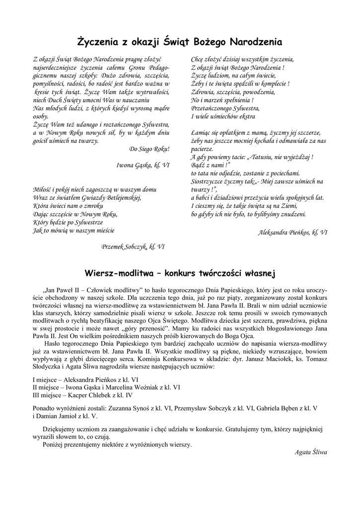 Życzenia z okazji Świąt Bożego Narodzenia Z okazji Świąt Bożego Narodzenia pragnę złożyć najserdeczniejsze życzenia całemu Gronu Pedagogicznemu naszej szkoły: Dużo zdrowia, szczęścia, pomyślności, radości, bo radość jest bardzo ważna w kresie tych świąt. Życzę Wam także wytrwałości, niech Duch Święty umocni Was w nauczaniu Nas młodych ludzi, z których kiedyś wyrosną mądre osoby. Życzę Wam też udanego i roztańczonego Sylwestra, a w Nowym Roku nowych sił, by w każdym dniu gościł uśmiech na twarzy. Do Siego Roku! Iwona Gąska, kl. VI Miłość i pokój niech zagoszczą w waszym domu Wraz ze światłem Gwiazdy Betlejemskiej, Która świeci nam o zmroku Dając szczęście w Nowym Roku, Który będzie po Sylwestrze Jak to mówią w naszym mieście Chcę złożyć dzisiaj wszystkim życzenia, Z okazji świąt Bożego Narodzenia ! Życzę ludziom, na całym świecie, Żeby i te święta spędzili w komplecie ! Zdrowia, szczęścia, powodzenia, No i marzeń spełnienia ! Przetańczonego Sylwestra, I wiele uśmiechów ekstra Łamiąc się opłatkiem z mamą, życzmy jej szczerze, żeby nas jeszcze mocniej kochała i odmawiała za nas pacierze. A gdy powiemy tacie: „-Tatusiu, nie wyjeżdżaj ! Bądź z nami !” to tata nie odjedzie, zostanie z pociechami. Siostrzyczce życzmy tak:„- Miej zawsze uśmiech na twarzy !”, a babci i dziadziowi przeżycia wielu spokojnych lat. I cieszmy się, że takie święta są na Ziemi, bo gdyby ich nie było, to bylibyśmy znudzeni. Aleksandra Pieńkos, kl. VI Przemek Sobczyk, kl. VI Wiersz-modlitwa – konkurs twórczości własnej „Jan Paweł II – Człowiek modlitwy” to hasło tegorocznego Dnia Papieskiego, który jest co roku uroczyście obchodzony w naszej szkole. Dla uczczenia tego dnia, już po raz piąty, zorganizowany został konkurs twórczości własnej na wiersz-modlitwę za wstawiennictwem bł. Jana Pawła II. Brali w nim udział uczniowie klas starszych, którzy samodzielnie pisali wiersz w szkole. Jeszcze rok temu prosili w swoich rymowanych modlitwach o rychłą beatyfikację naszego Ojca Świętego. Modlitwa dziecka jest szczera, prawdziwa, piękna w swej prostocie i może nawet „góry przenosić”. Mamy ku radości nas wszystkich błogosławionego Jana Pawła II. Jest On wielkim pośrednikiem naszych próśb kierowanych do Boga Ojca. Hasło tegorocznego Dnia Papieskiego tym bardziej zachęcało uczniów do napisania wiersza-modlitwy już za wstawiennictwem bł. Jana Pawła II. Wszystkie modlitwy są piękne, niekiedy wzruszające, bowiem wypływają z głębi dziecięcego serca. Komisja Konkursowa w składzie: dyr. Janusz Maciołek, ks. Tomasz Słodyczka i Agata Śliwa nagrodziła wiersze następujących uczniów: I miejsce – Aleksandra Pieńkos z kl. VI II miejsce – Iwona Gąska i Marcelina Woźniak z kl. VI III miejsce – Kacper Chlebek z kl. IV Ponadto wyróżnieni zostali: Zuzanna Synoś z kl. VI, Przemysław Sobczyk z kl. VI, Gabriela Bęben z kl. V i Damian Jamioł z kl. V. Dziękujemy uczniom za zaangażowanie i chęć udziału w konkursie. Gratulujemy tym, którzy najpiękniej wyrazili słowem to, co czują. Poniżej prezentujemy niektóre z wyróżnionych wierszy. Agata Śliwa Tchnienie do nieba Błogosławiony Janie Pawle II, Matko Boża, i wszyscy Święci! Módlcie się o zdrowie i życie mojego kolegi z klasy-Gilberta, aby został cudownie uzdrowiony i wreszcie mógł chodzić i myśleć jak inni. Proszę! Sprawcie, żeby Pan Bóg wziął go w Swe cudowne ramiona, obdarował go Łaską Bożą i zawsze pamiętał, że Gilbert i wiele innych dzieci pragnie niewiele, aby być szczęśliwym. Amen. /Aleksandra Pieńkos/ Błogosławiony Janie Pawle II Spraw, aby kościół wśród wszystkich narodów ziemi mógł owocnie spełniać swe posłannictwo w rodzinach i poprzez rodziny. Módl się za ludzi, którzy zeszli na złą drogę w życiu i spraw, aby powrócili do swojego Ojca. By czerpali przykład z ludzi godnych podziwu, dobrych i uczciwych. By nie byli wpatrzeni w zło, które nas otacza. Ty, który jesteś przykładem człowiekamodlitwy, jesteś prawdą i miłością módl się za nami! /Marcelina Woźniak/ Ojcze Święty, proszę Cię, pomódl się w niebie o to, żeby moi dziadkowie żyli jak najdłużej, a zmarły dziadziu i wujek niech otrzymają spokój wieczny. I żebym robił postępy w nauce, a moi rodzice byli ze mnie dumni i żeby mieli uśmiech na twarzy. Proszę, by moi bliscy, koledzy i koleżanki żyli dobrze i jak najdłużej. Amen. /Kacper Chlebek/ Panie Boże! Klękam przed Twoim Obliczem, rozmyślam, o co Ciebie mogę najbardziej prosić. Boże mój, Boże, proszę Cię o rozszerzenie wiary chrześcijańskiej, abyśmy w niebie mogli cieszyć się razem z Tobą, z Twoimi Świętymi. Gorąco się modlę do Ciebie, wysłuchaj moich próśb i dopomóż nam bronić się na tym świecie przed złem, przemocą, abyśmy wierzyli w Ciebie. Proszę Cię o to przez wstawiennictwo bł. Jana Pawła II. /Iwona Gąska/ Pomagajmy wszystkim ludziom W ten świąteczny czas Niechaj uśmiech na twarzach zagości I nie wstydźmy się tego Bo Jezus się nam narodził Więc z pokłonem w nocy o północy Stańmy przy Dzieciątku Nowy Rok u wszystkich szczęśliwie zawita Korzystajmy z naszego pięknego życia Spotkajmy się z przyjaciółmi I razem poświętujmy /Daniel Maciołek, kl. VI/