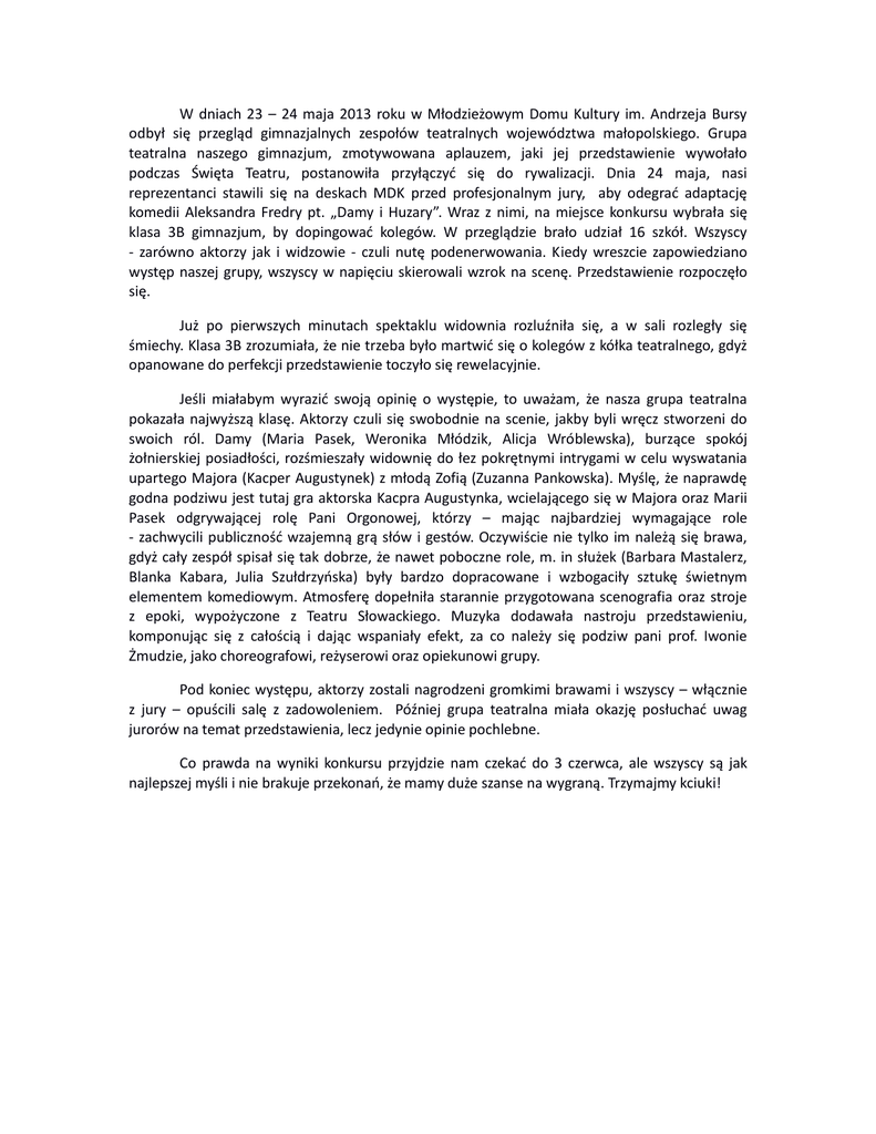 W dniach 23 – 24 maja 2013 roku w Młodzieżowym Domu Kultury im. Andrzeja Bursy odbył się przegląd gimnazjalnych zespołów teatralnych województwa małopolskiego. Grupa teatralna naszego gimnazjum, zmotywowana aplauzem, jaki jej przedstawienie wywołało podczas Święta Teatru, postanowiła przyłączyd się do rywalizacji. Dnia 24 maja, nasi reprezentanci stawili się na deskach MDK przed profesjonalnym jury, aby odegrad adaptację komedii Aleksandra Fredry pt. „Damy i Huzary”. Wraz z nimi, na miejsce konkursu wybrała się klasa 3B gimnazjum, by dopingowad kolegów. W przeglądzie brało udział 16 szkół. Wszyscy - zarówno aktorzy jak i widzowie - czuli nutę podenerwowania. Kiedy wreszcie zapowiedziano występ naszej grupy, wszyscy w napięciu skierowali wzrok na scenę. Przedstawienie rozpoczęło się. Już po pierwszych minutach spektaklu widownia rozluźniła się, a w sali rozległy się śmiechy. Klasa 3B zrozumiała, że nie trzeba było martwid się o kolegów z kółka teatralnego, gdyż opanowane do perfekcji przedstawienie toczyło się rewelacyjnie. Jeśli miałabym wyrazid swoją opinię o występie, to uważam, że nasza grupa teatralna pokazała najwyższą klasę. Aktorzy czuli się swobodnie na scenie, jakby byli wręcz stworzeni do swoich ról. Damy (Maria Pasek, Weronika Młódzik, Alicja Wróblewska), burzące spokój żołnierskiej posiadłości, rozśmieszały widownię do łez pokrętnymi intrygami w celu wyswatania upartego Majora (Kacper Augustynek) z młodą Zofią (Zuzanna Pankowska). Myślę, że naprawdę godna podziwu jest tutaj gra aktorska Kacpra Augustynka, wcielającego się w Majora oraz Marii Pasek odgrywającej rolę Pani Orgonowej, którzy – mając najbardziej wymagające role - zachwycili publicznośd wzajemną grą słów i gestów. Oczywiście nie tylko im należą się brawa, gdyż cały zespół spisał się tak dobrze, że nawet poboczne role, m. in służek (Barbara Mastalerz, Blanka Kabara, Julia Szułdrzyoska) były bardzo dopracowane i wzbogaciły sztukę świetnym elementem komediowym. Atmosferę dopełniła starannie przygotowana scenografia oraz stroje z epoki, wypożyczone z Teatru Słowackiego. Muzyka dodawała nastroju przedstawieniu, komponując się z całością i dając wspaniały efekt, za co należy się podziw pani prof. Iwonie Żmudzie, jako choreografowi, reżyserowi oraz opiekunowi grupy. Pod koniec występu, aktorzy zostali nagrodzeni gromkimi brawami i wszyscy – włącznie z jury – opuścili salę z zadowoleniem. Później grupa teatralna miała okazję posłuchad uwag jurorów na temat przedstawienia, lecz jedynie opinie pochlebne. Co prawda na wyniki konkursu przyjdzie nam czekad do 3 czerwca, ale wszyscy są jak najlepszej myśli i nie brakuje przekonao, że mamy duże szanse na wygraną. Trzymajmy kciuki!